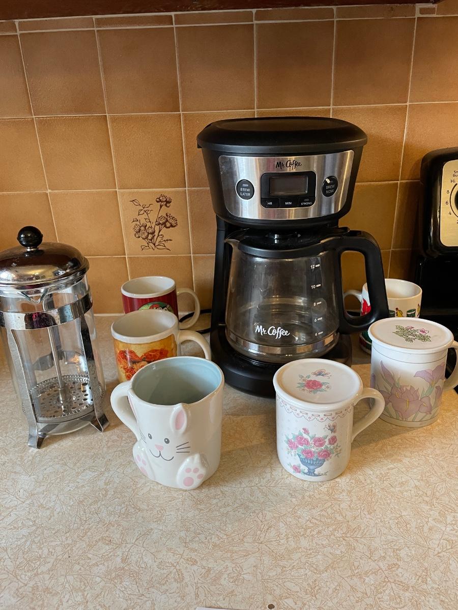 MR. COFFEE 12 CUP COFFEE BREWER, MUGS AND BODUM FRENCH COFFEE PRESS
