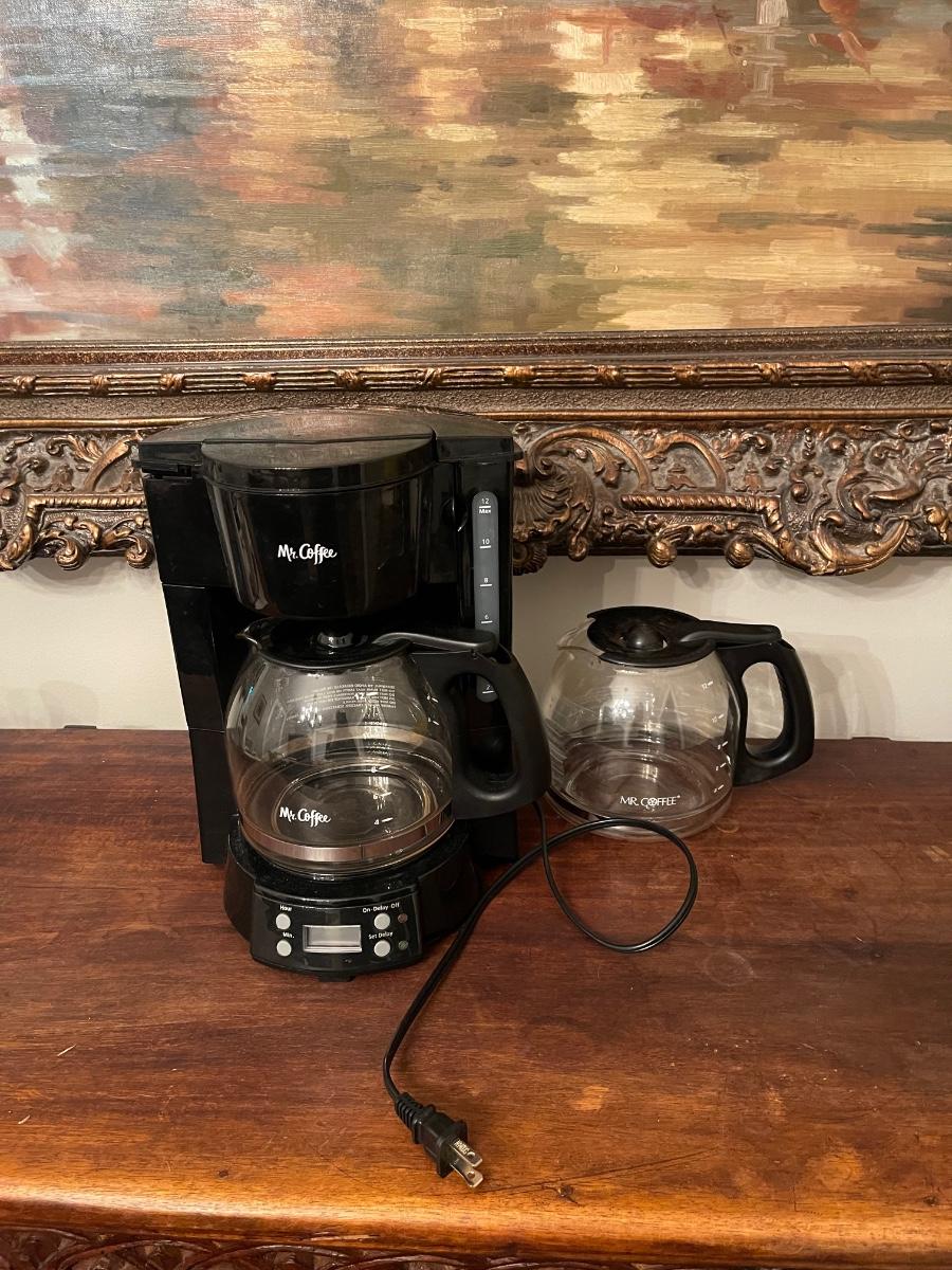 Mr. Coffee 12 Cup Coffee Maker. This was only used twice when my parents came to town. They like to make a pot of coffee at night. They have relocated and I hope someone will enjoy it. It comes with an extra carafe.