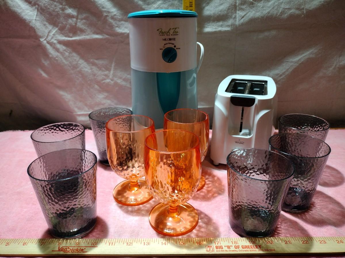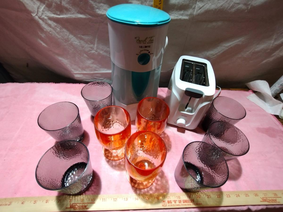 MR COFFEE FRESH TEA, 2 SLICE TOASTER AND PLASTIC CUPS