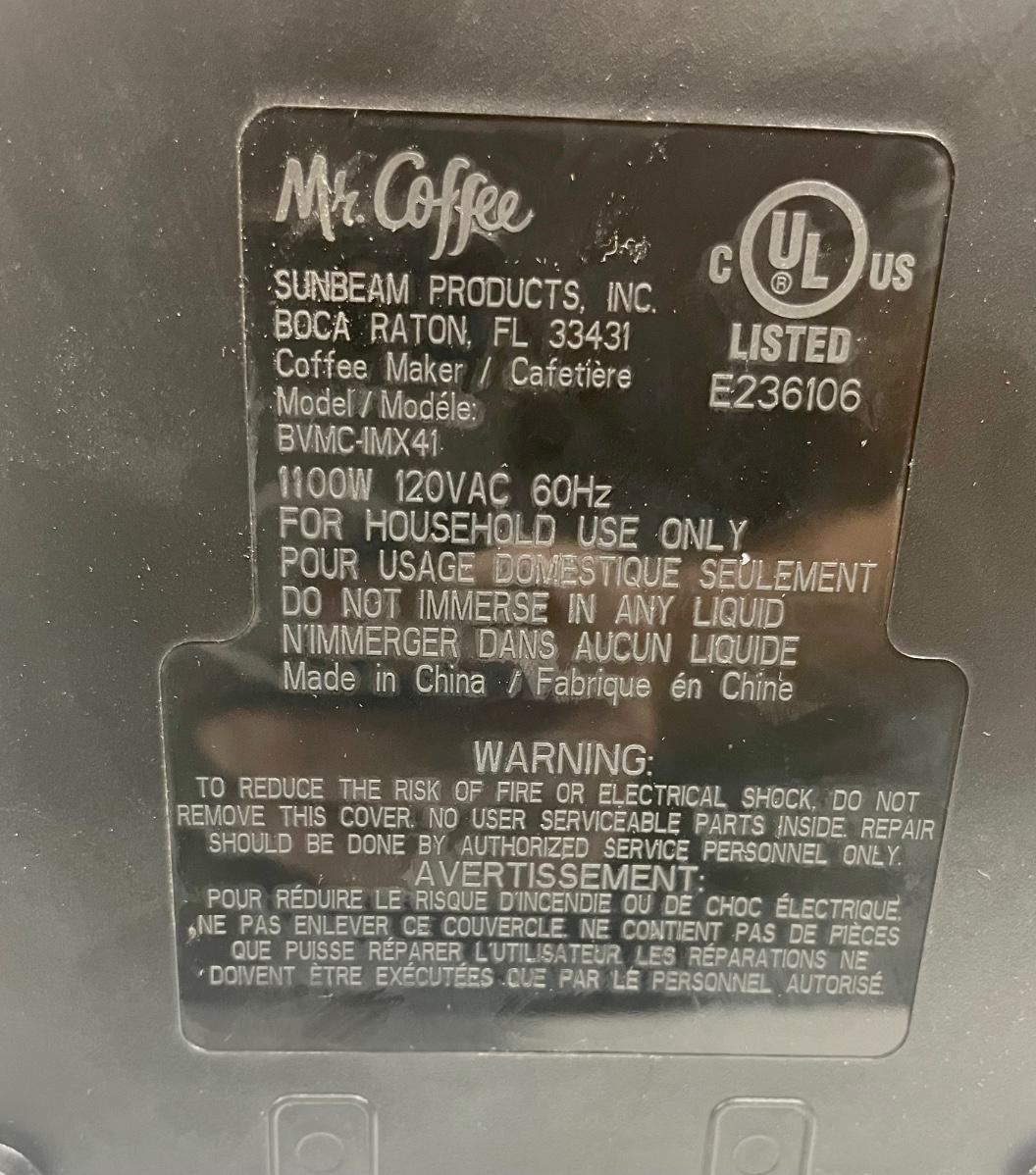 Mr. Coffee Programmable Coffee Pot, model BVMC-IMX41. Made by Sunbeam. Includes glass coffee pot. Tested, all functions work, warmer plate gets hot. Very clean inside.