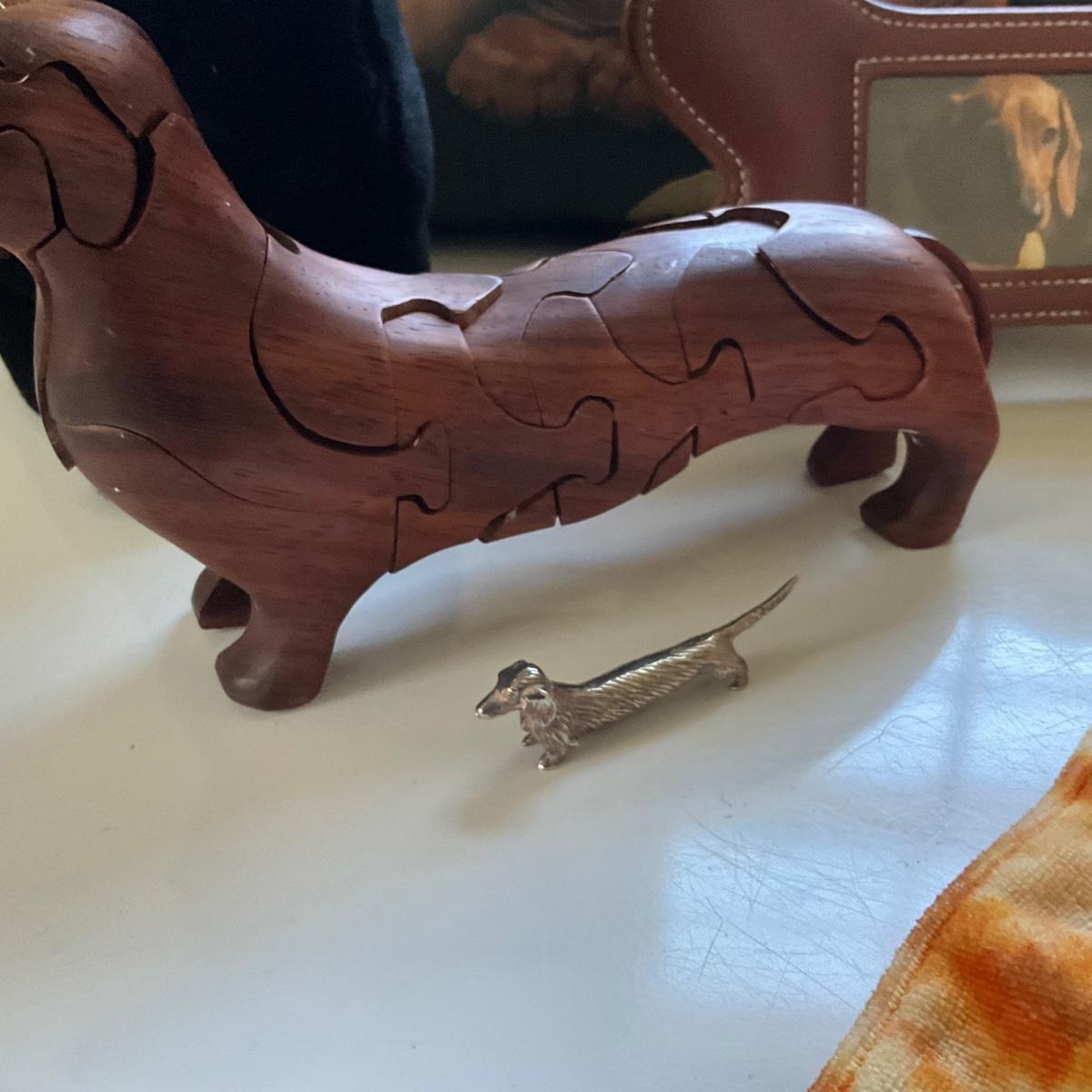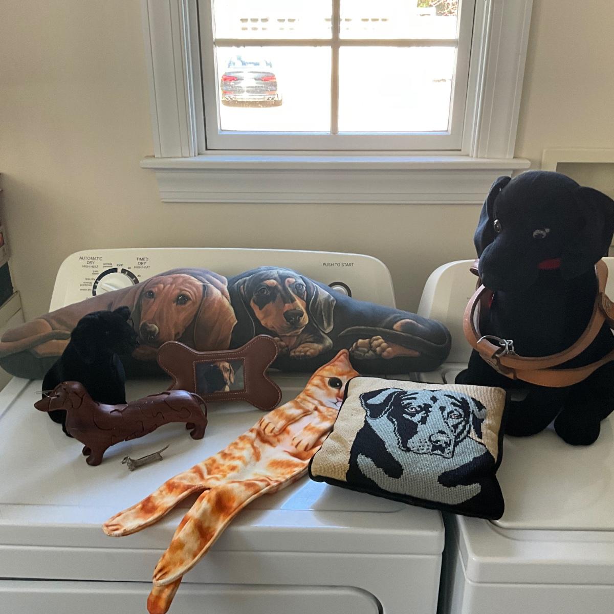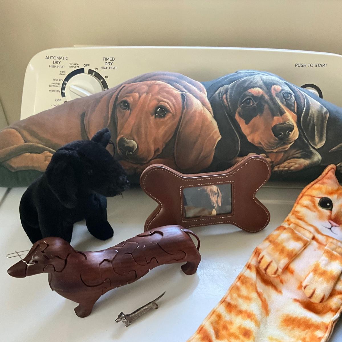 This lot features a delightful assortment of plush dachshund pillows, dachshund puzzle figurine, cat-shaped pillow, dog portrait pillow, plush black labrador toy, and small bone-shaped picture frame