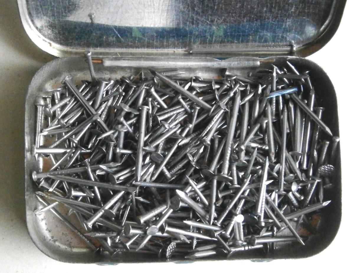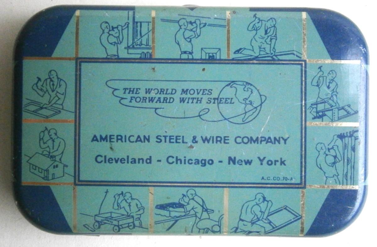 Mrs. McGregors Family Nail Box Tin, vintage, 3 1/2 x 2 1/2 in., lithographed tin, with original contents.