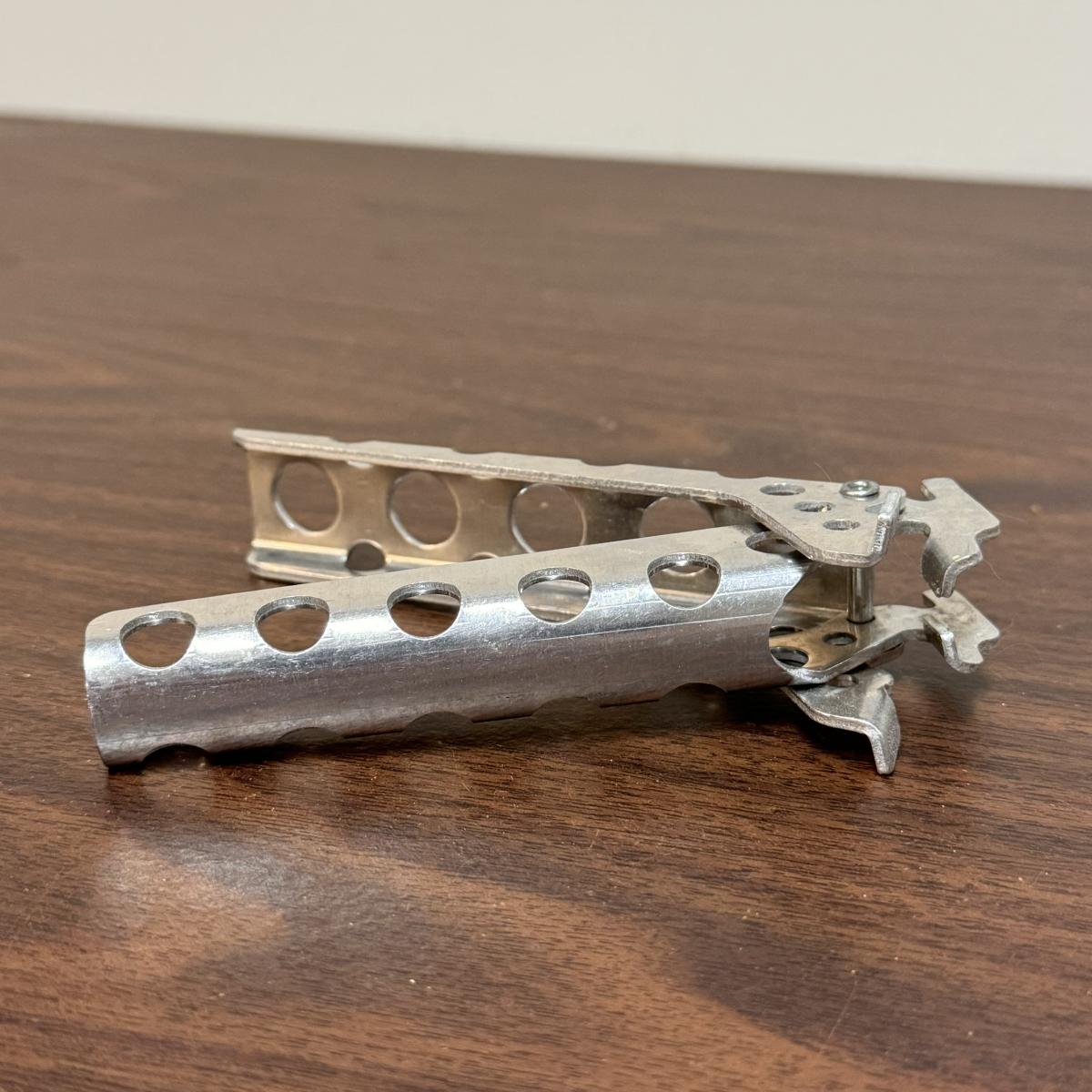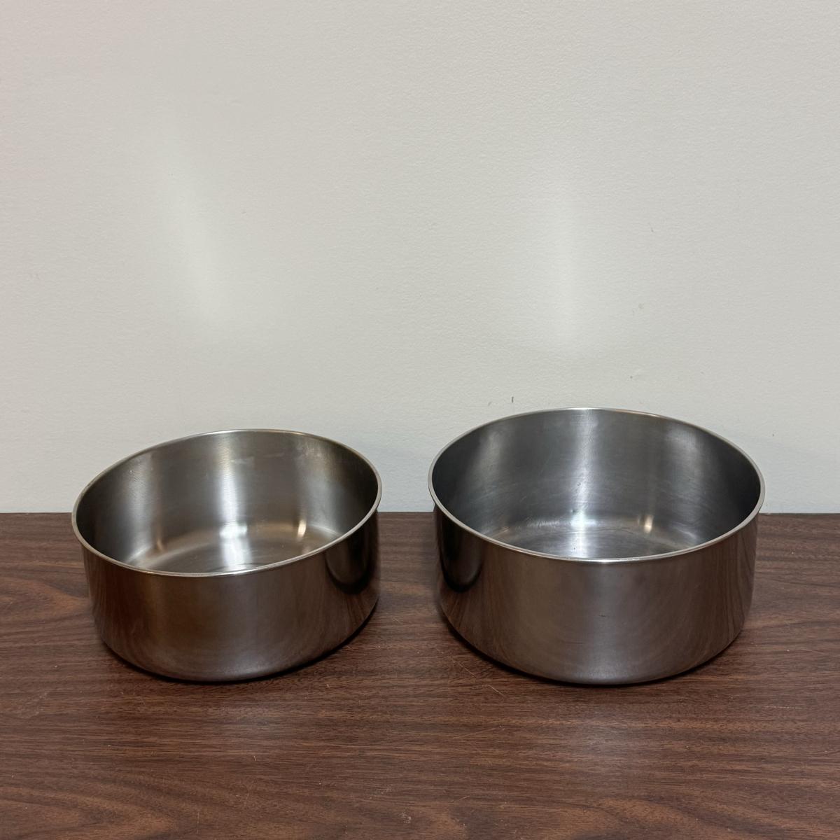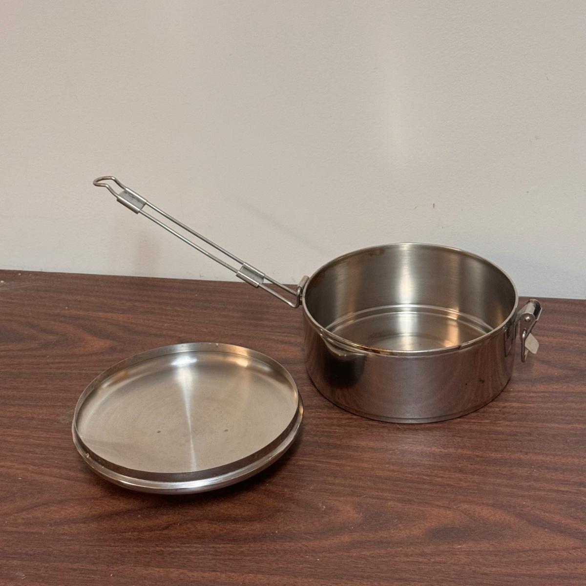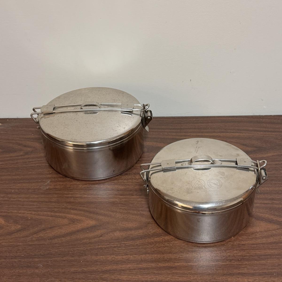 This lot includes one MSR heat exchanger that is adjustable, two MSR stainless steel mixing bowls, two MSR stainless stowaway pots, one MSR stainless pot with a removable handle, and two MSR panhandler pot clamps. The largest item is one of the mixing bowls that measures 7.5” x 3.5”H. Shipping available.