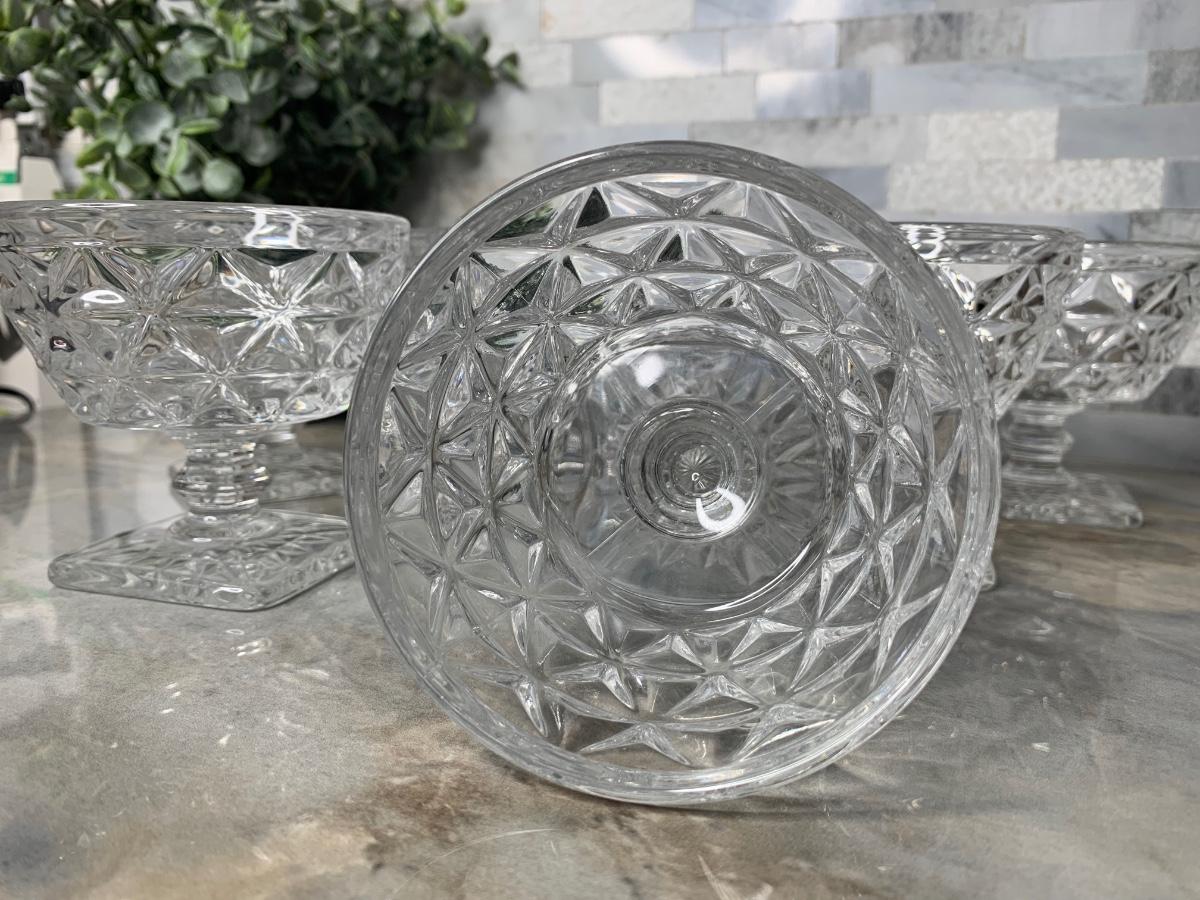 Pressed/Pat Gls and Crafted In United States these Lovely crisscross diamond design cups with a square sunburst base. Use them as Champagne/Tall Sherbet glass. Just beautiful collection.