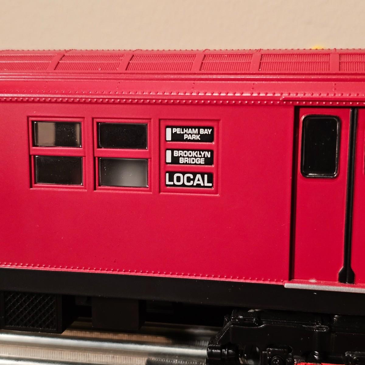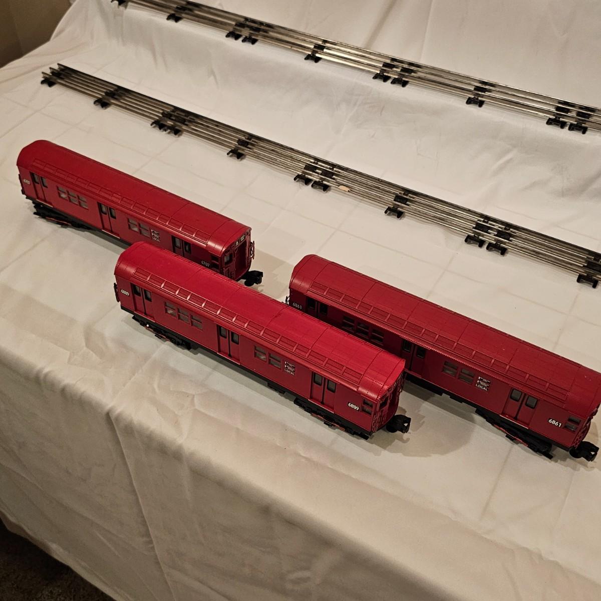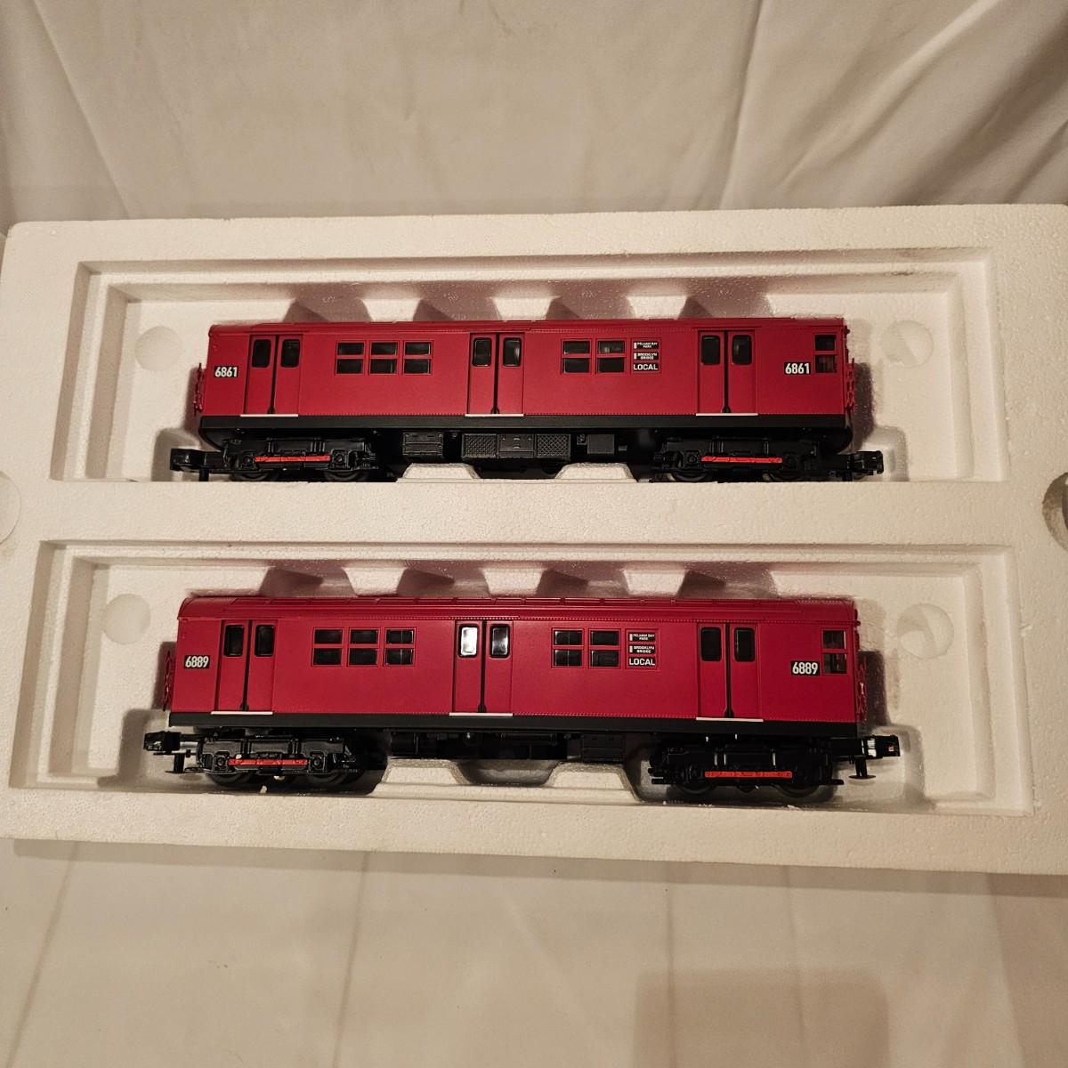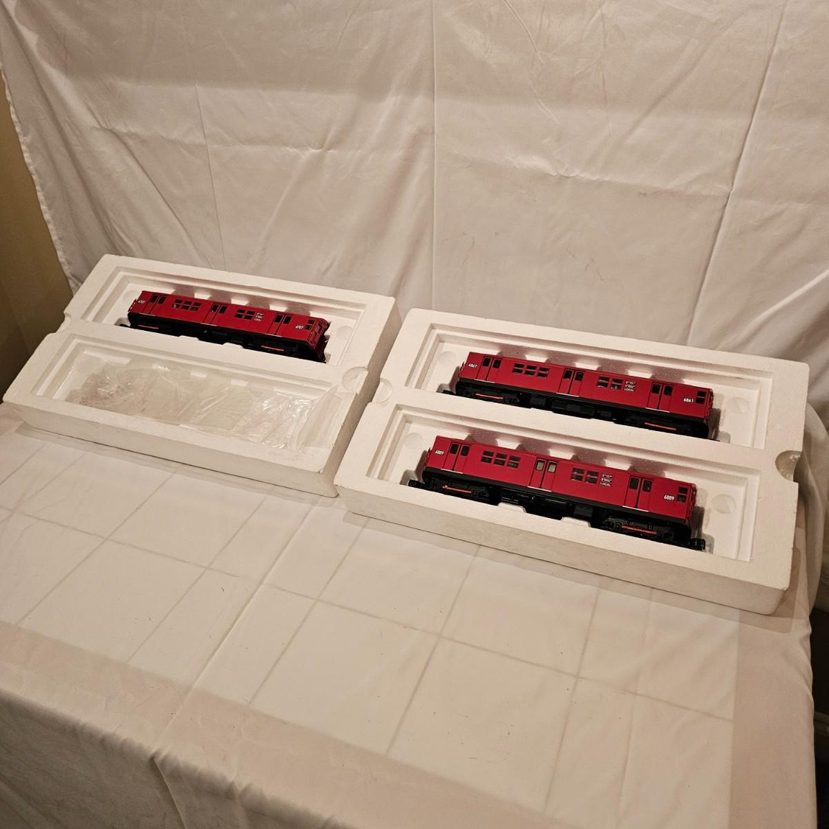 Three Redbird Subway line non-powered cars in original boxes. Set does not have the powered unit as listed on box, these are just follower-cars. Each car is 13.5" x 3" x 3"H. All items have interior lighting, turned on when tested. Cars are in larger box; second small box is empty but included. See photos for details. Shipping available. Please note that any price tag seen on an item was not put there by Sterling Transitions and does not reflect the current value of the item. Tracks in photos are not included with this lot, but available elsewhere in this auction.