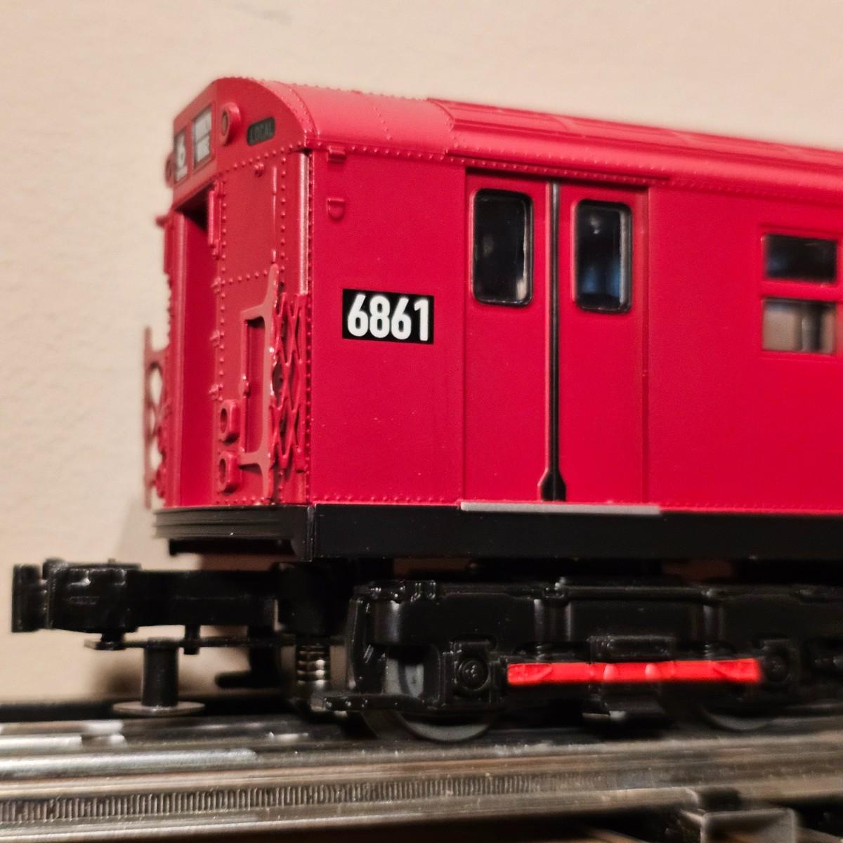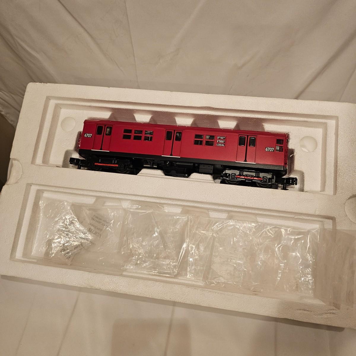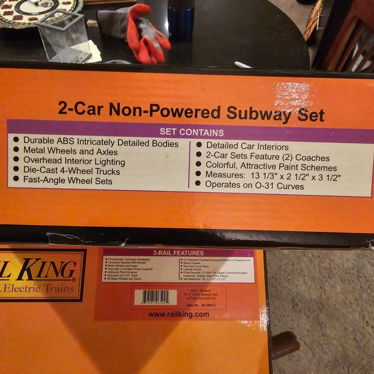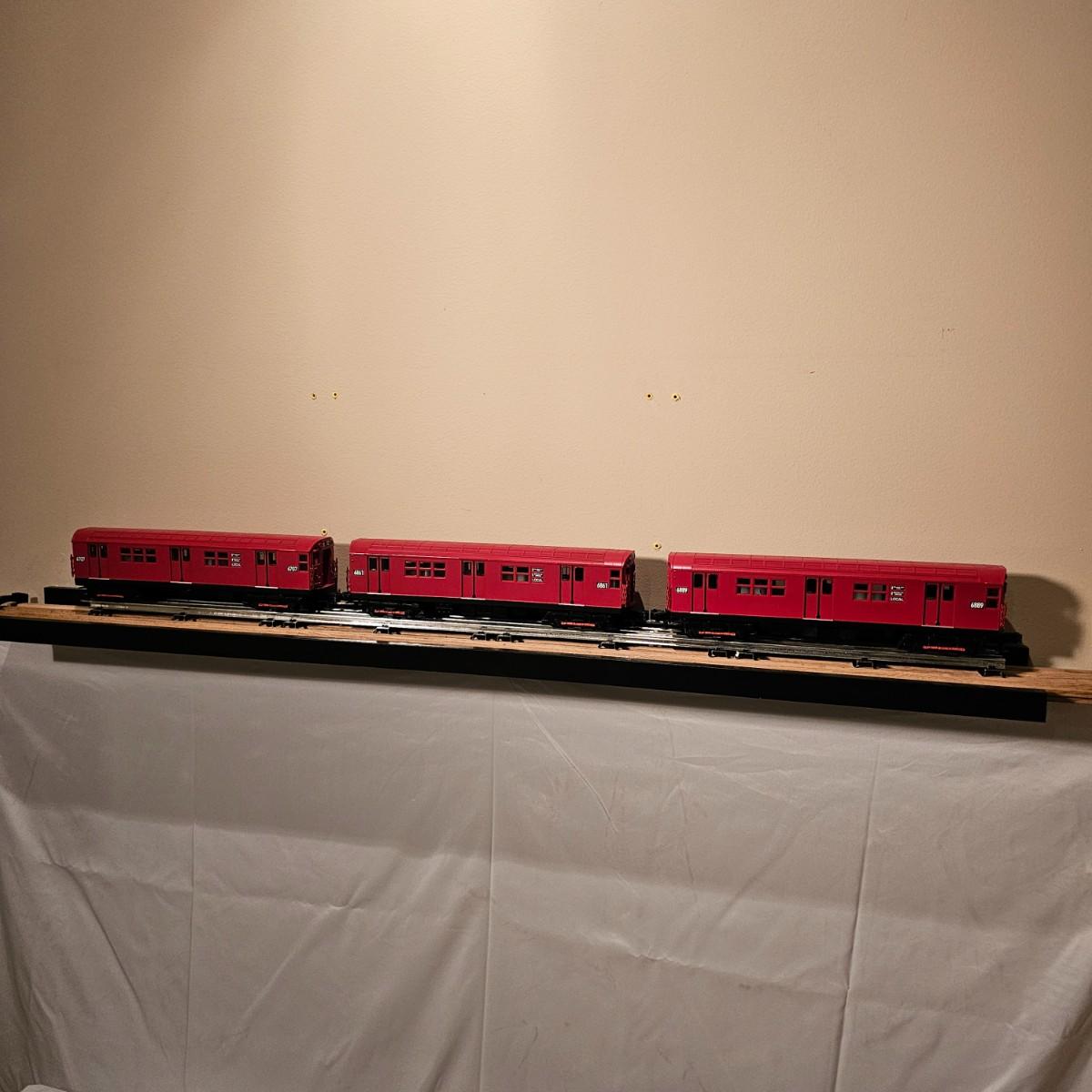 Three Redbird Subway line non-powered cars in original boxes. Set does not have the powered unit as listed on box, these are just follower-cars. Each car is 13.5" x 3" x 3"H. All items have interior lighting, turned on when tested. Cars are in larger box; second small box is empty but included. See photos for details. Shipping available. Please note that any price tag seen on an item was not put there by Sterling Transitions and does not reflect the current value of the item. Tracks in photos are not included with this lot, but available elsewhere in this auction.
