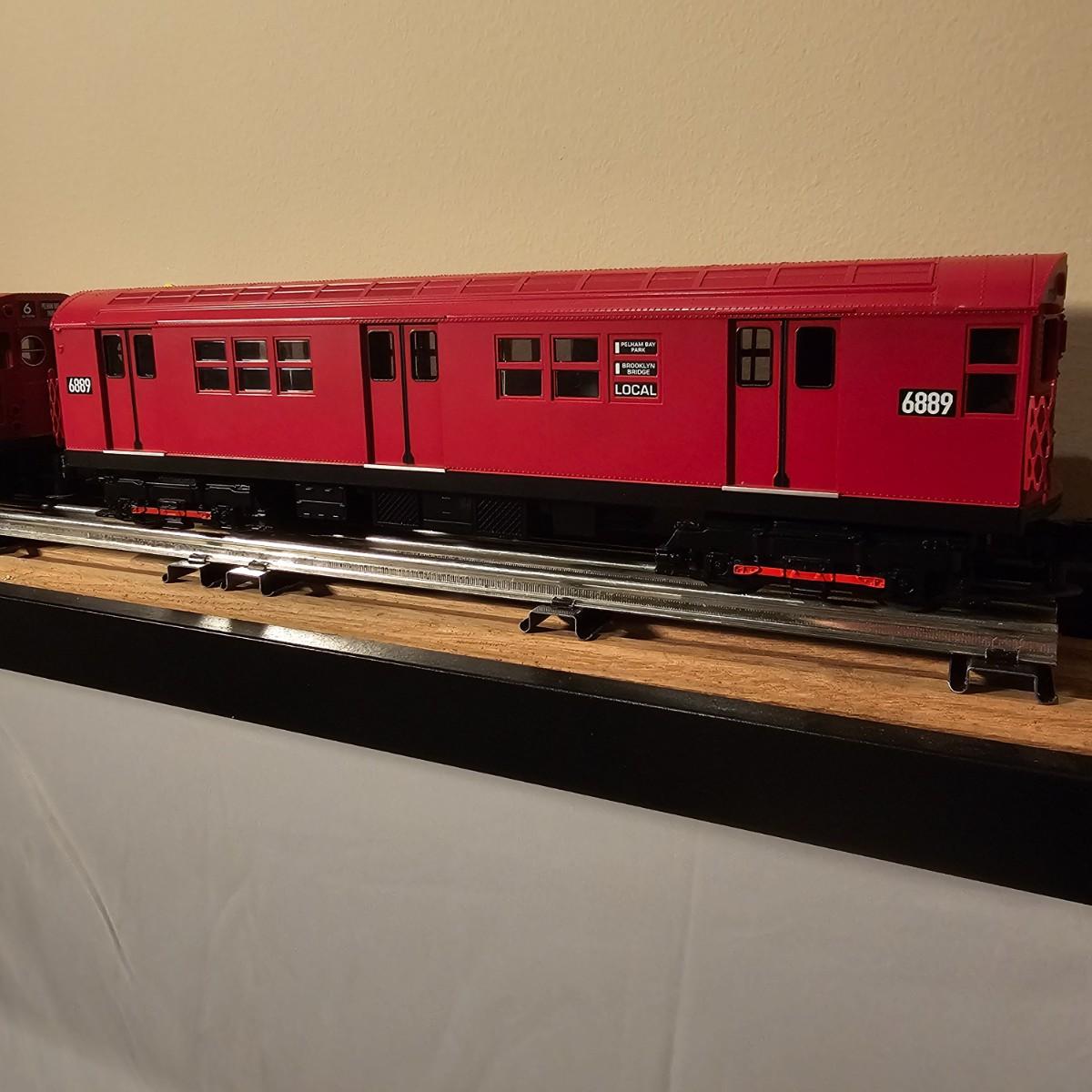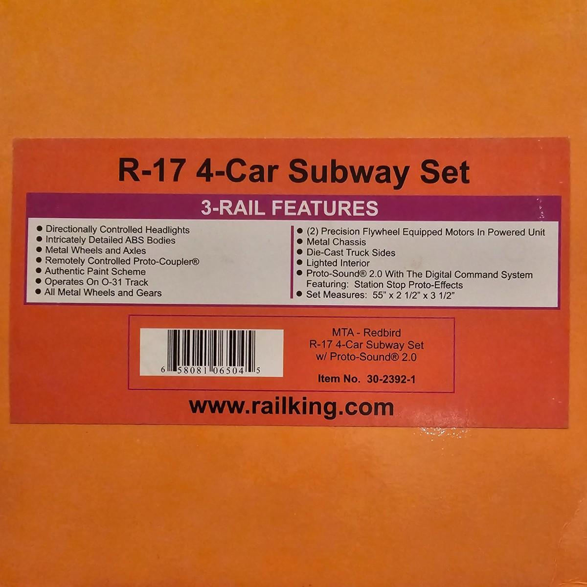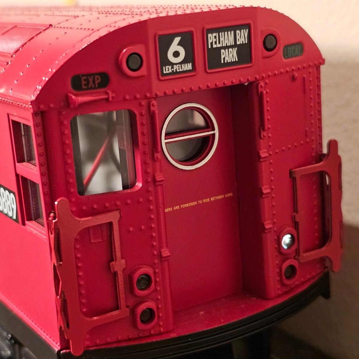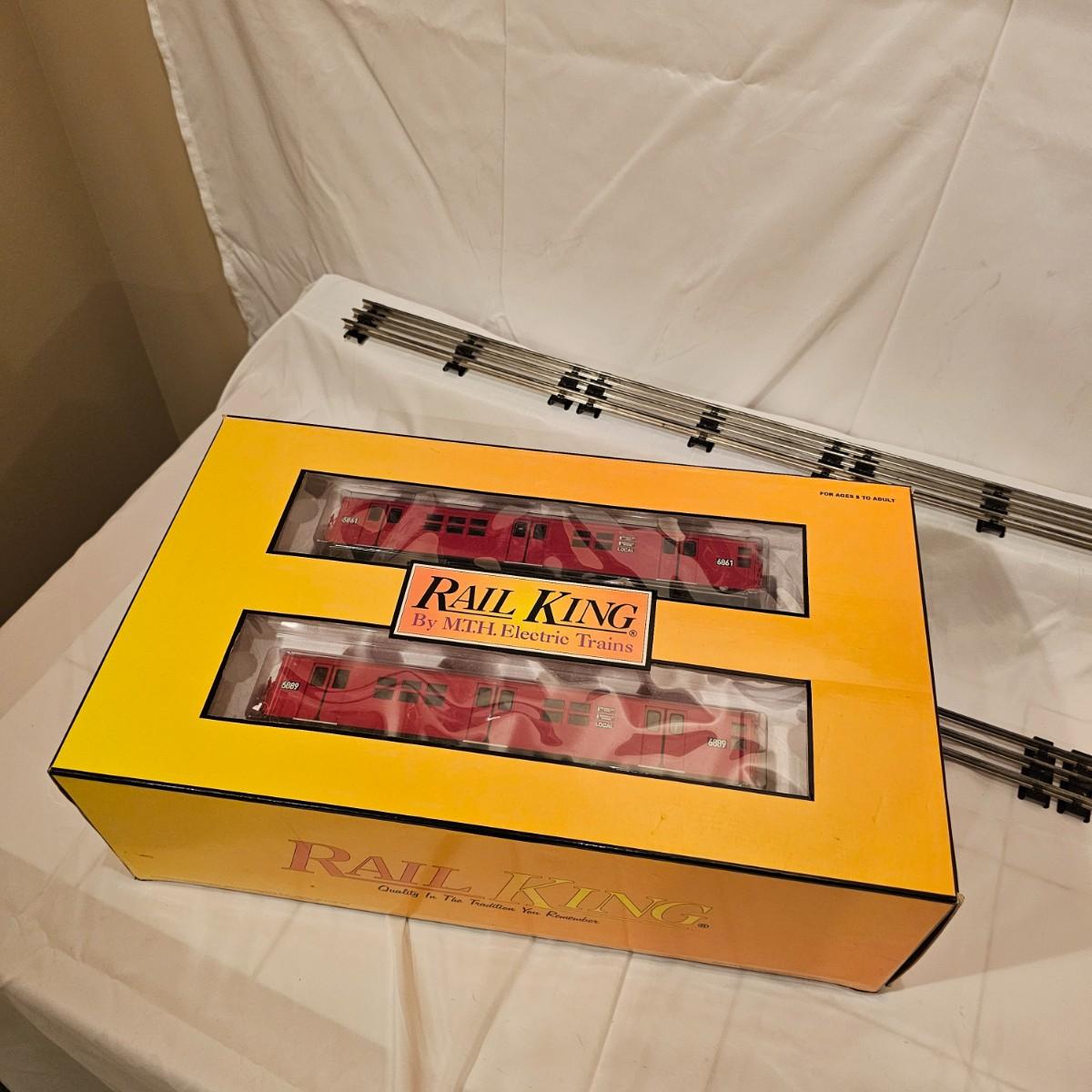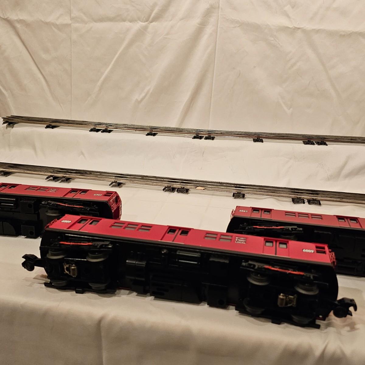 Three Redbird Subway line non-powered cars in original boxes. Set does not have the powered unit as listed on box, these are just follower-cars. Each car is 13.5" x 3" x 3"H. All items have interior lighting, turned on when tested. Cars are in larger box; second small box is empty but included. See photos for details. Shipping available. Please note that any price tag seen on an item was not put there by Sterling Transitions and does not reflect the current value of the item. Tracks in photos are not included with this lot, but available elsewhere in this auction.