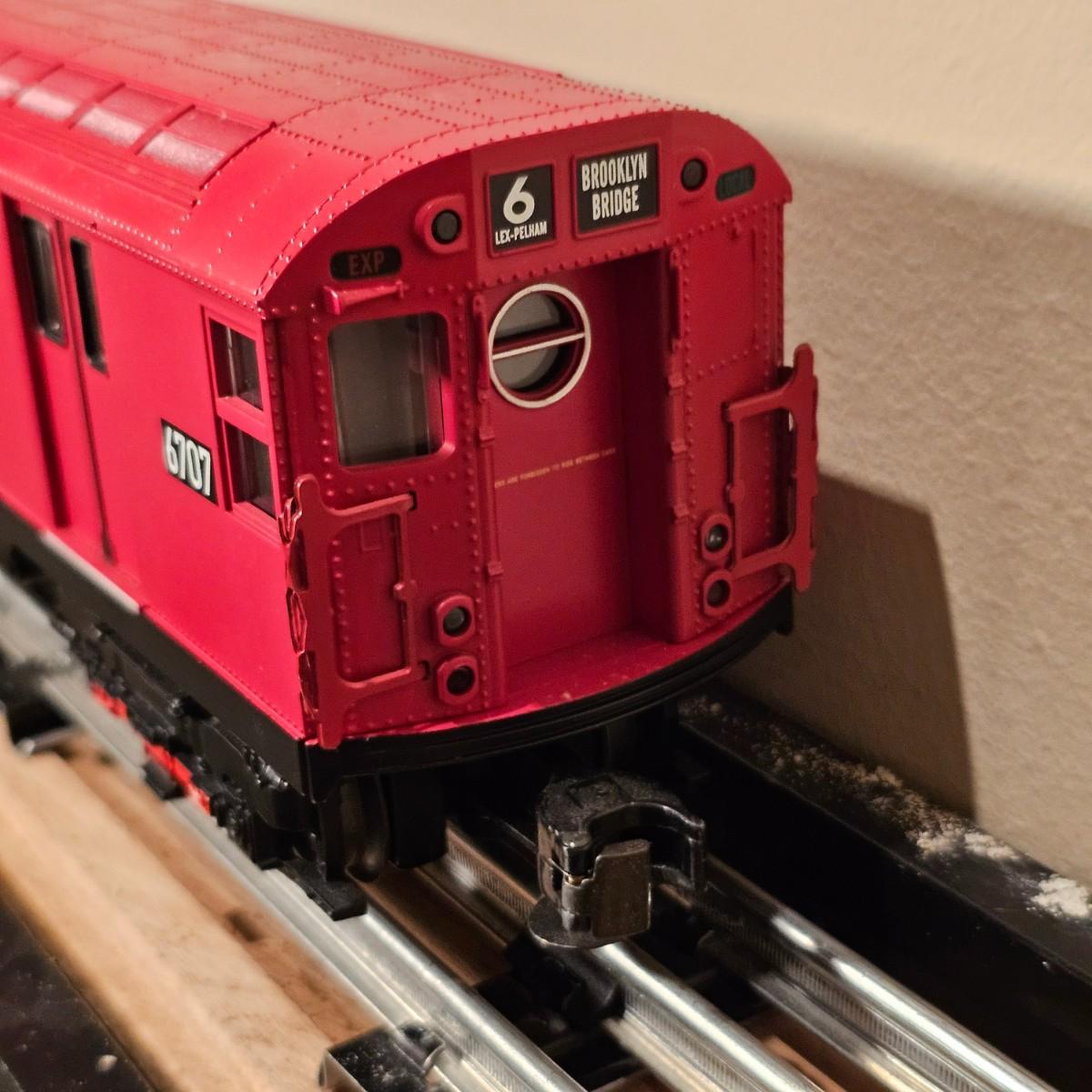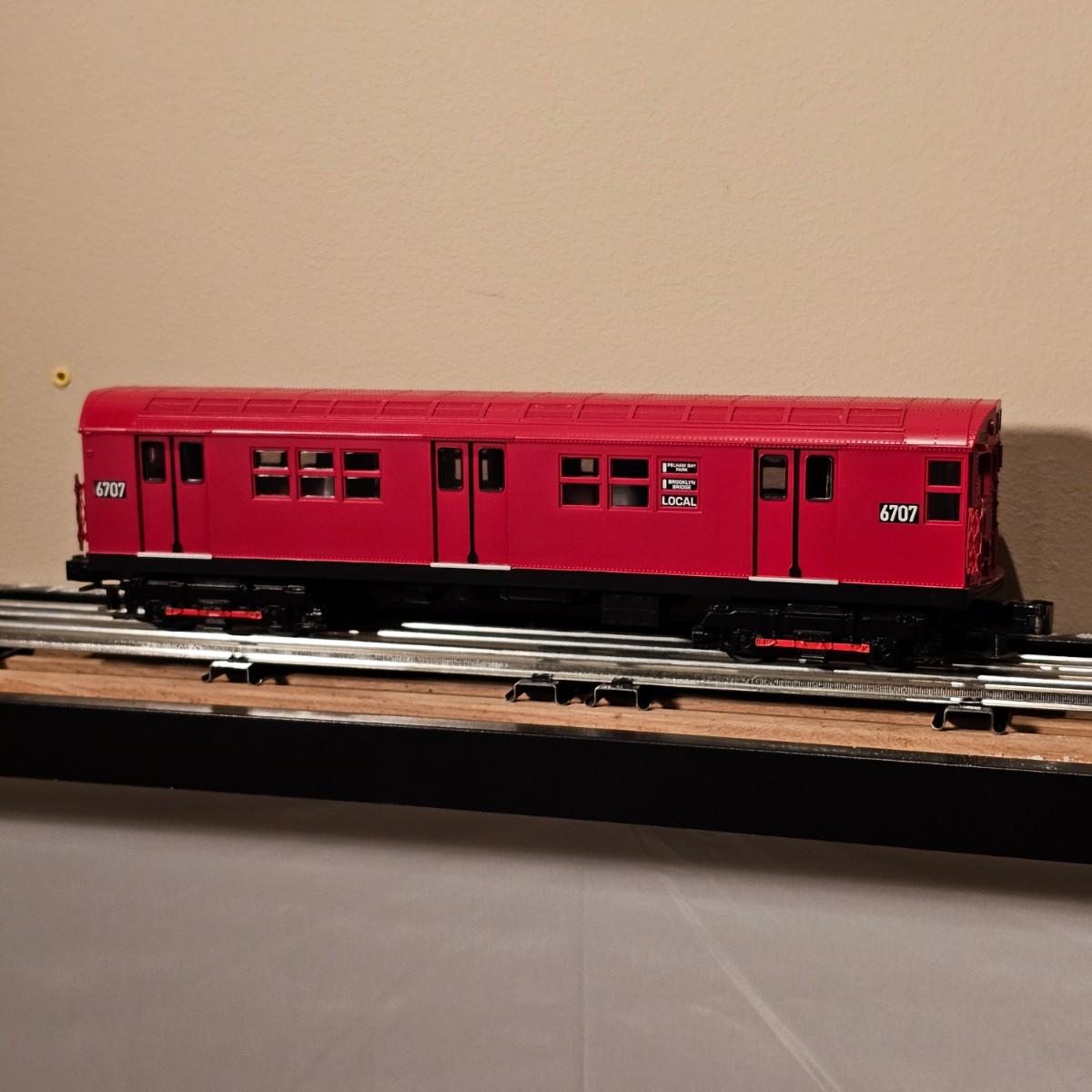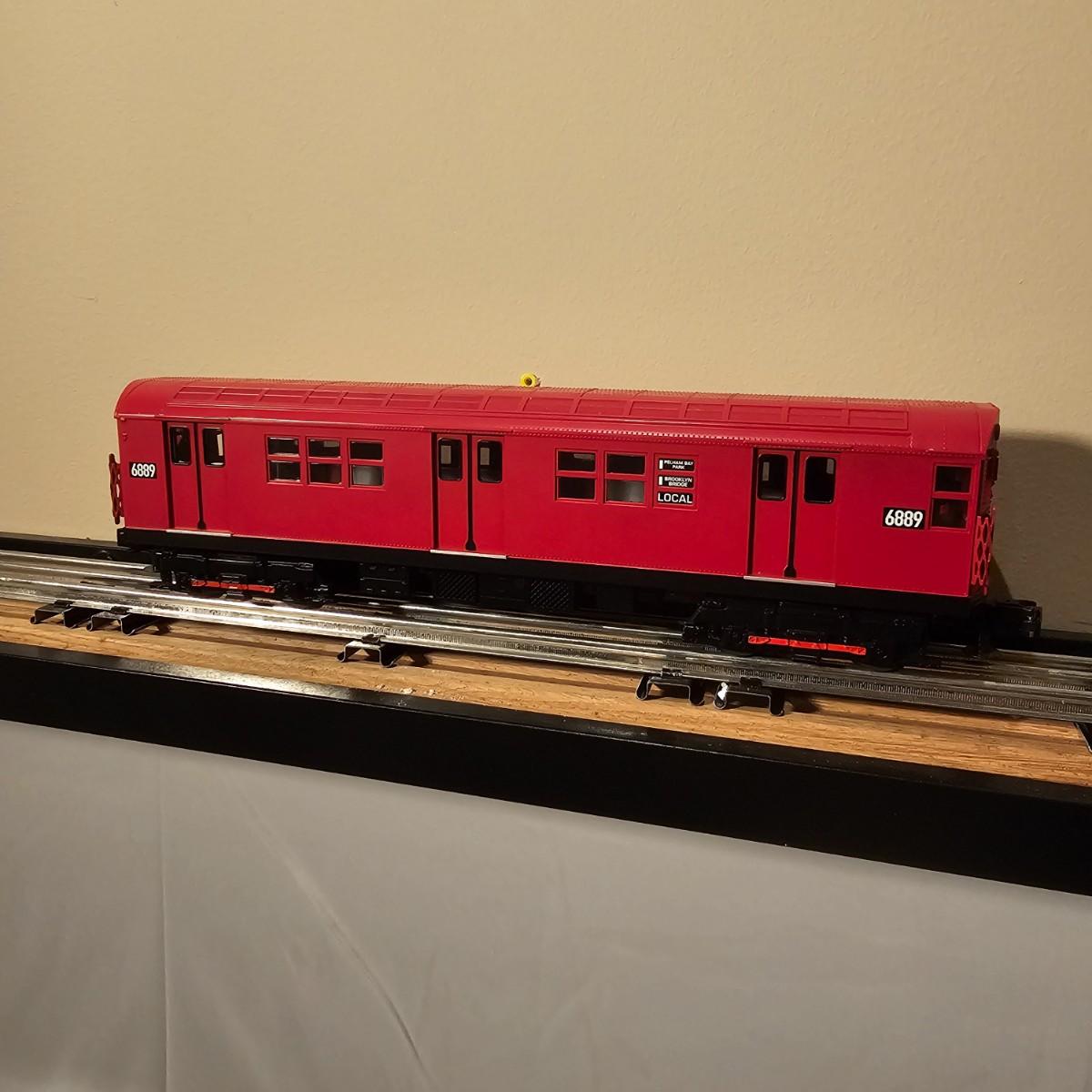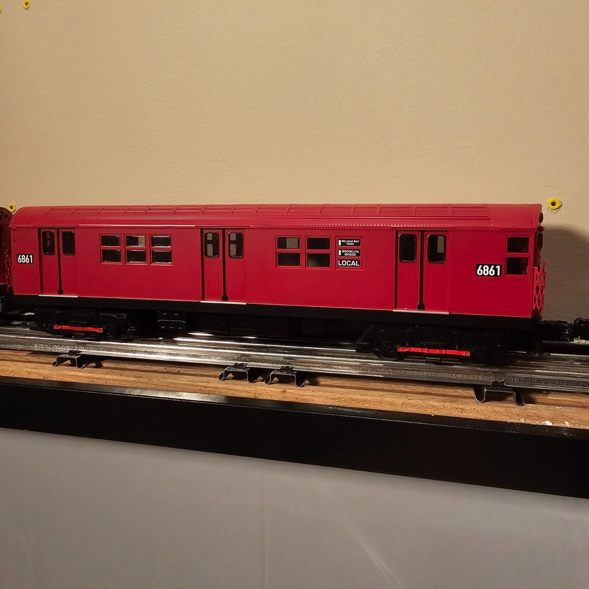 Three Redbird Subway line non-powered cars in original boxes. Set does not have the powered unit as listed on box, these are just follower-cars. Each car is 13.5" x 3" x 3"H. All items have interior lighting, turned on when tested. Cars are in larger box; second small box is empty but included. See photos for details. Shipping available. Please note that any price tag seen on an item was not put there by Sterling Transitions and does not reflect the current value of the item. Tracks in photos are not included with this lot, but available elsewhere in this auction.