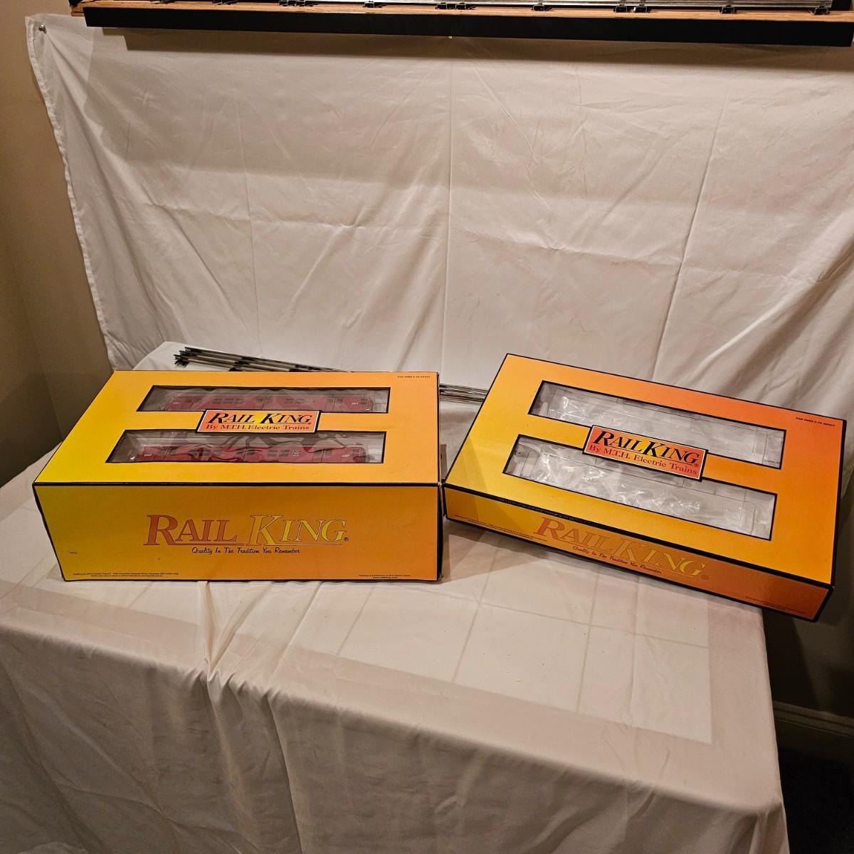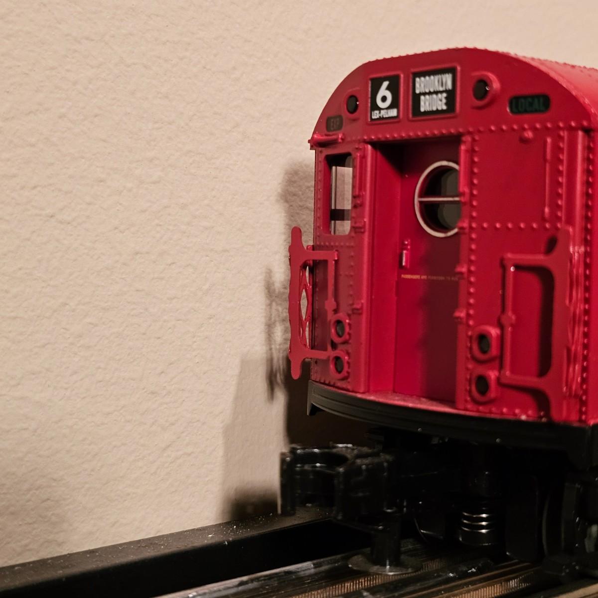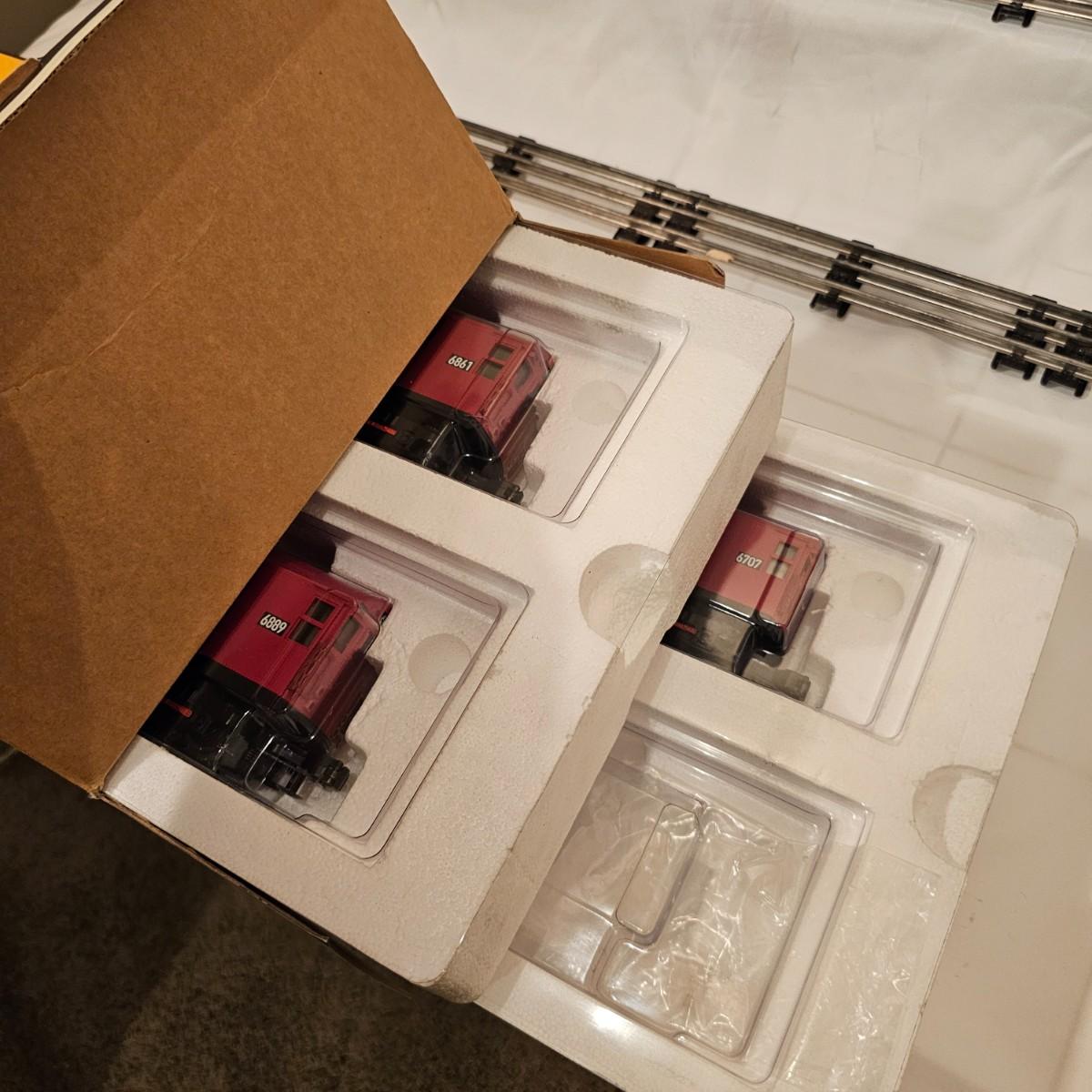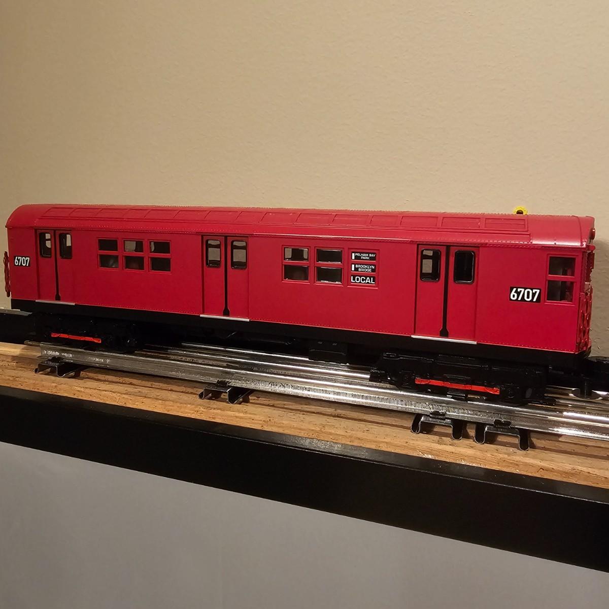Three Redbird Subway line non-powered cars in original boxes. Set does not have the powered unit as listed on box, these are just follower-cars. Each car is 13.5" x 3" x 3"H. All items have interior lighting, turned on when tested. Cars are in larger box; second small box is empty but included. See photos for details. Shipping available. Please note that any price tag seen on an item was not put there by Sterling Transitions and does not reflect the current value of the item. Tracks in photos are not included with this lot, but available elsewhere in this auction.