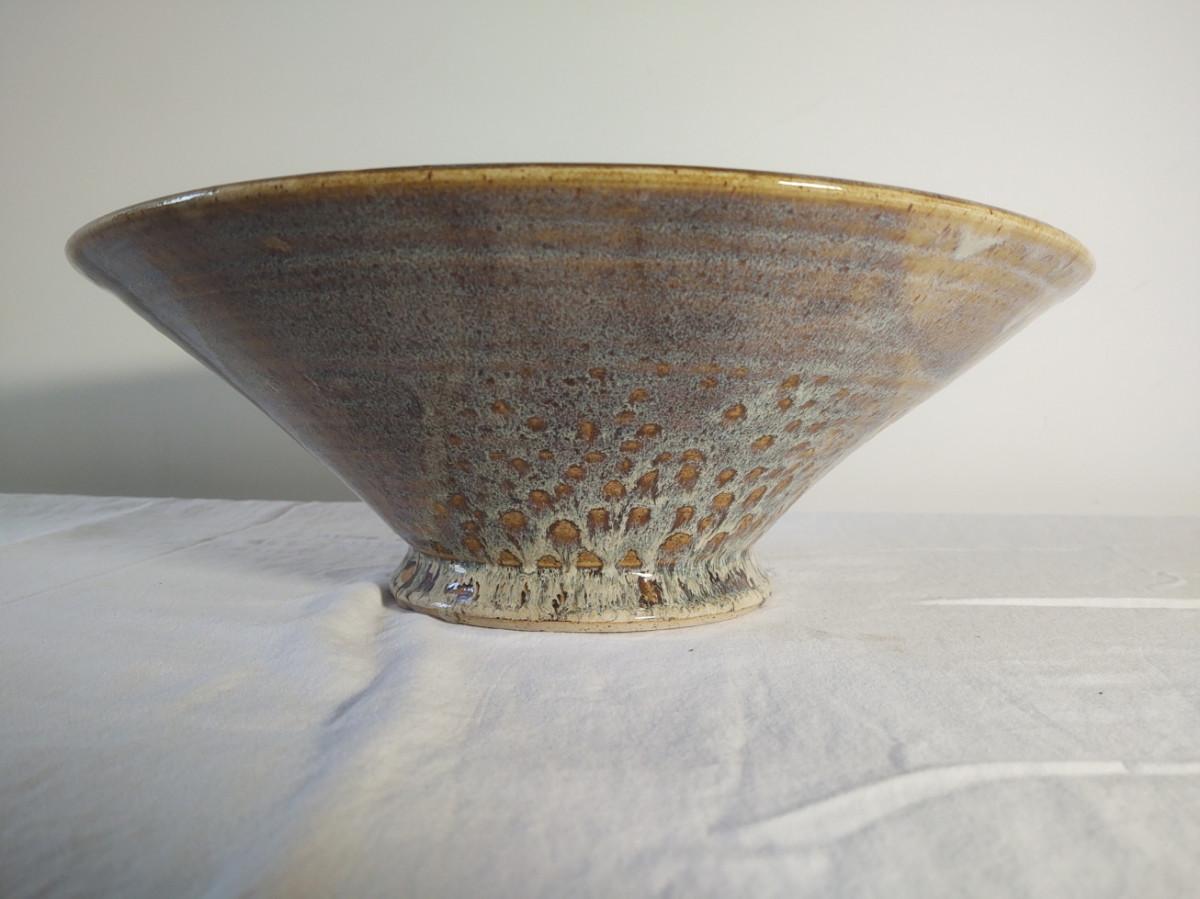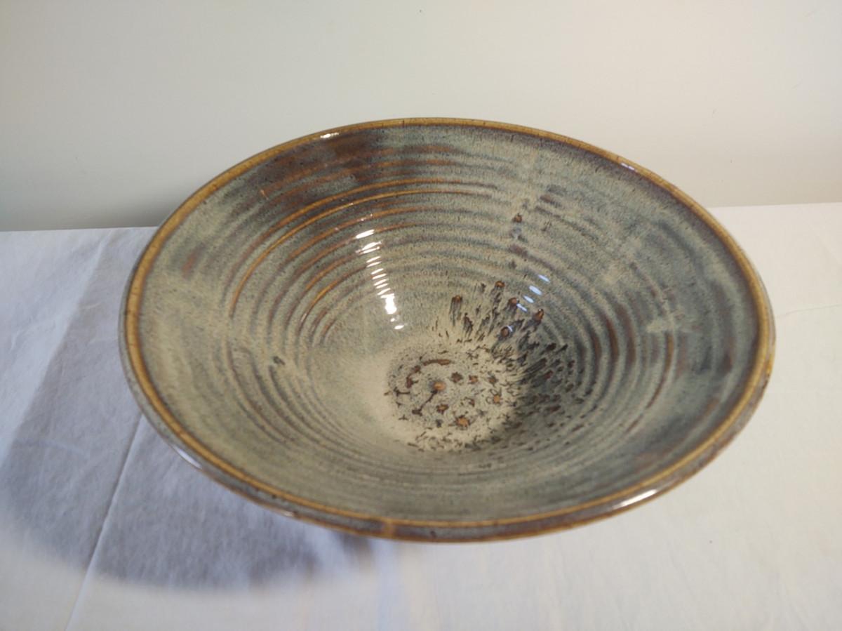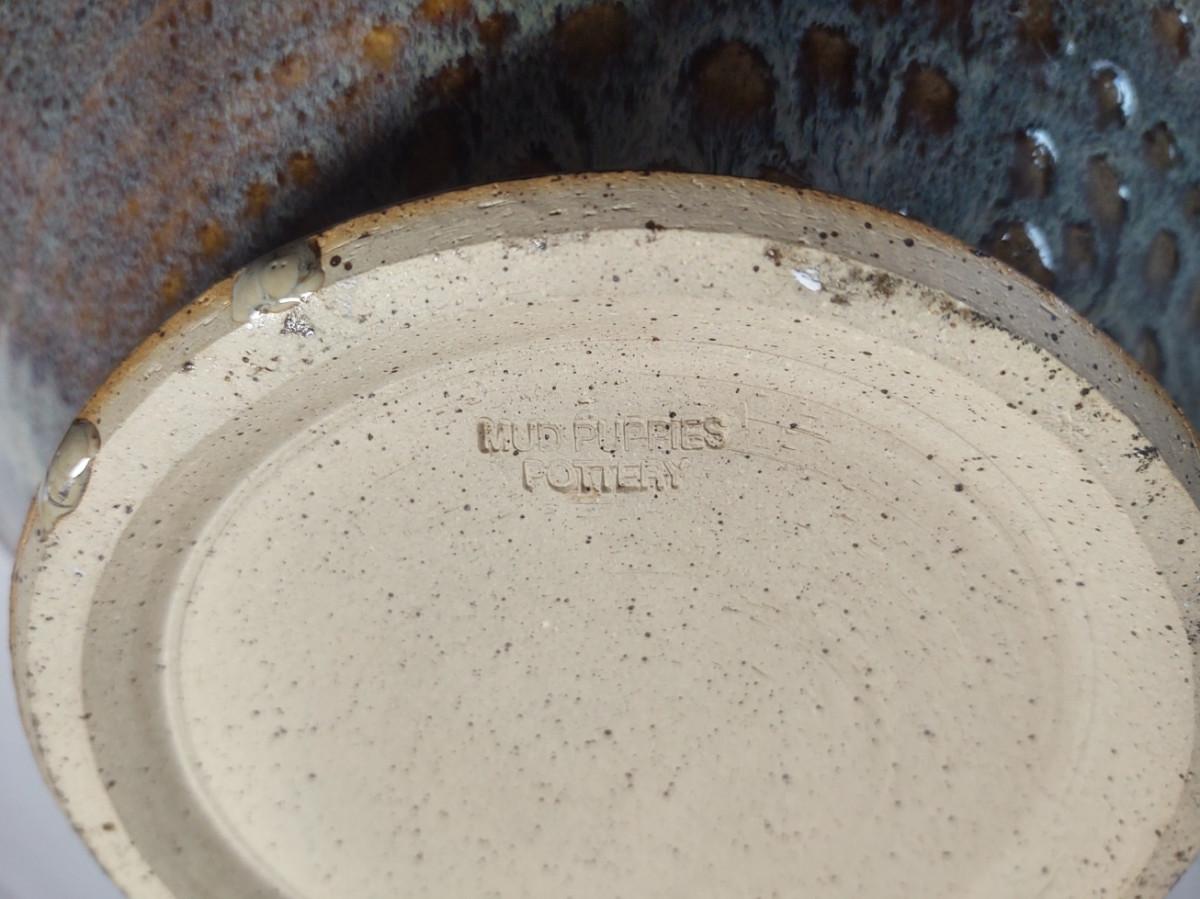 Hand thrown pottery from Mud Puppies Pottery in Sylva, NC. Measures 15" in diameter and 5" tall. Please see pictures for details.