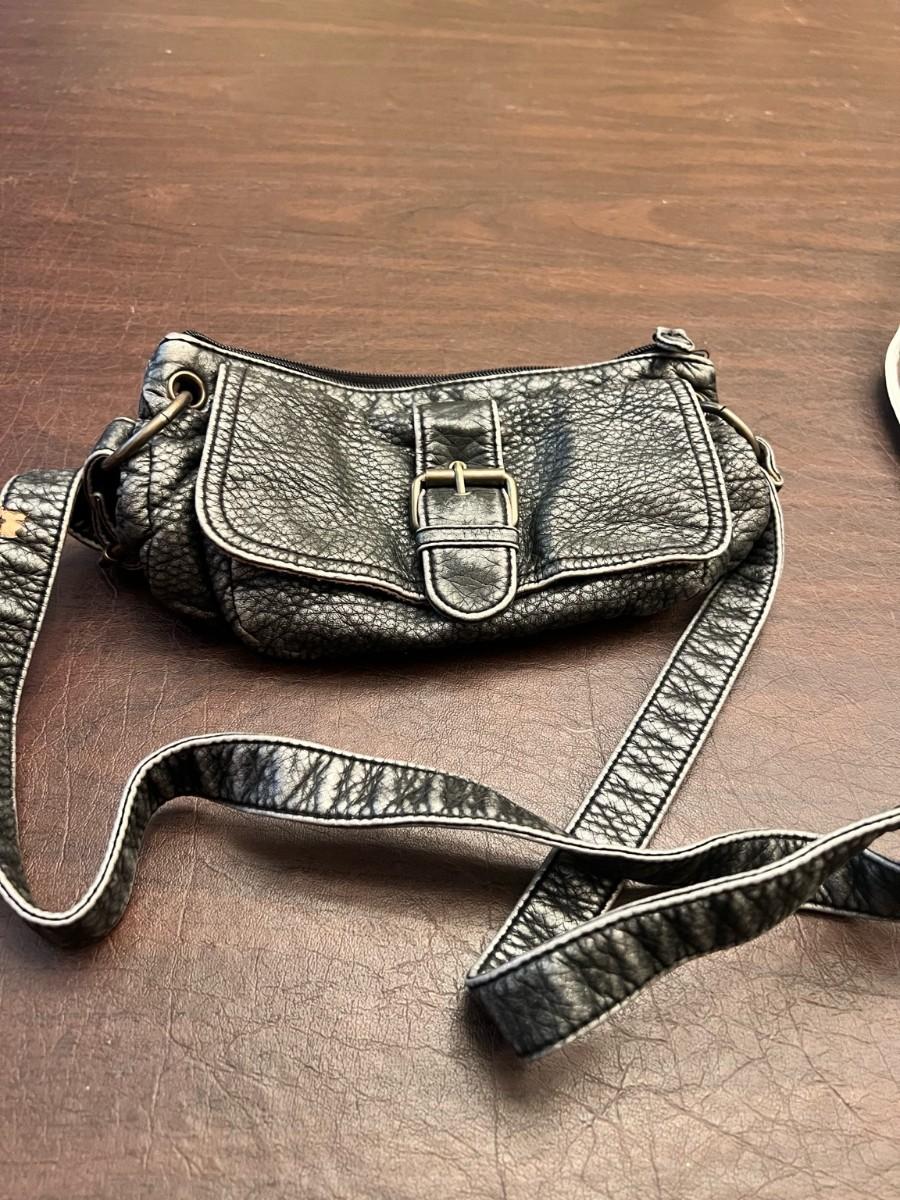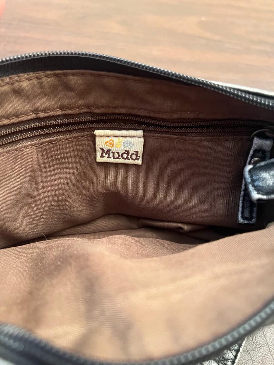 Cute and compact Mudd brand crossbody purse featuring a black pebbled faux-leather exterior with a front buckle-detail pocket. The interior is clean, lined in brown fabric, and includes a zippered accessory pocket. Slim strap makes it perfect for hands-free use. Classic Y2K–early 2000s department-store style — lightweight, functional, and great for everyday wear or resale lots.