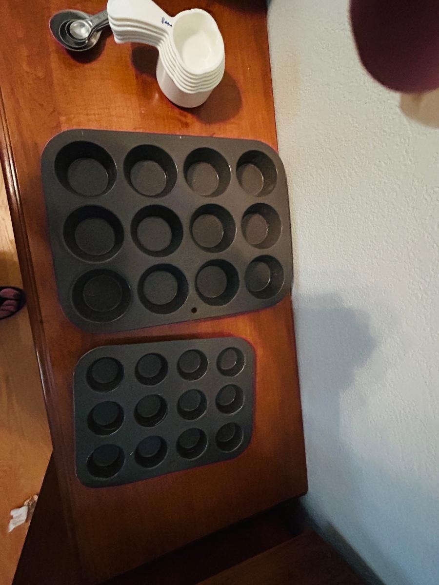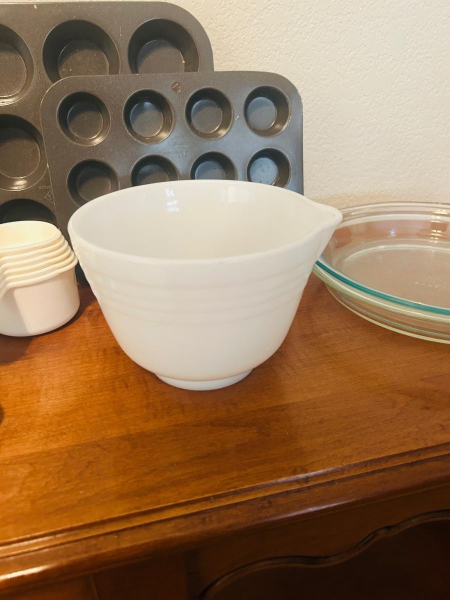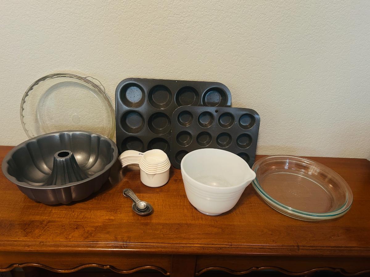 MUFFIN PANS, MIXING BOWL, BUNT PAN, CAKE PANS, TUPPERWARE MEASURING CUPS