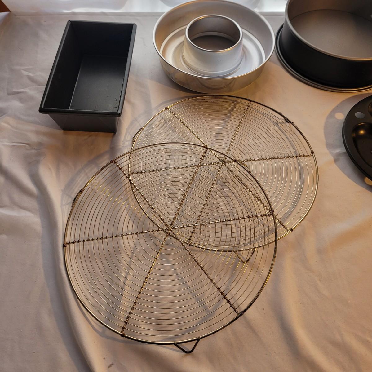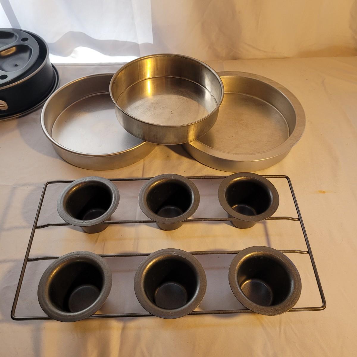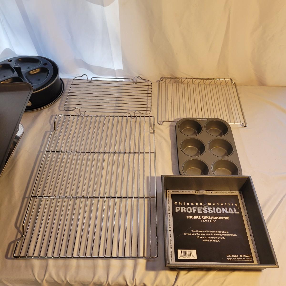 This large lot of baking supplies includes muffin tins, cookie sheets, cake pans, brownie pans, cooling racks and more. Spring form pan measures approximately 9”DIA for reference. Shipping available.