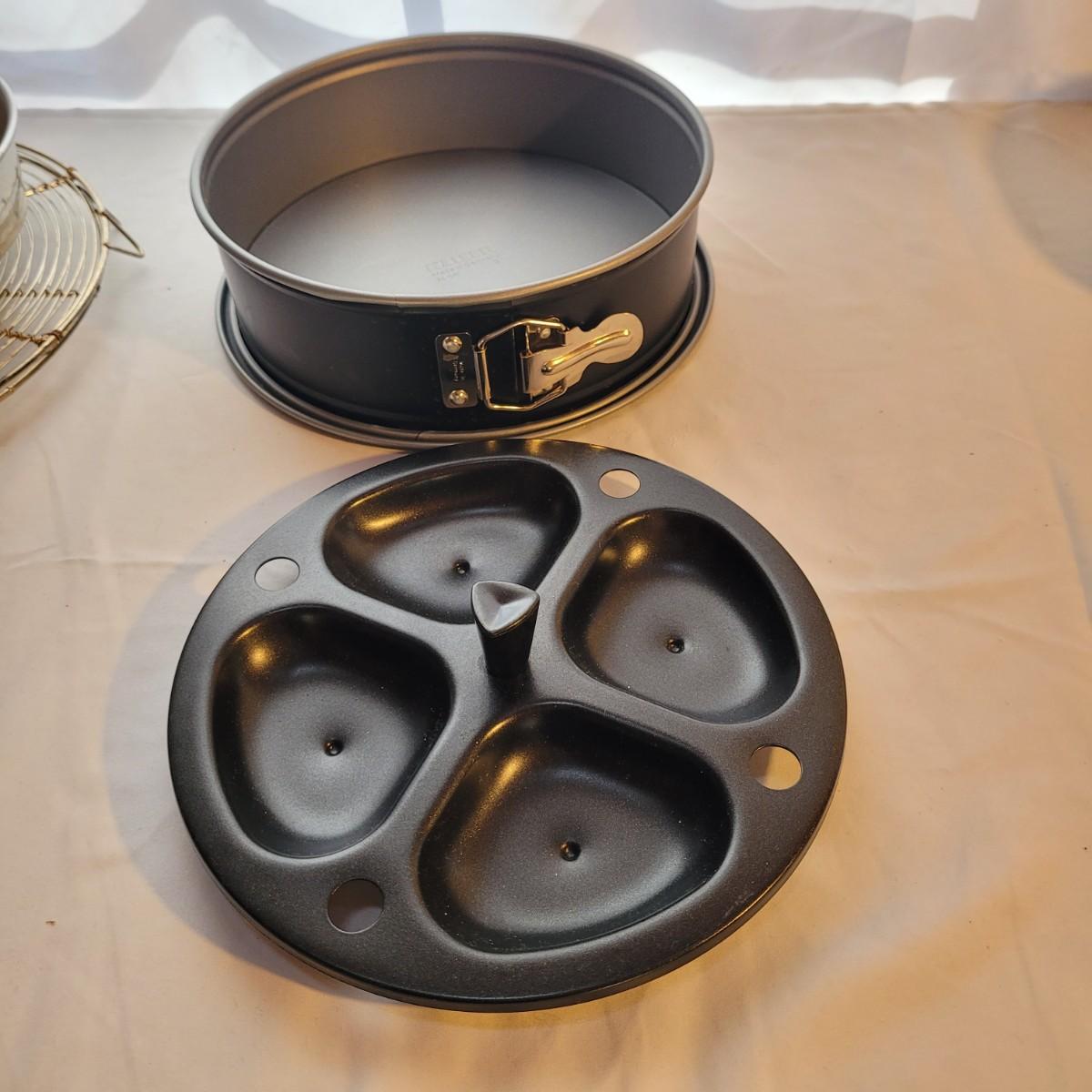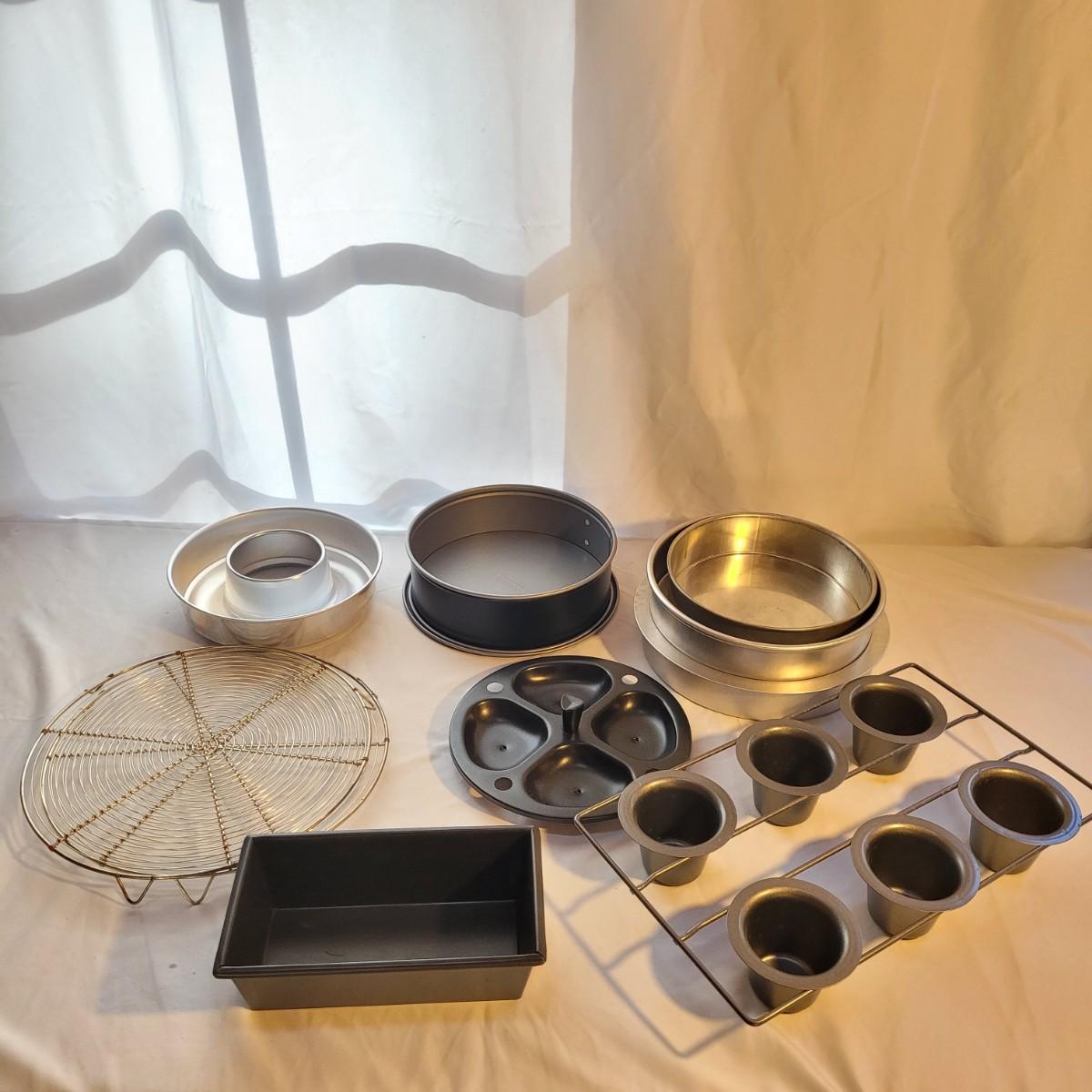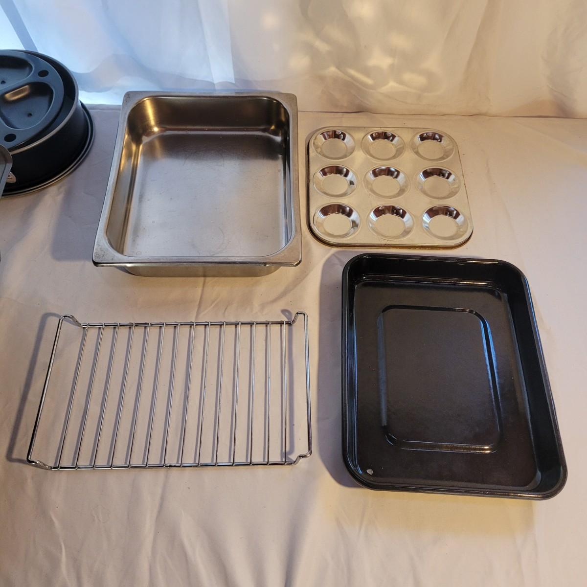 This large lot of baking supplies includes muffin tins, cookie sheets, cake pans, brownie pans, cooling racks and more. Spring form pan measures approximately 9”DIA for reference. Shipping available.