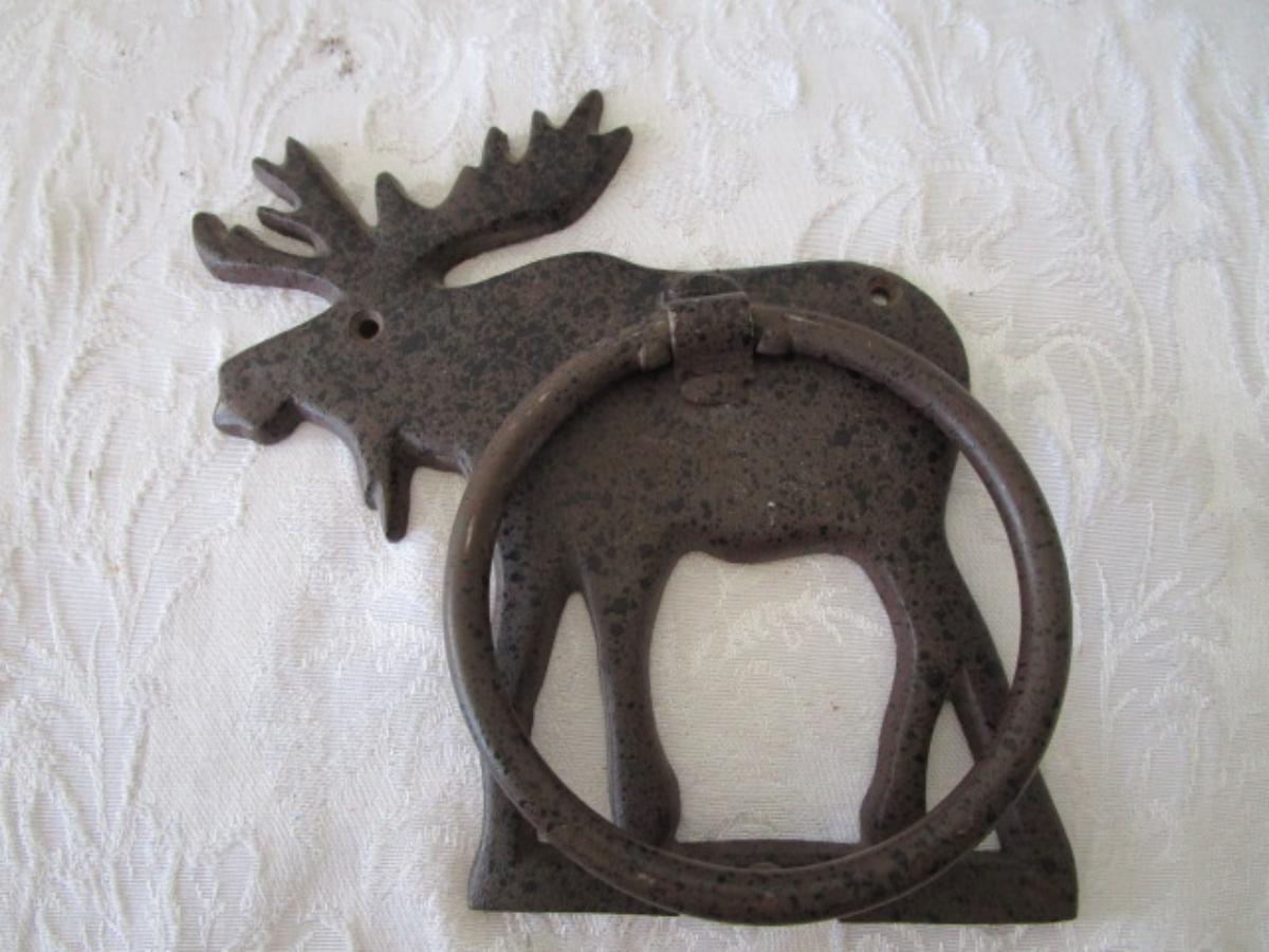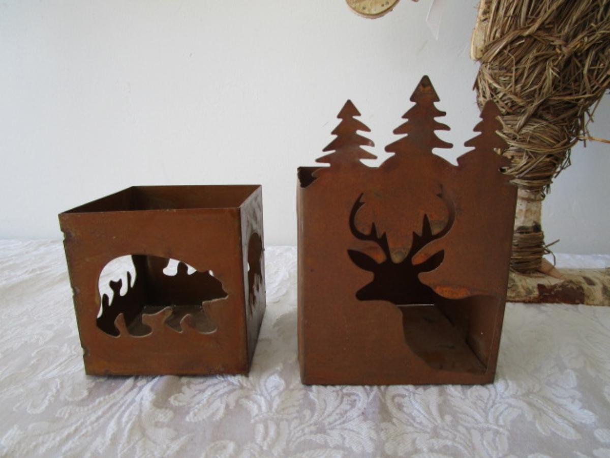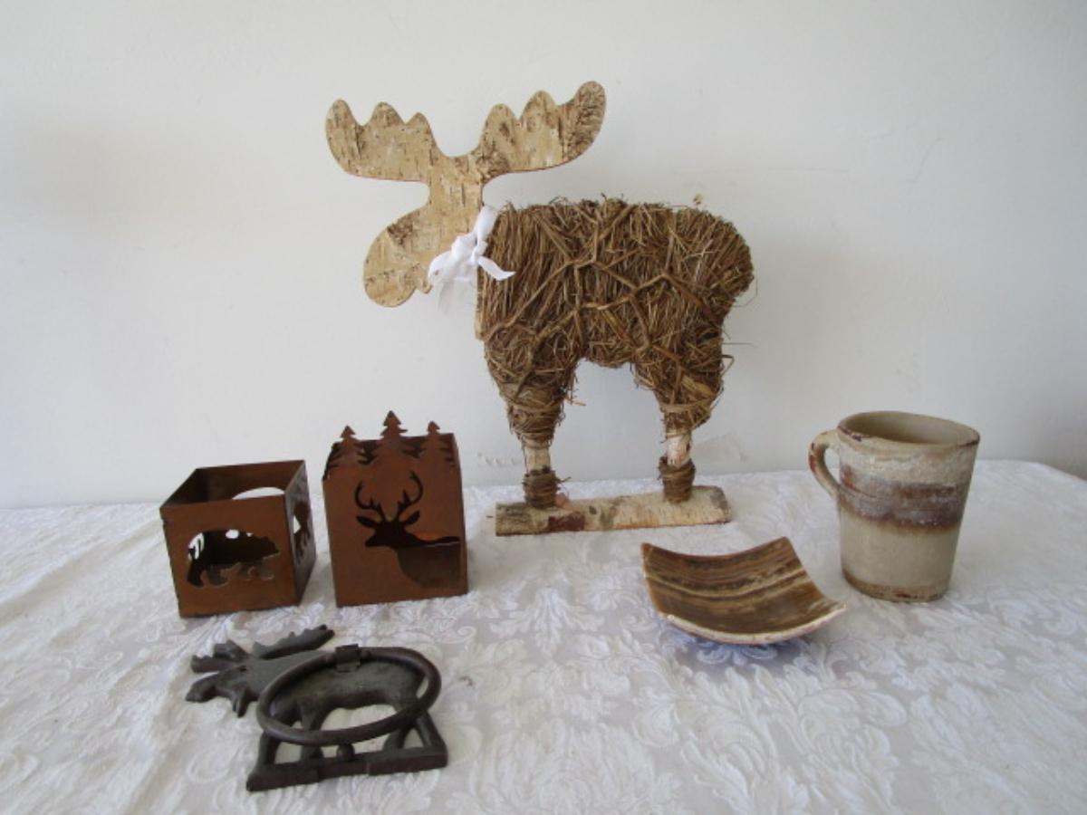Pottery mug, glazed candle holder, Moose decoration 15-1/2" tall x 15-1/2" long, 2 metal cut-out candle holders, moose door knocker