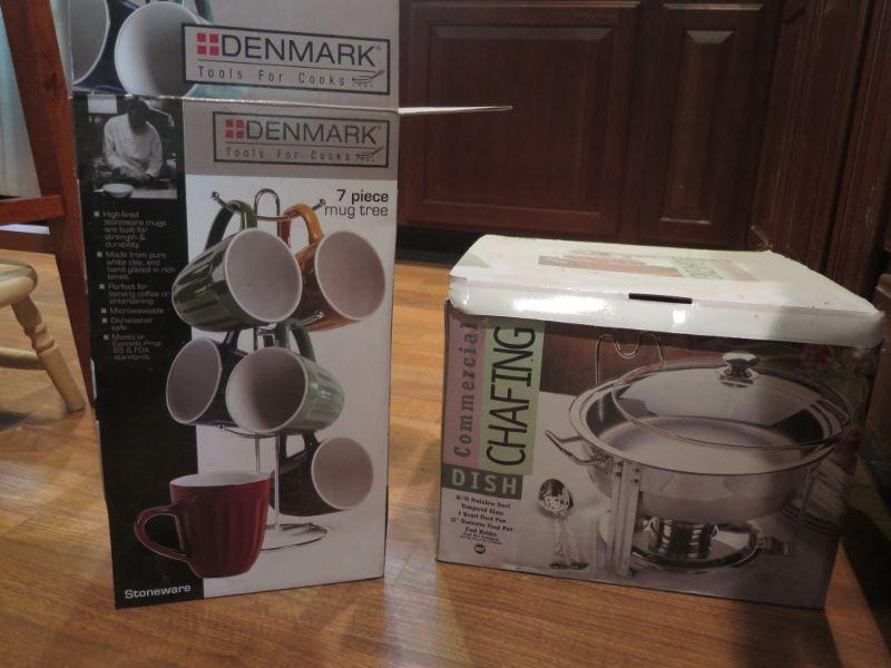 Mug Tree and Chafing Dish - New in Box **Please read Terms and Conditions before placing a bid. Pick up is Sunday, September 1, 2019 from 10am to 4pm in Williamstown. All sales are final. All sales are as is, where is. Please review all photos. Any props included in photos are not included in listing. All measurements are approximate.