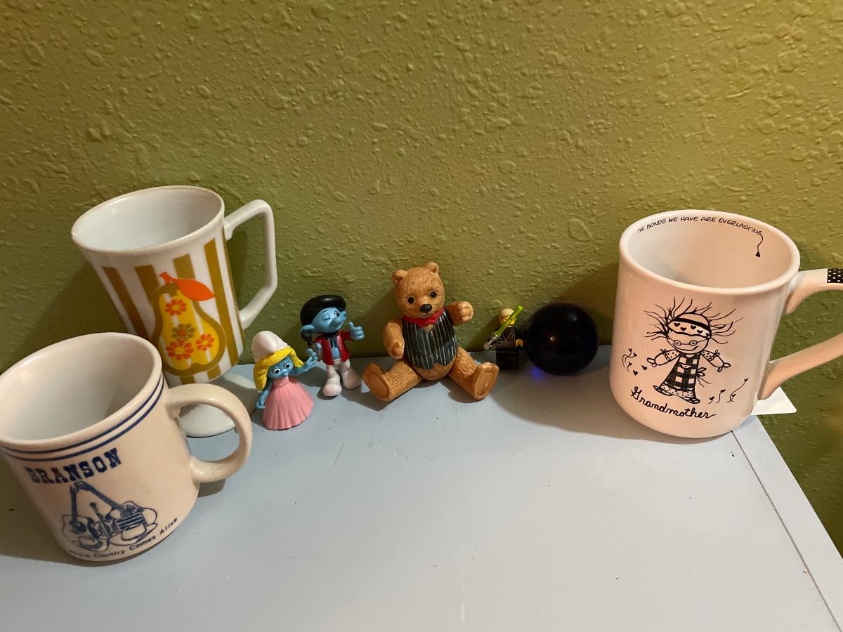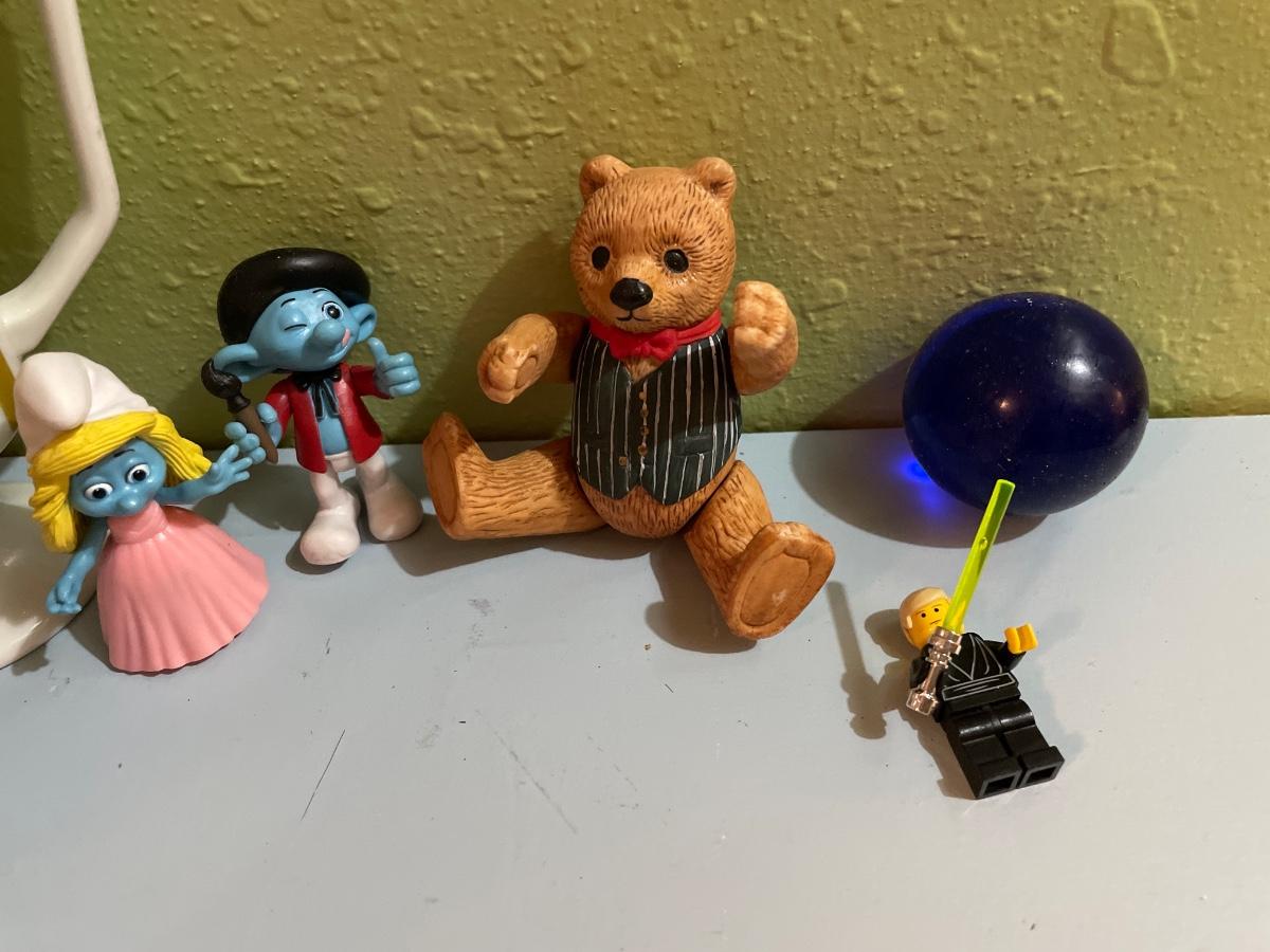 Lego Star Wars figure, Smurfs and Teddy bear large blue ball