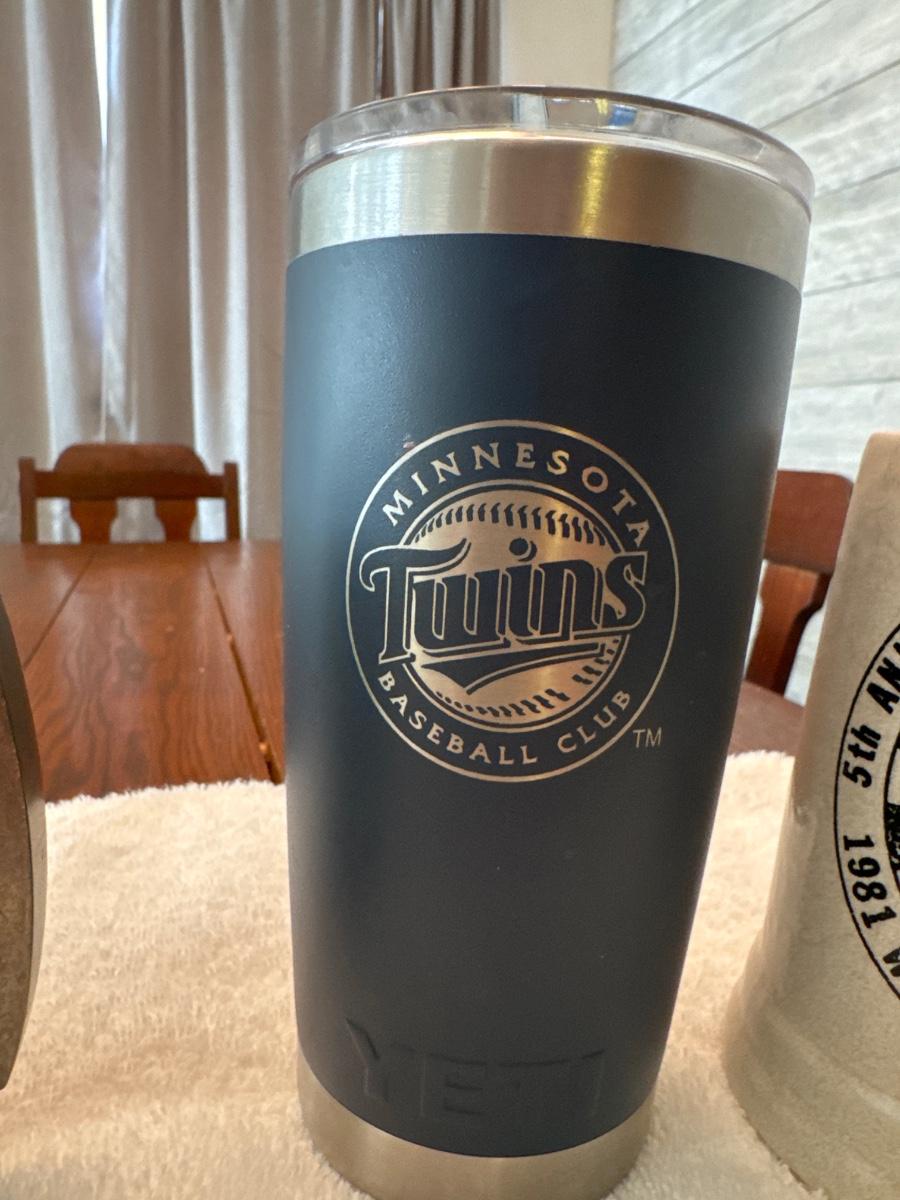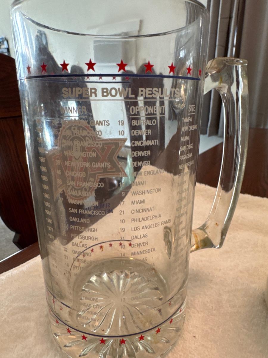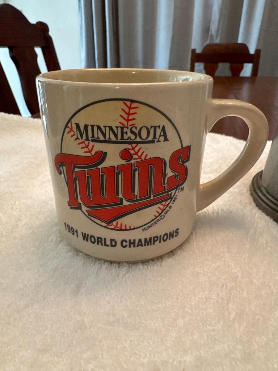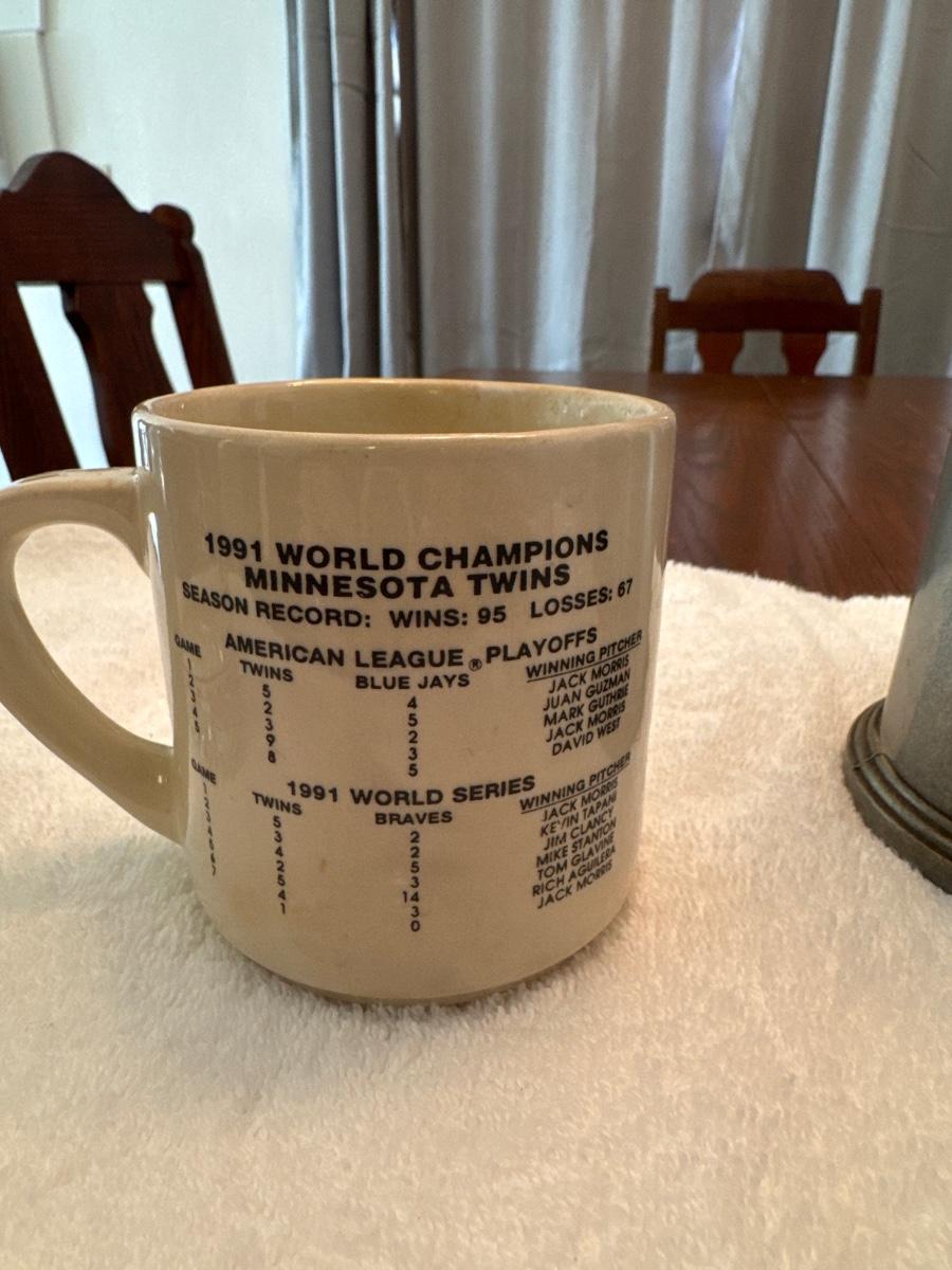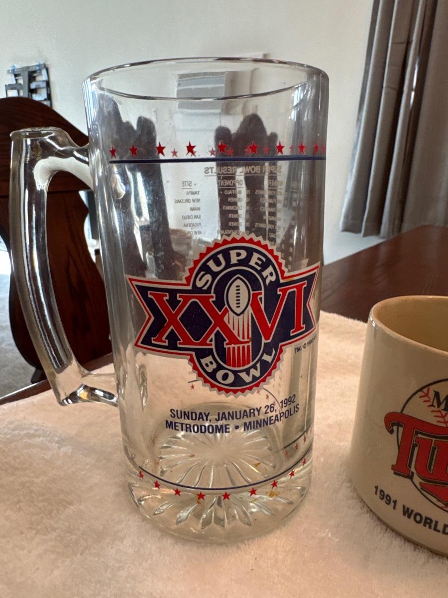 Super Bowl mug from January 26, 1992, Minnesota Twins 91 world champs coffee mug top sales award classic roadsters LTD Minnesota Twins yeti fifth annual Freddie Prince memorial 1981 Wolverton Mountain, Al’s bar shot glass and Minnesota Vikings.