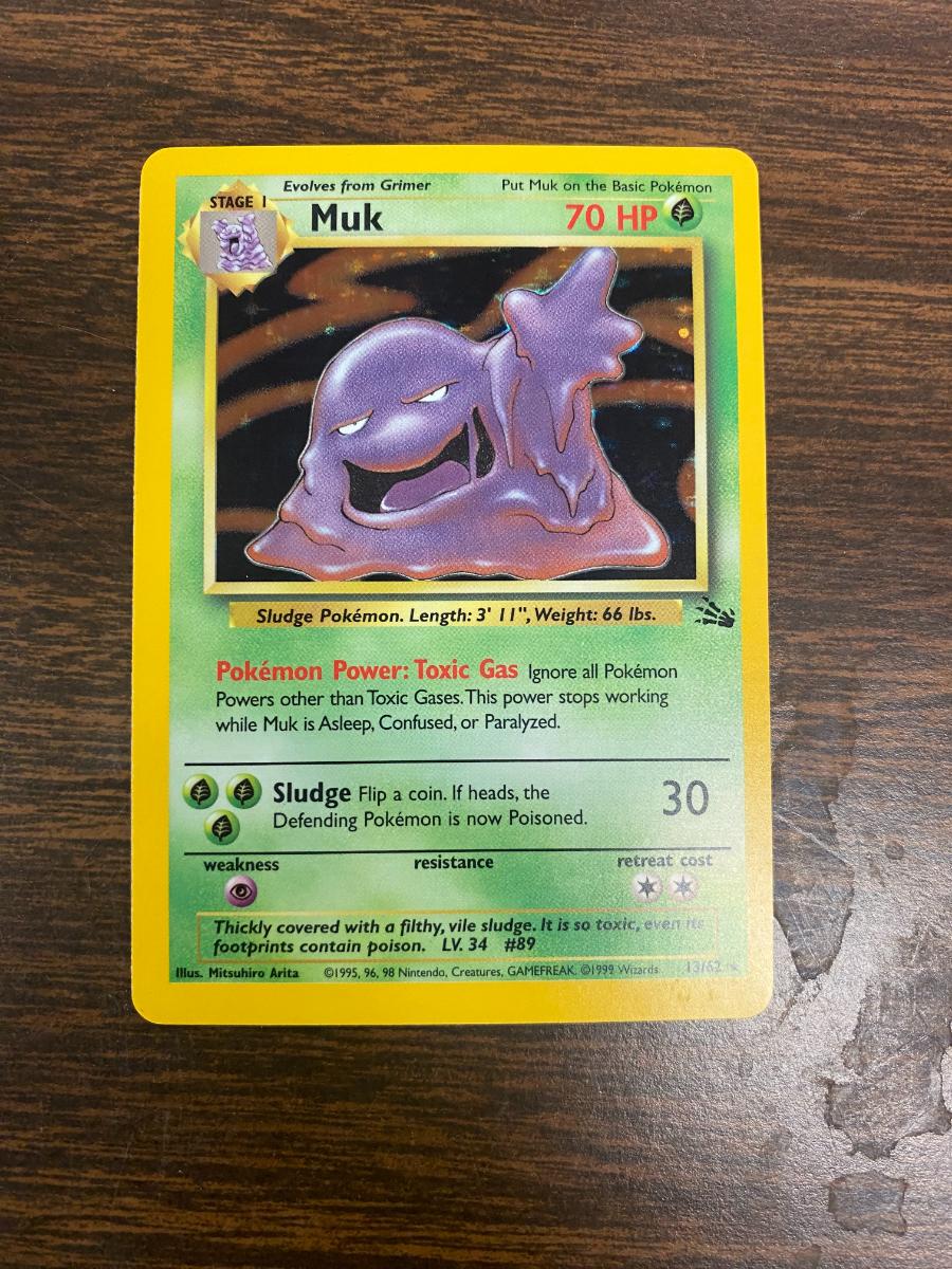 This is a Muk Pokemon card from the Fossil edition. Card number 13/62, with a rarity of Holo Rare. The card features 70 HP and includes moves like Sludge and Toxic Gas. The condition is light play, exhibiting minor wear consistent with use. A classic collectible card for enthusiasts.