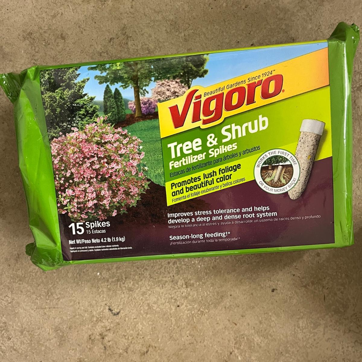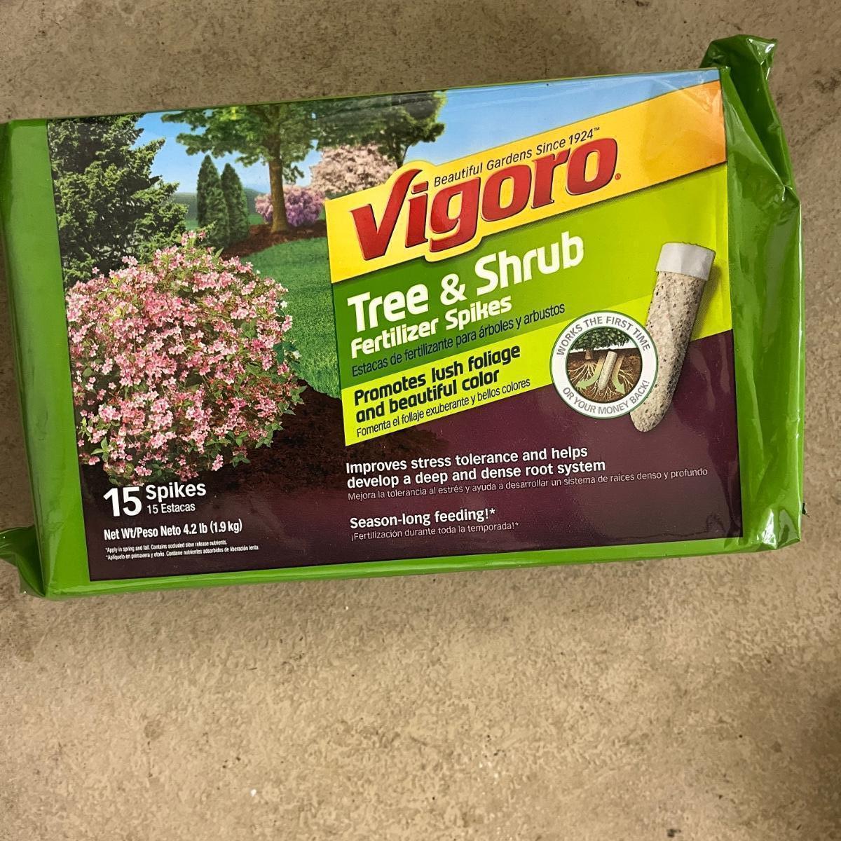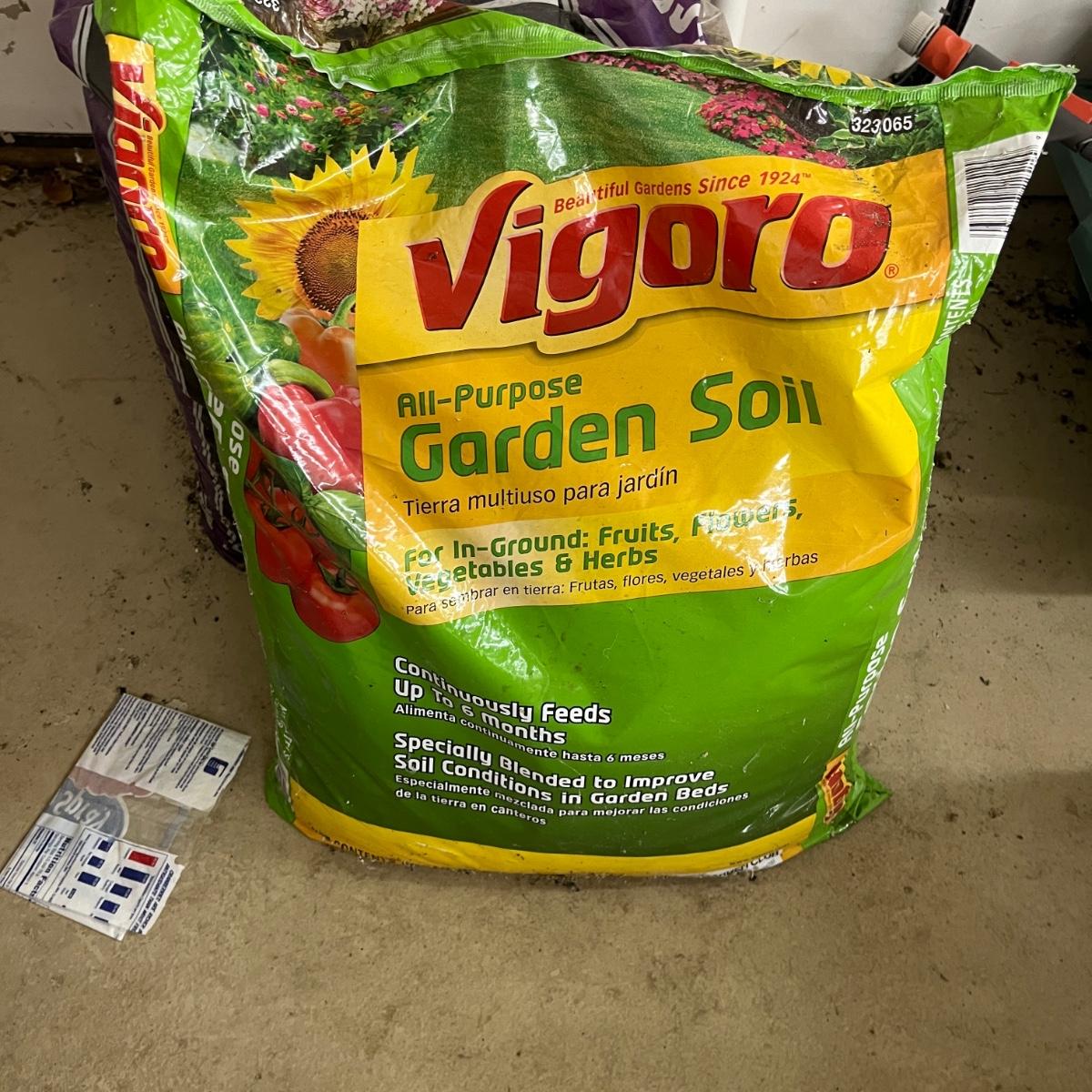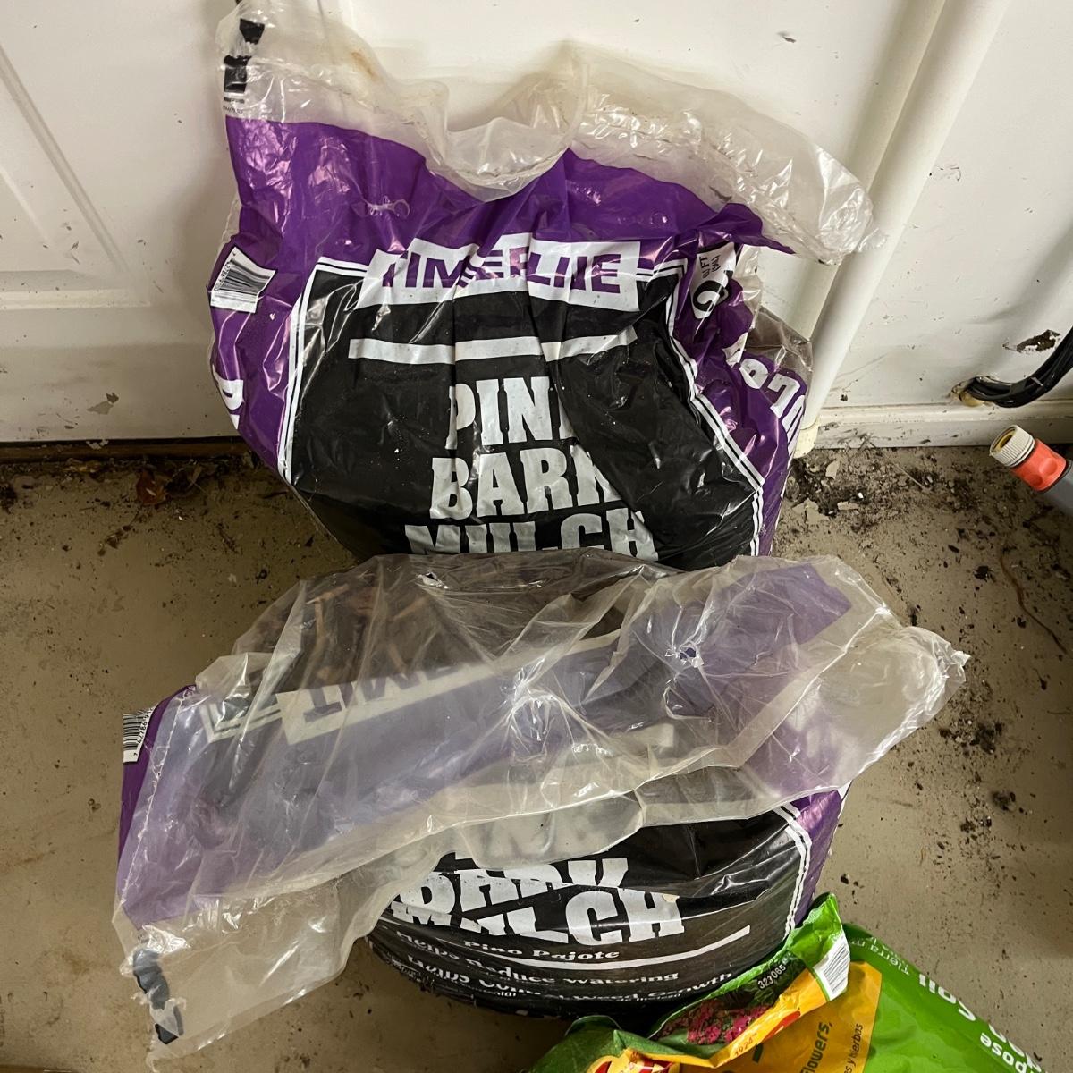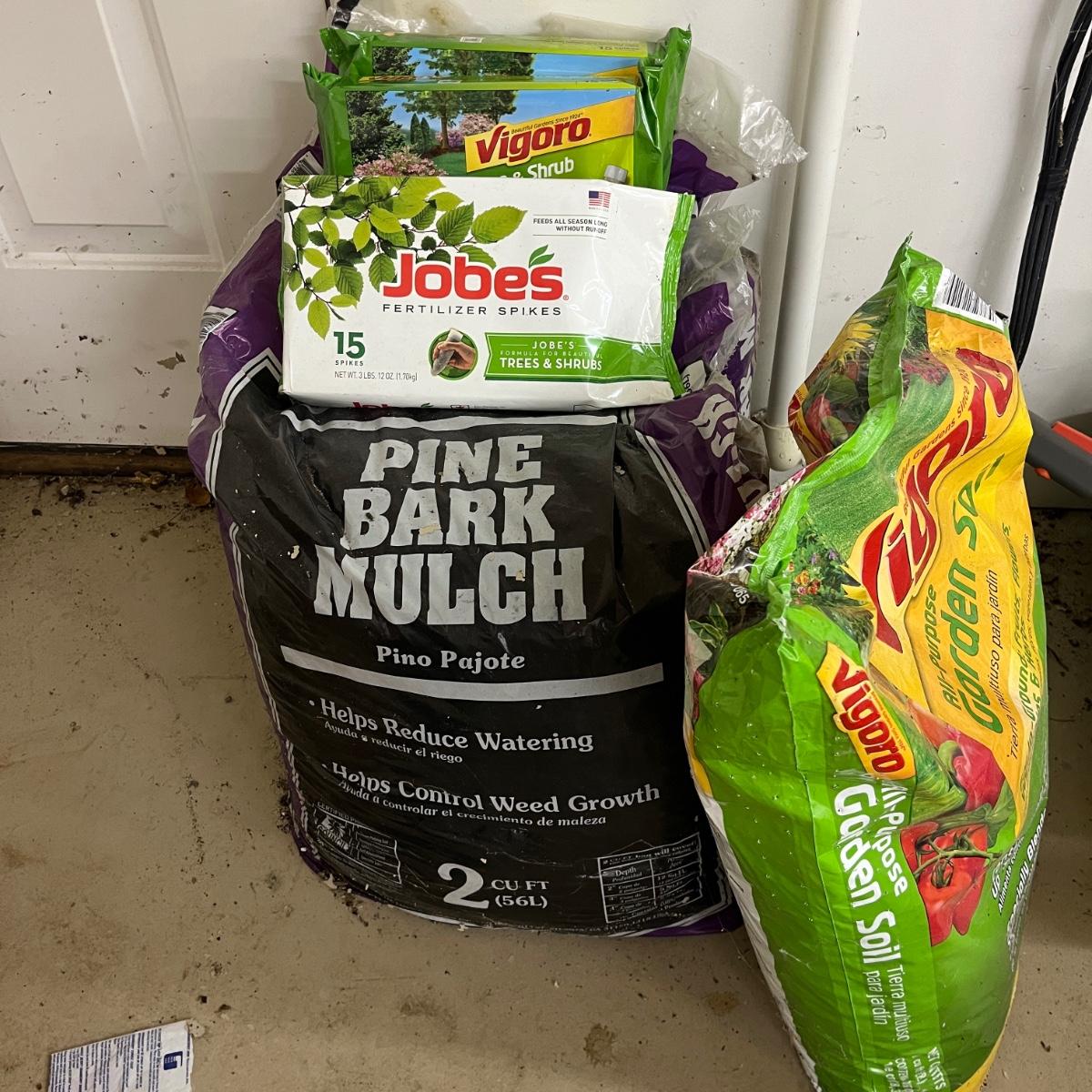 Lot includes two bags f pine bark mulch each bag is 2 cubic feet. Also includes one cubic foot of Vigore garden soil, two packs of Vigoro fertilizer spikes and one pack of Jones fertilizer spikes.