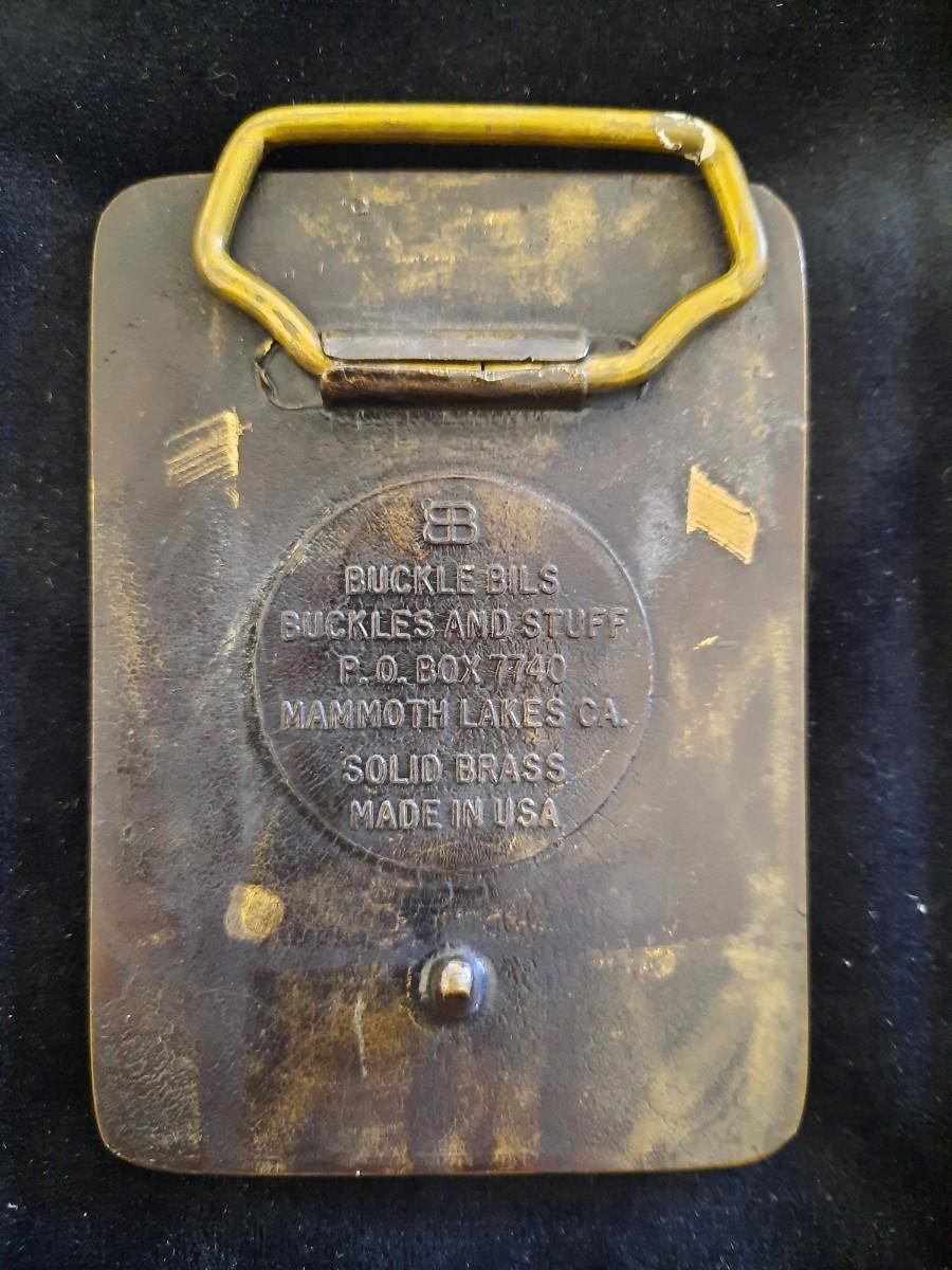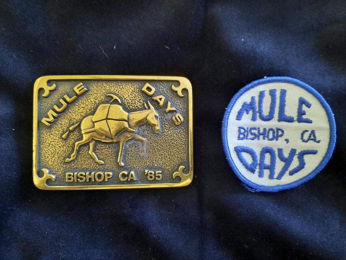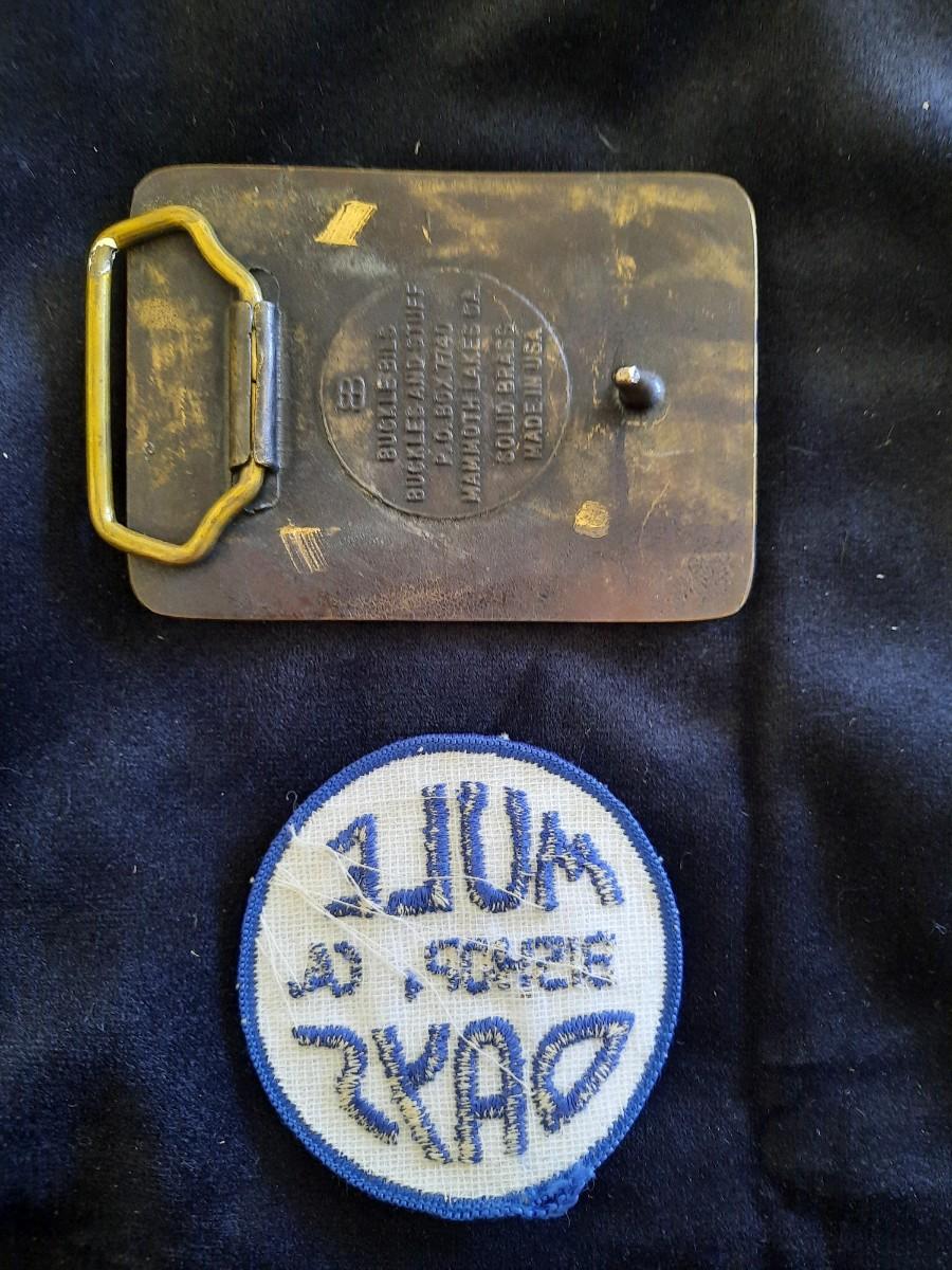 This is a solid brass belt buckle from 1985 and a sew on patch from an annual celebration in Bishop, California.