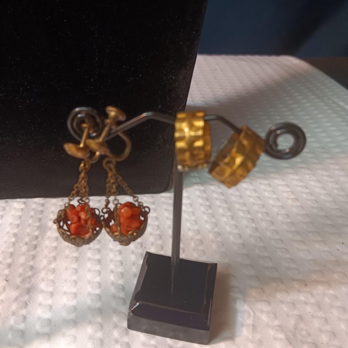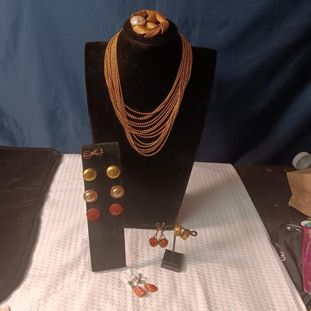 MULTI CHAIN NECKLACE, BROOCH, SMALL BOW PIN AND CLIP ON EARRINGS
