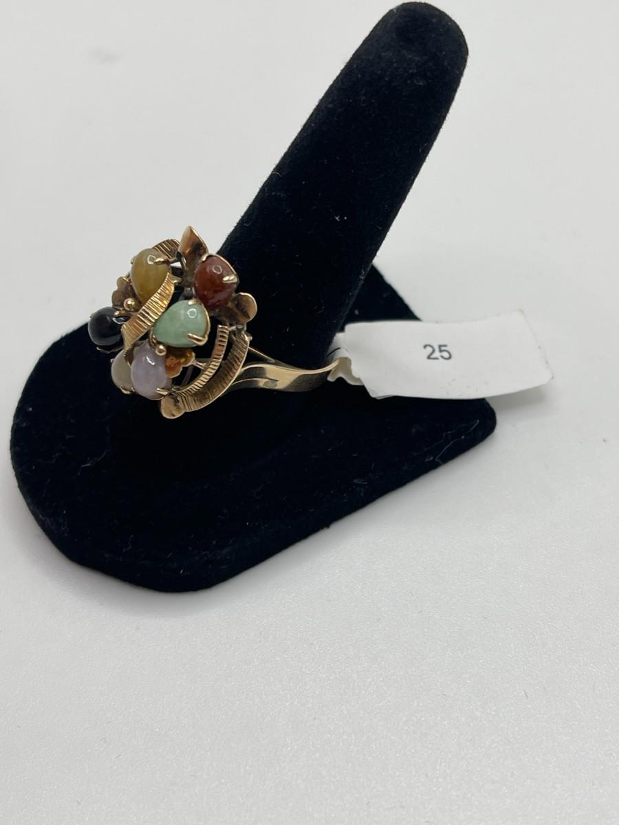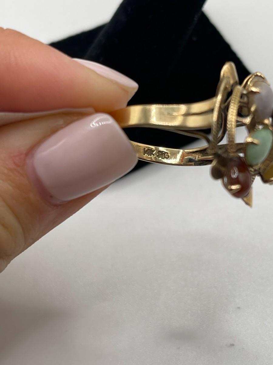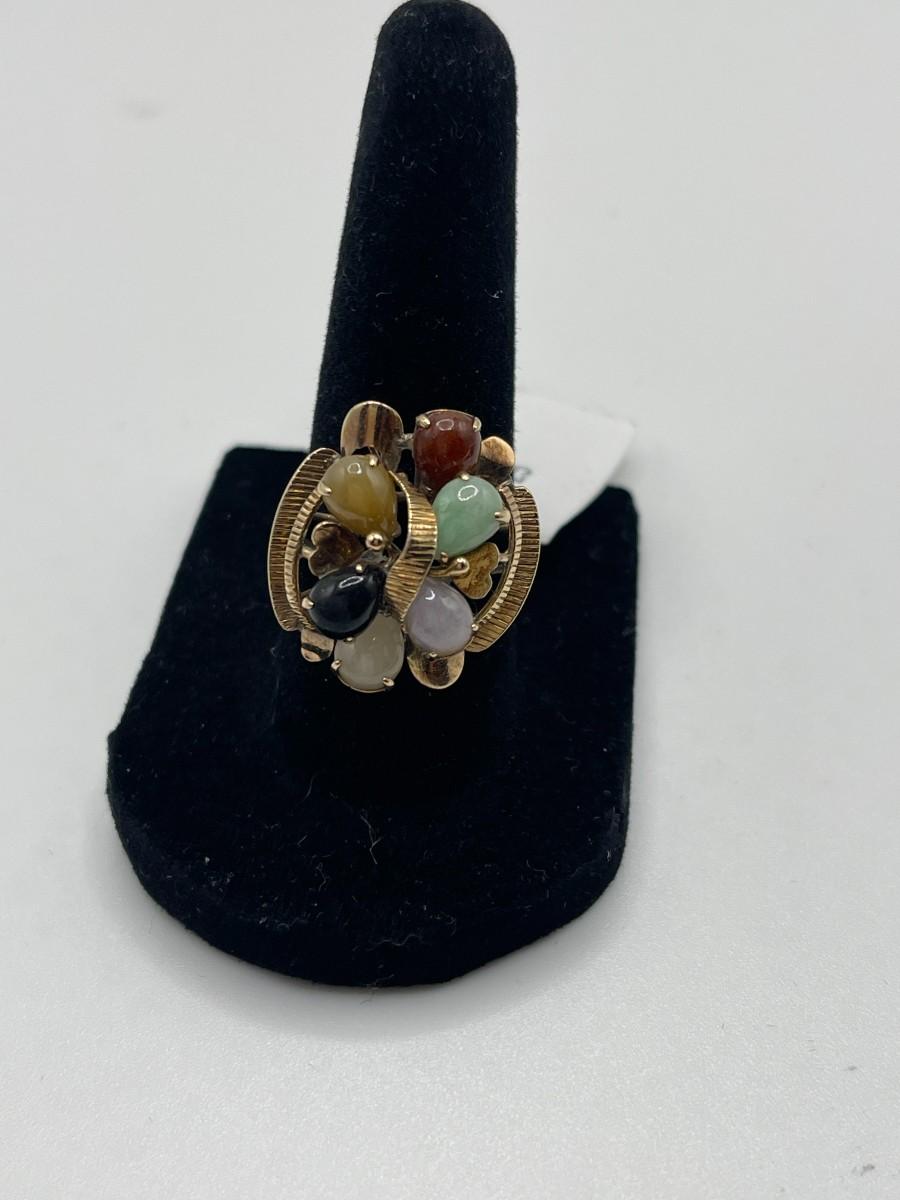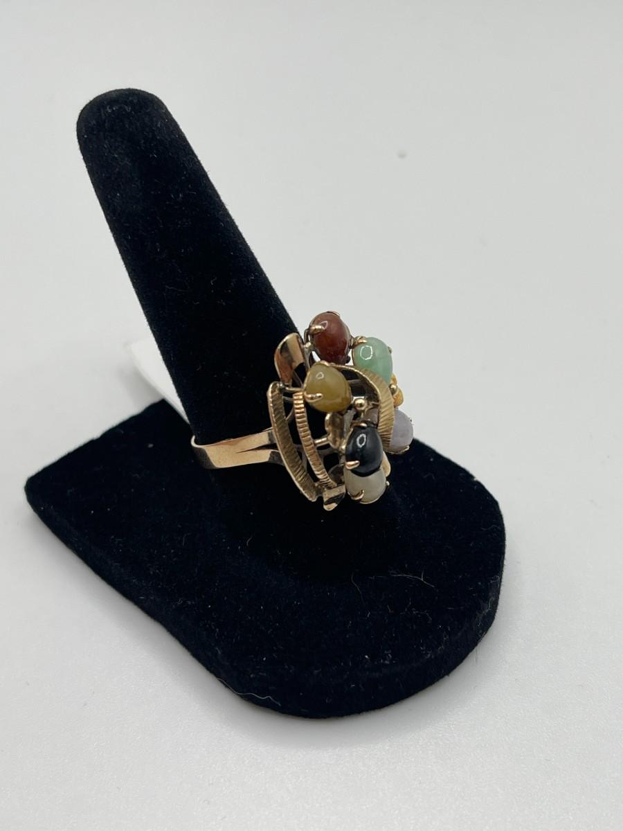 Multi color pear shaped jade ring in 14K gold. Has a bent shank and some broken solder points. Marked 14K. Size 8.25. 4.96 Grams.