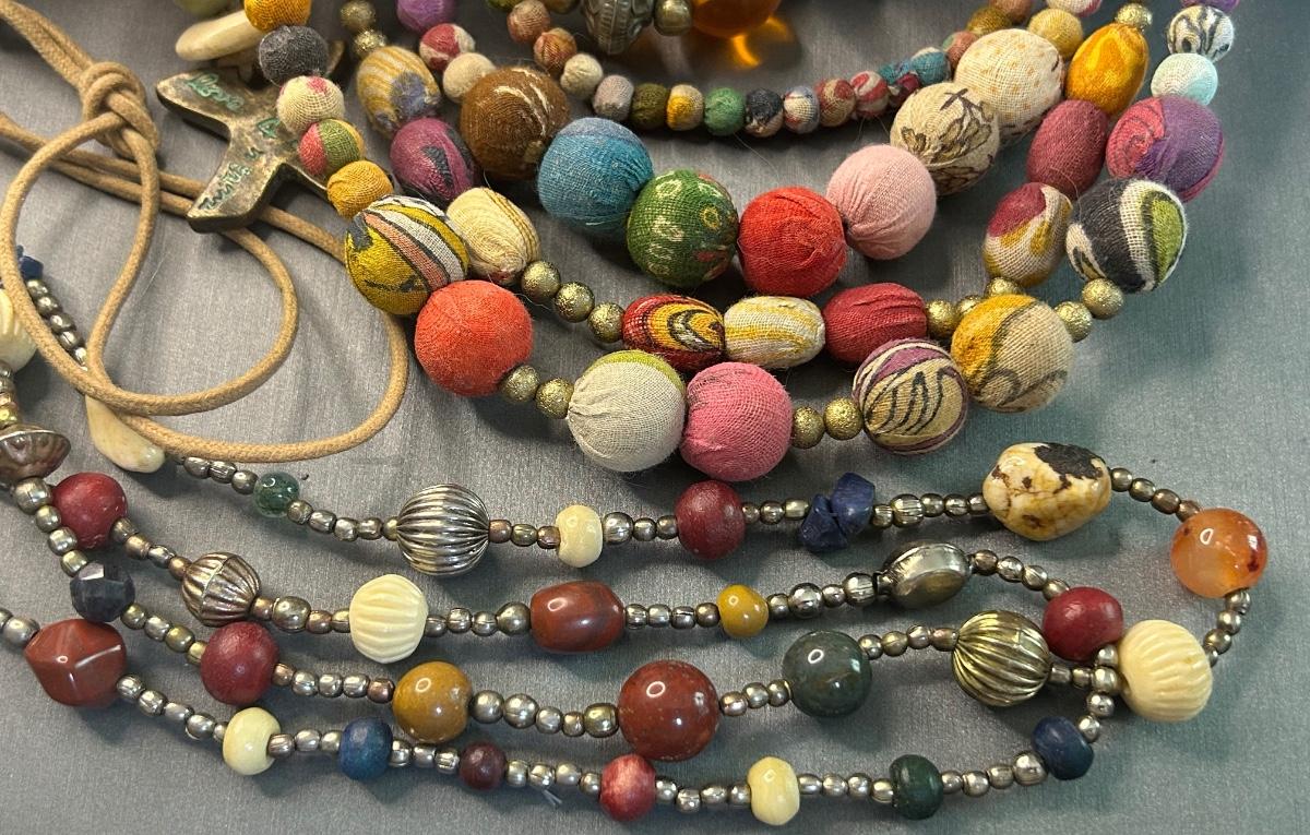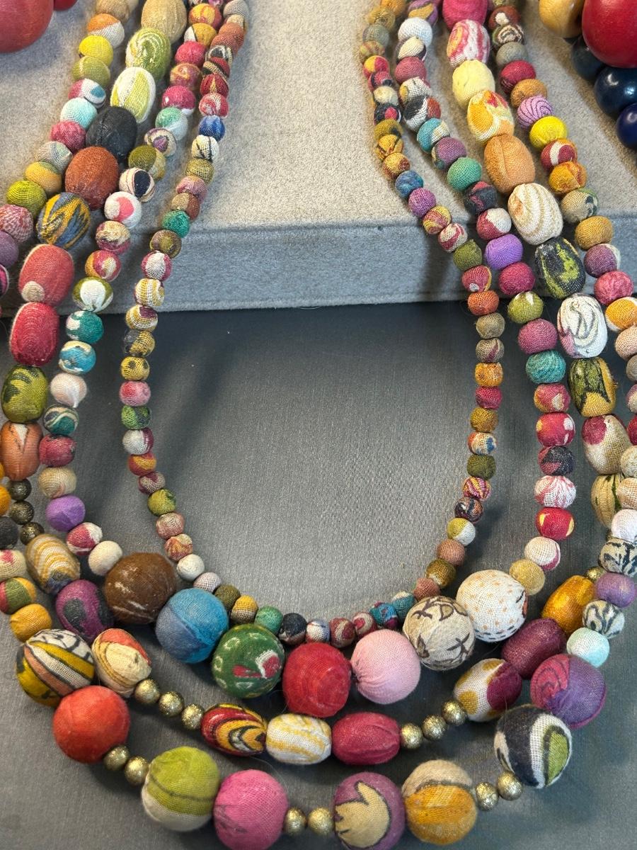 Three have stones in them as well. The center 4 strand is fabric covered which is so adorable!! The very large ball will likely be used for crafts.