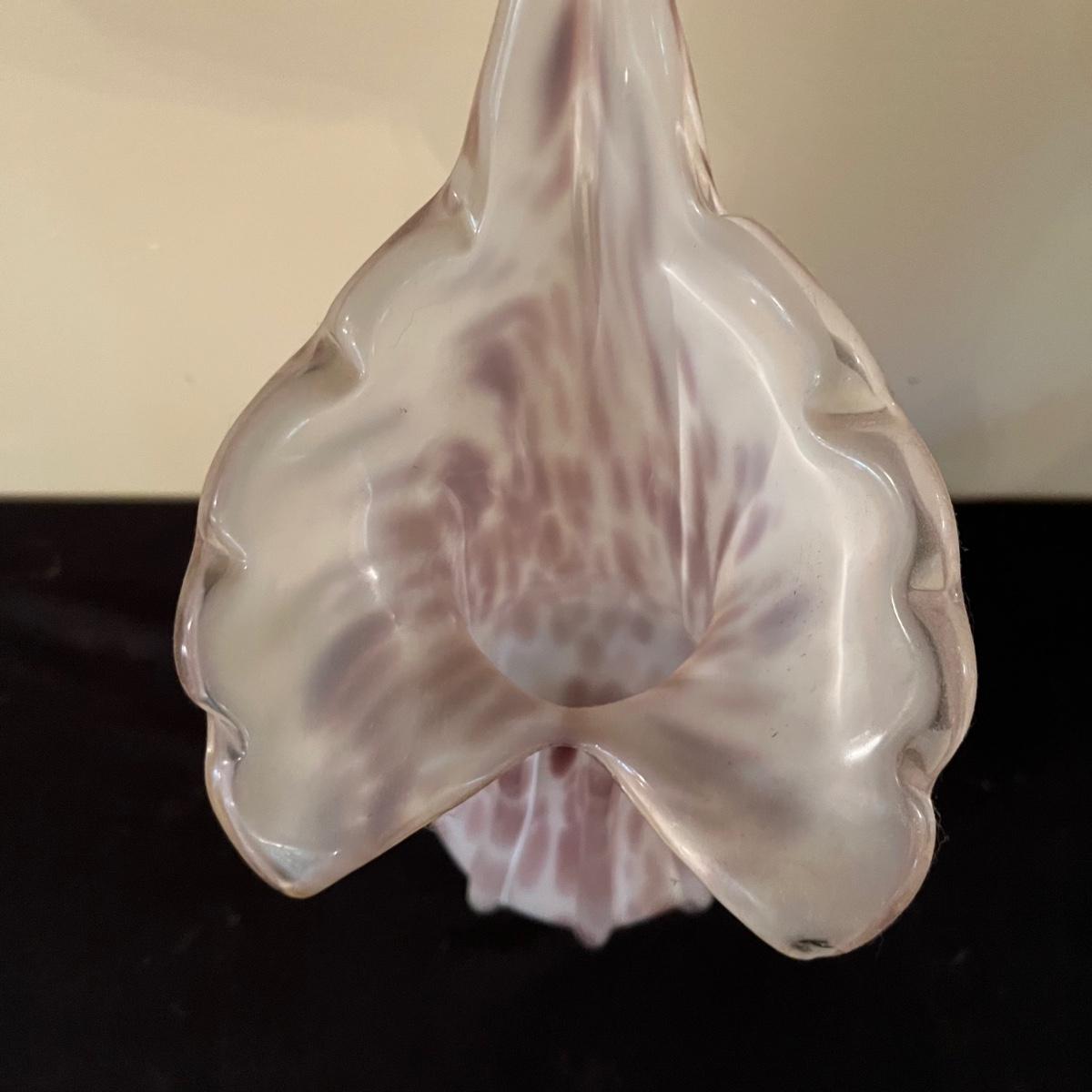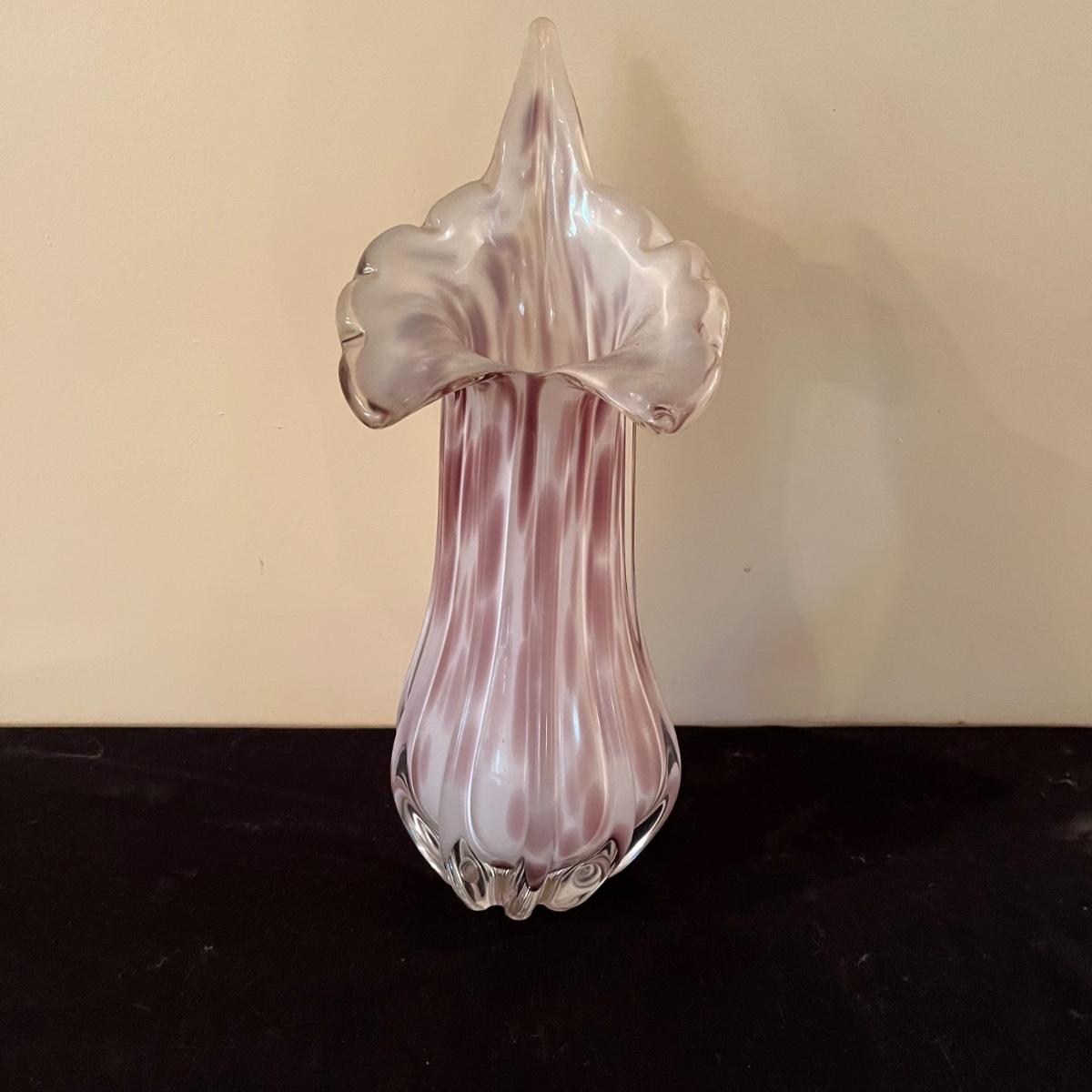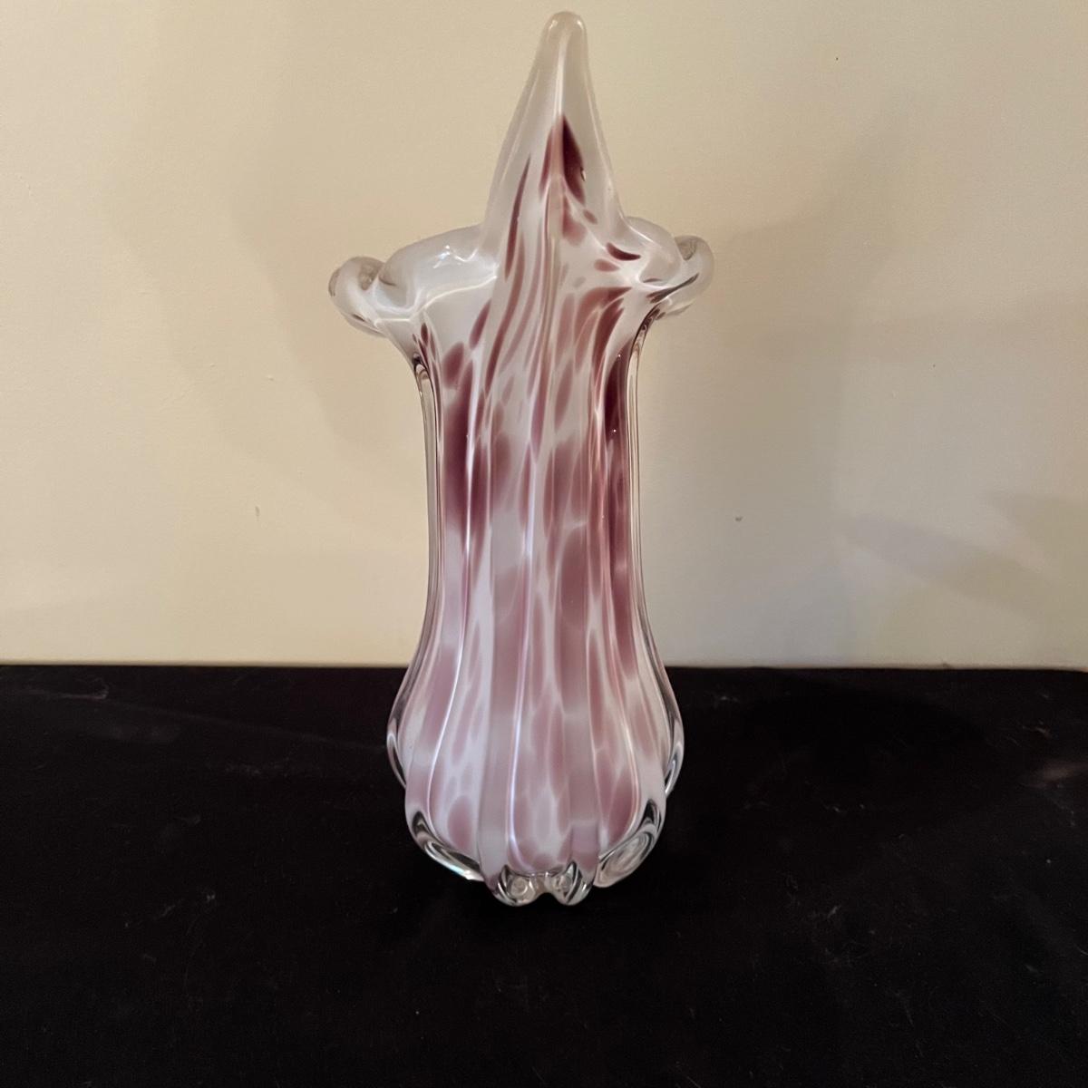 This stunning multi colored heavy glass vase is in great condition with no cracks or chips and measures 6” x 9” x 16”.