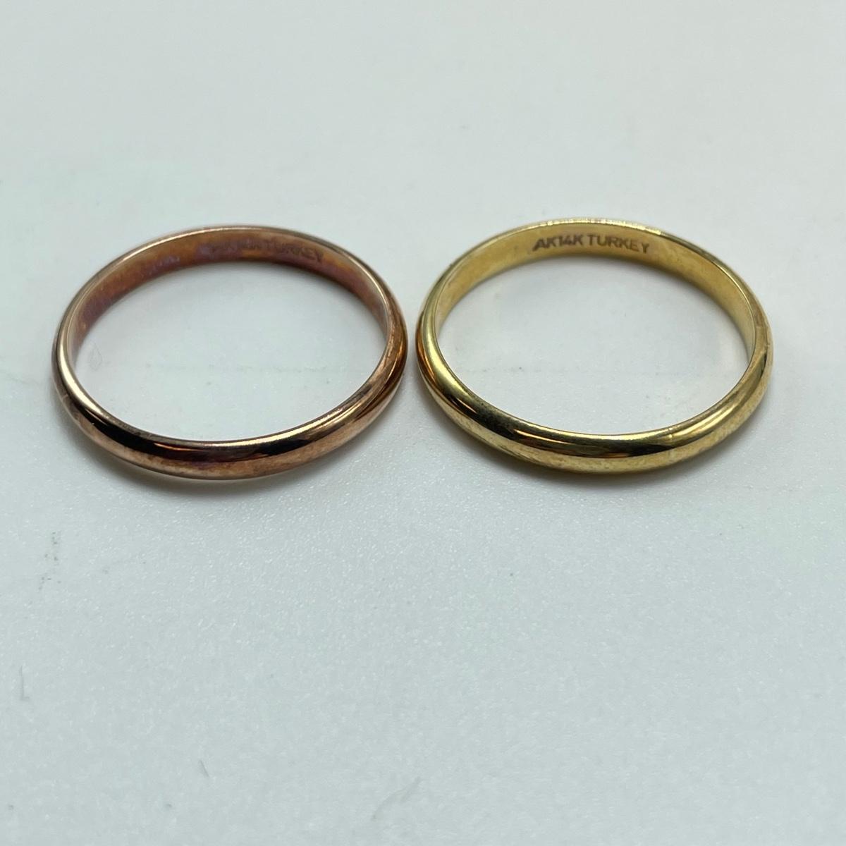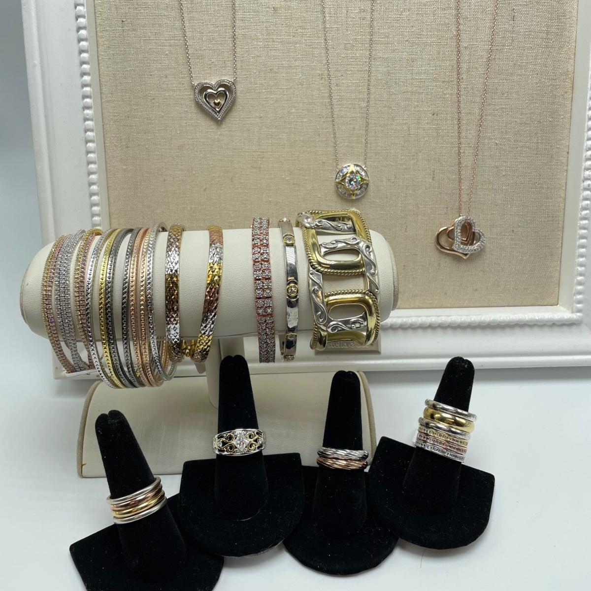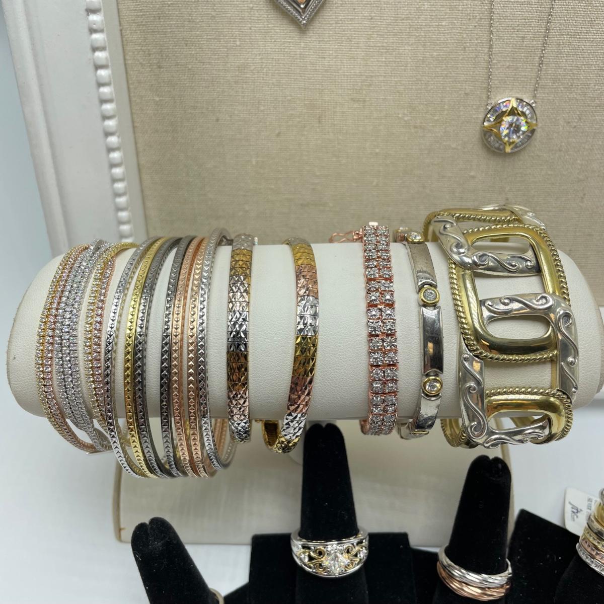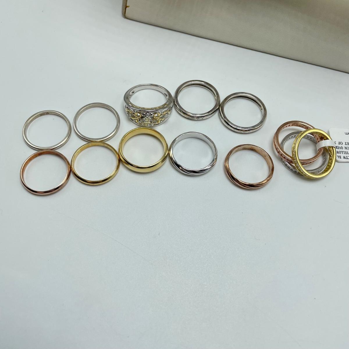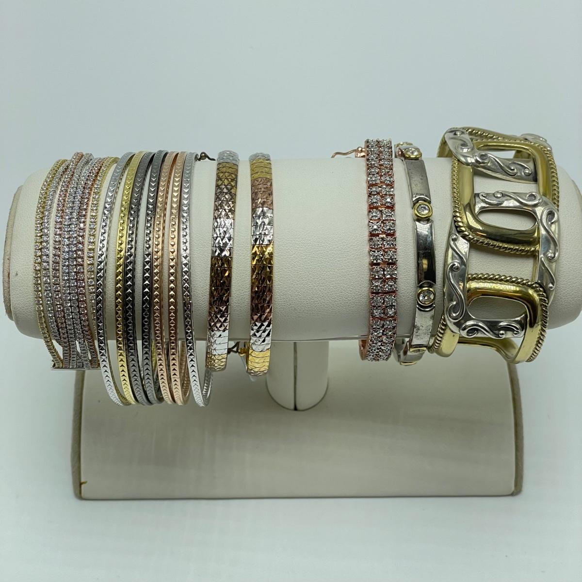Combination of yellow, white and rose colored metal jewelry. Lot includes three necklaces, the longest chain shown in photos is about 21”, 13 bracelets including a pack of seven bangles with tag and 13 rings. Some markings and stamps are shown in photos. Three band rings are stamped "AK 18K Turkey" and one "AK 14K Turkey". The rose colored bracelet has a Thai stamp alongside an illegible stamp. See images. All sales are final. No returns or refunds. Please bid accordingly.