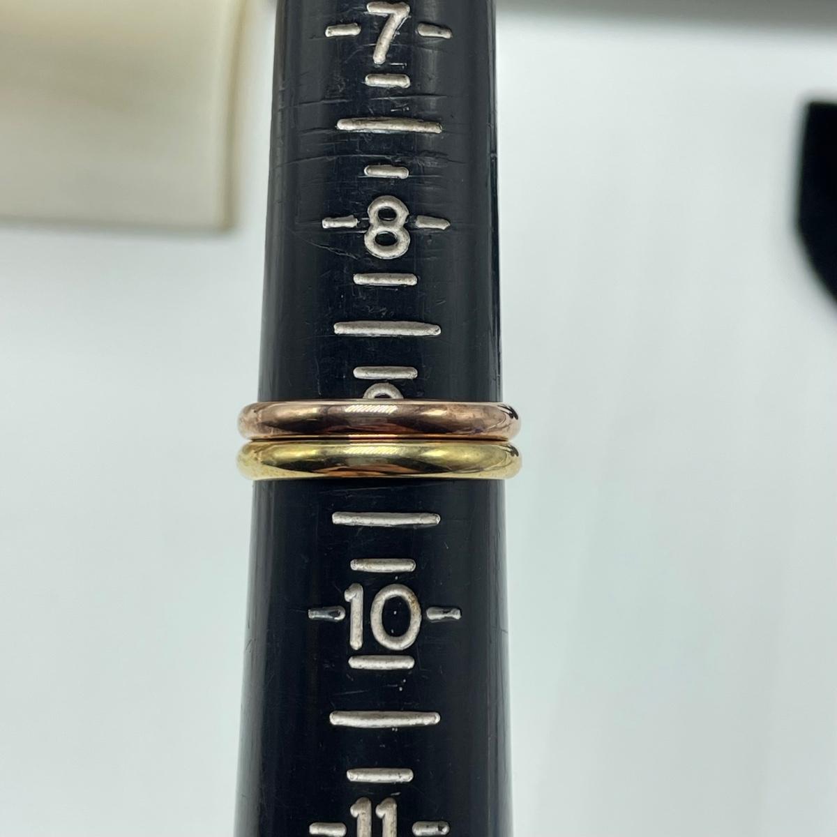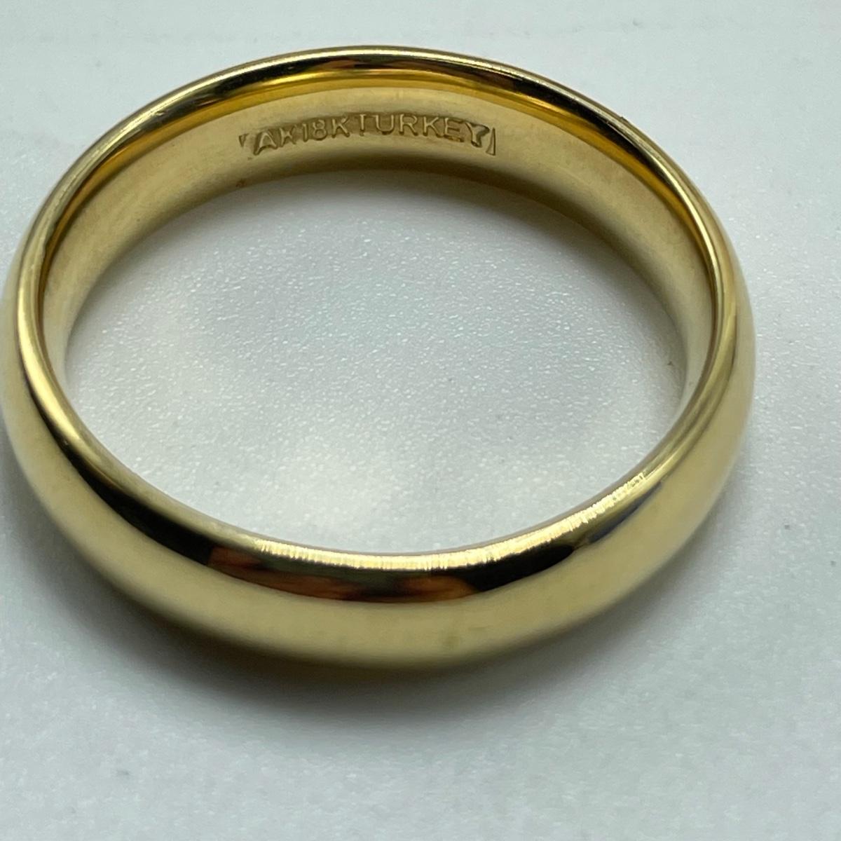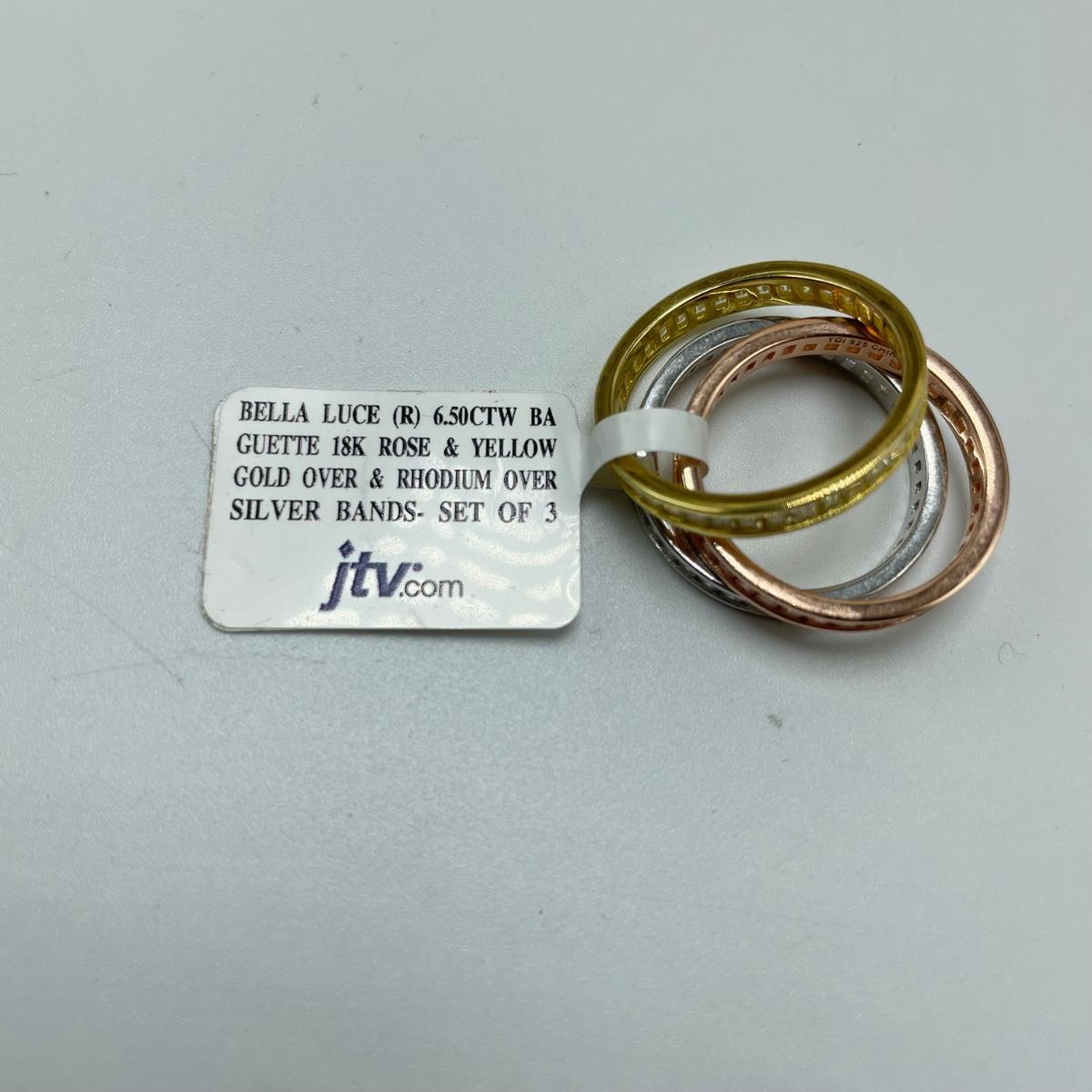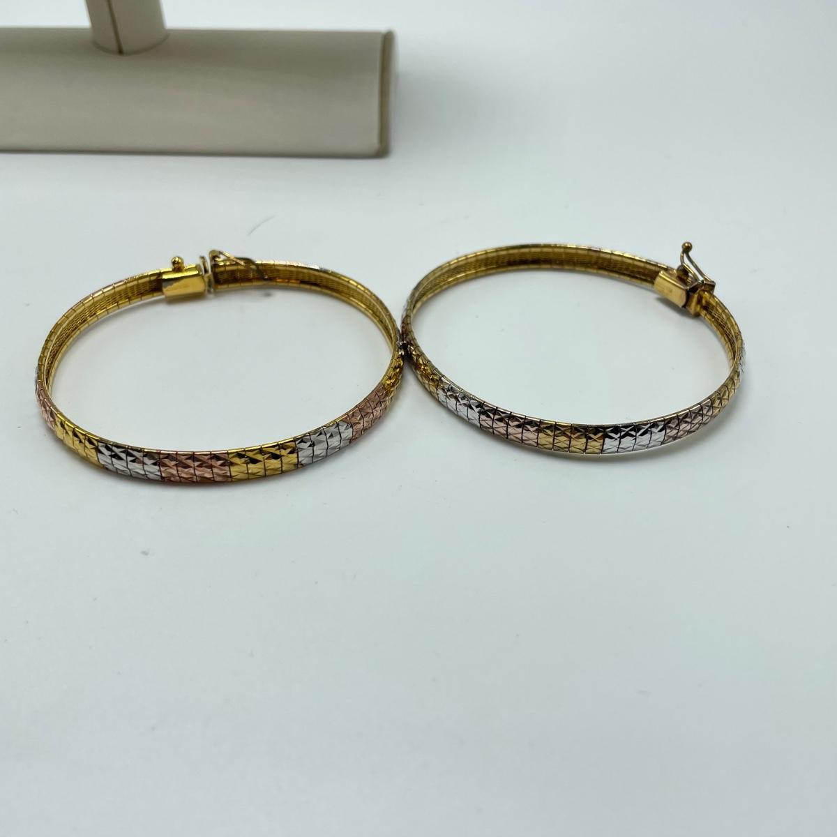 Combination of yellow, white and rose colored metal jewelry. Lot includes three necklaces, the longest chain shown in photos is about 21”, 13 bracelets including a pack of seven bangles with tag and 13 rings. Some markings and stamps are shown in photos. Three band rings are stamped "AK 18K Turkey" and one "AK 14K Turkey". The rose colored bracelet has a Thai stamp alongside an illegible stamp. See images. All sales are final. No returns or refunds. Please bid accordingly.