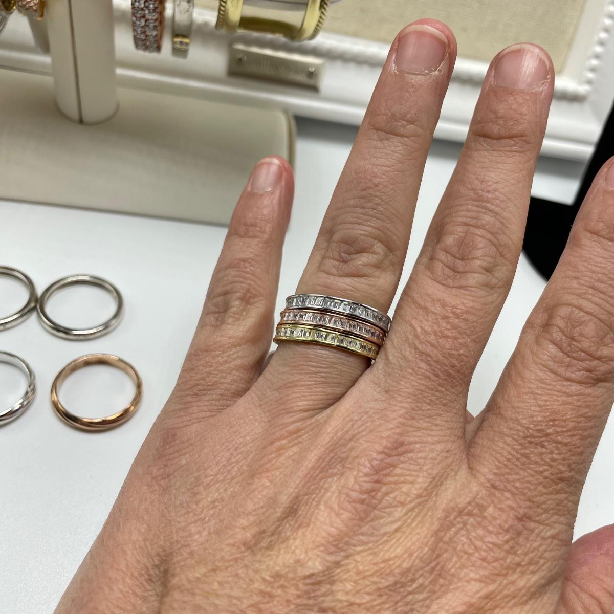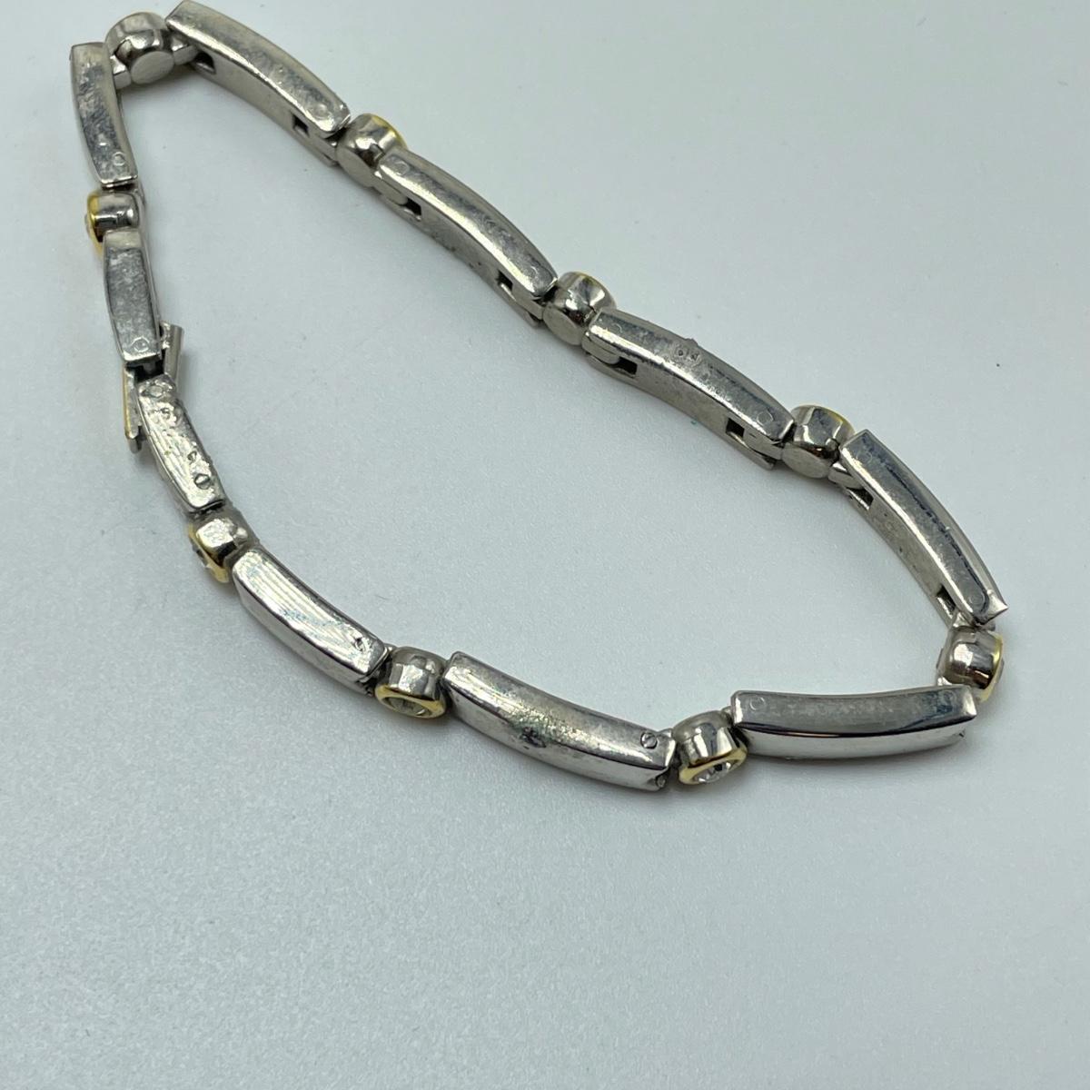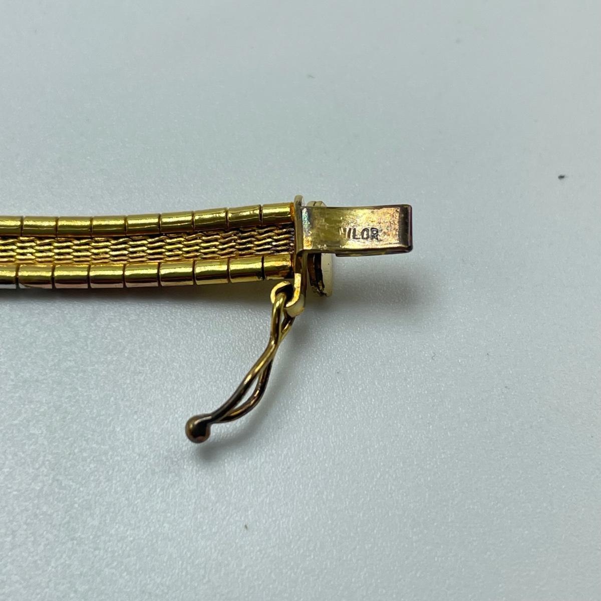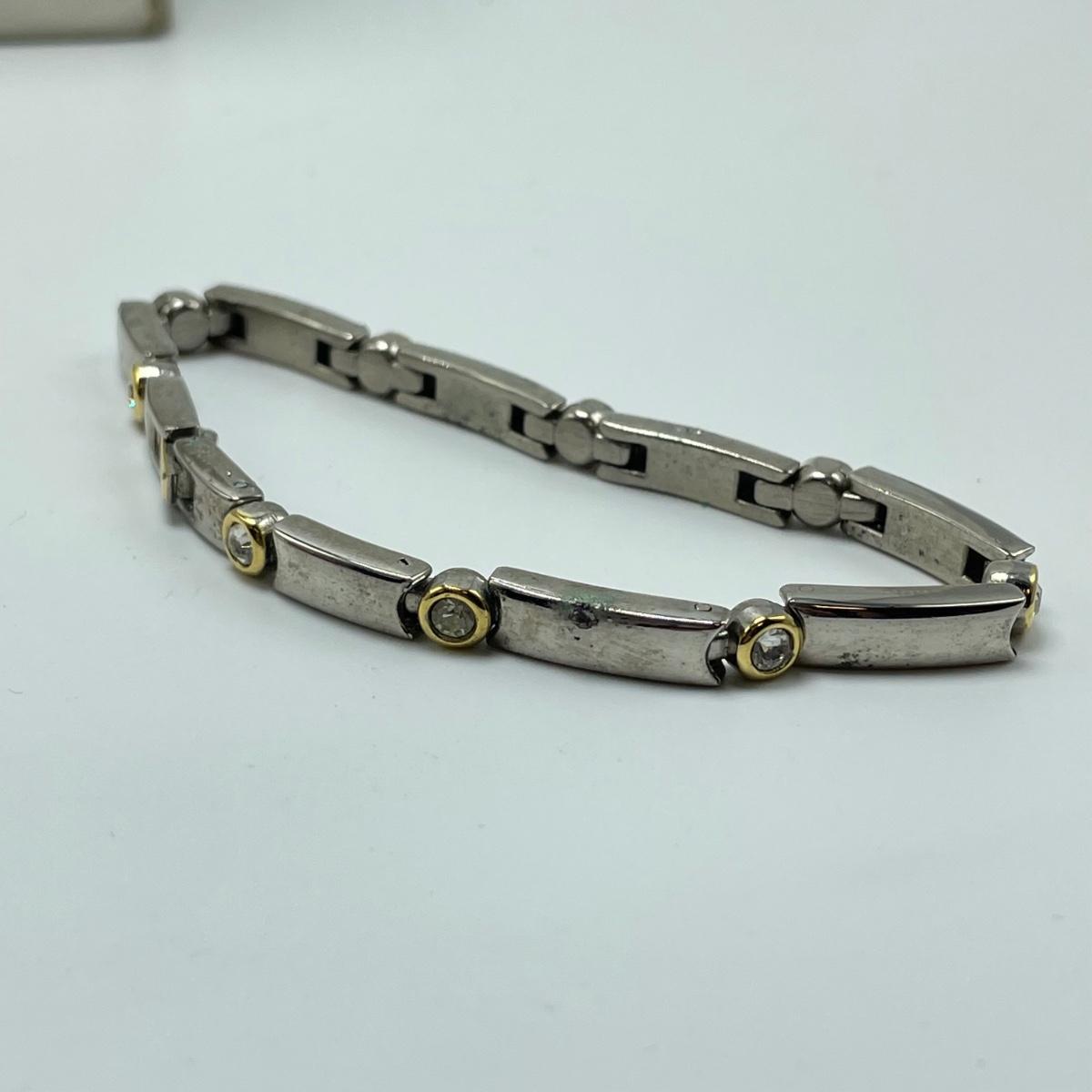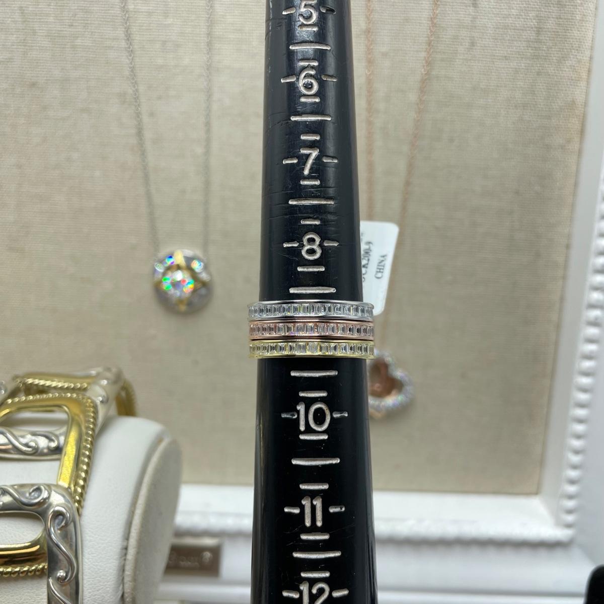 Combination of yellow, white and rose colored metal jewelry. Lot includes three necklaces, the longest chain shown in photos is about 21”, 13 bracelets including a pack of seven bangles with tag and 13 rings. Some markings and stamps are shown in photos. Three band rings are stamped "AK 18K Turkey" and one "AK 14K Turkey". The rose colored bracelet has a Thai stamp alongside an illegible stamp. See images. All sales are final. No returns or refunds. Please bid accordingly.