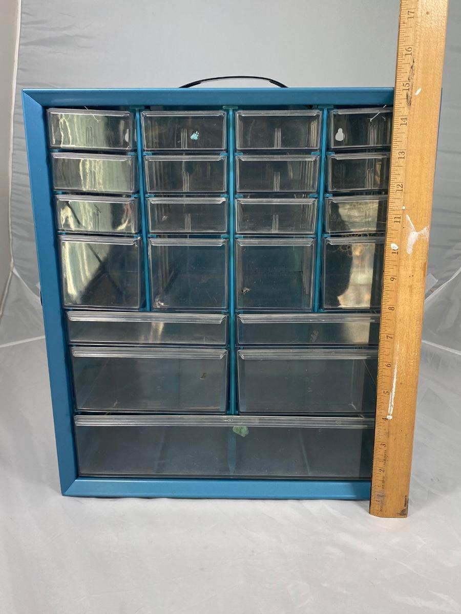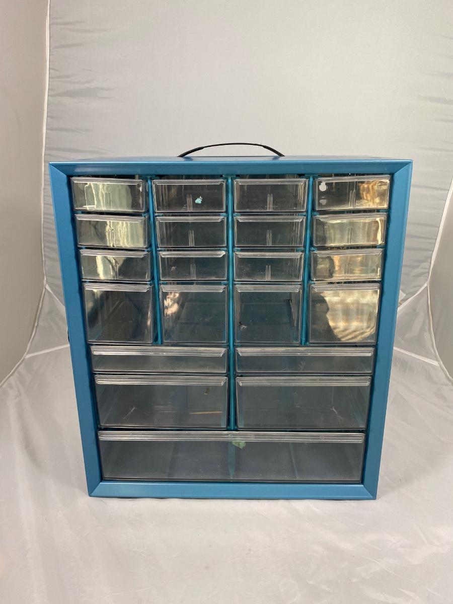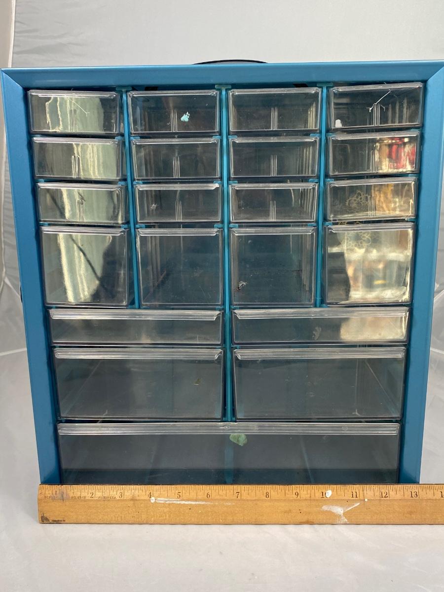 Multi drawer organizer. Metal body with plastic drawers, handle on top. In good used condition, great for craft supplies, hardware, and more.