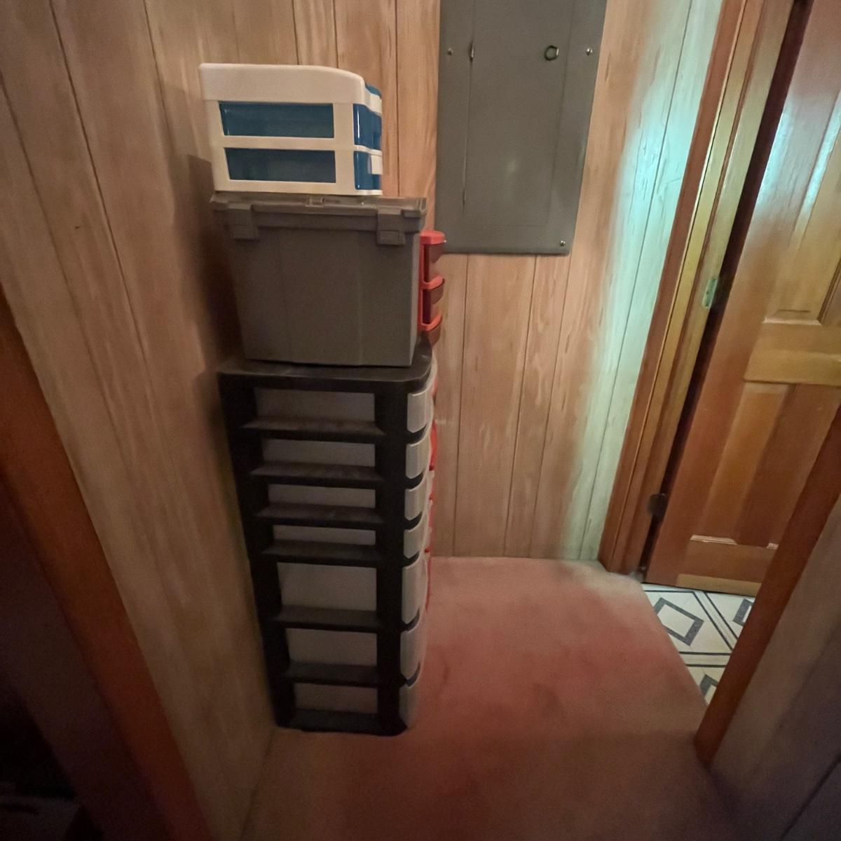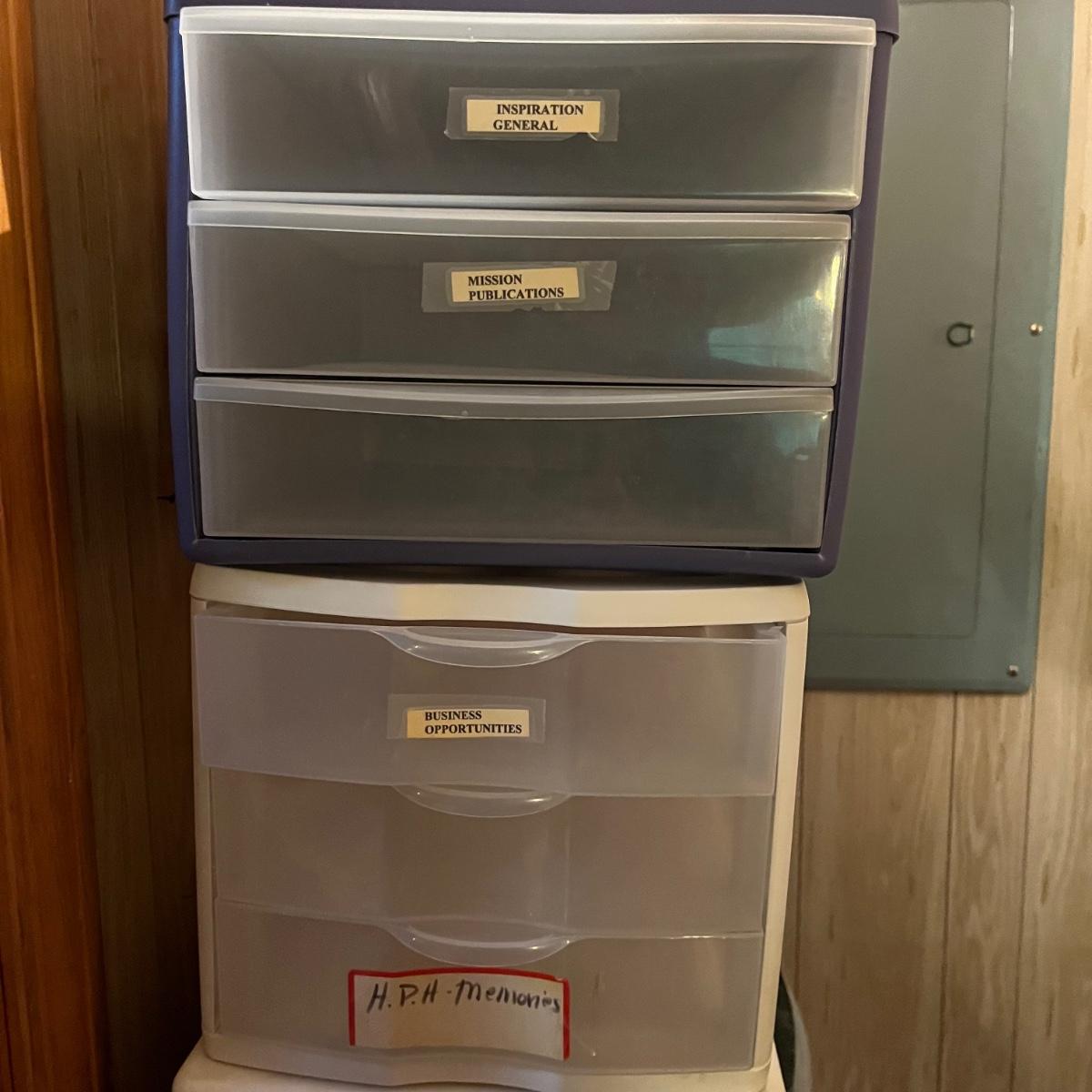 Lot includes a plethora of plastic containers with drawers in a variety of sizes. Largest stacked unit measures 12” x 14” x 40”H. Please see photos for inventory.