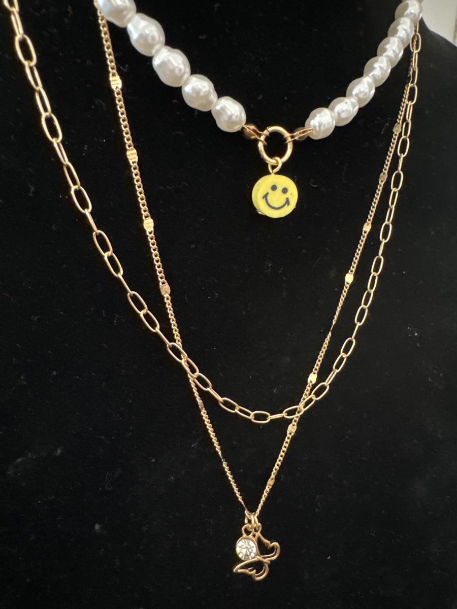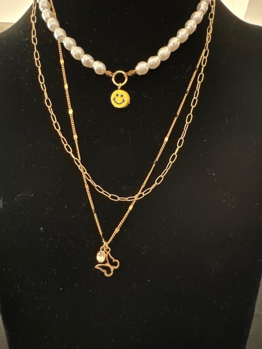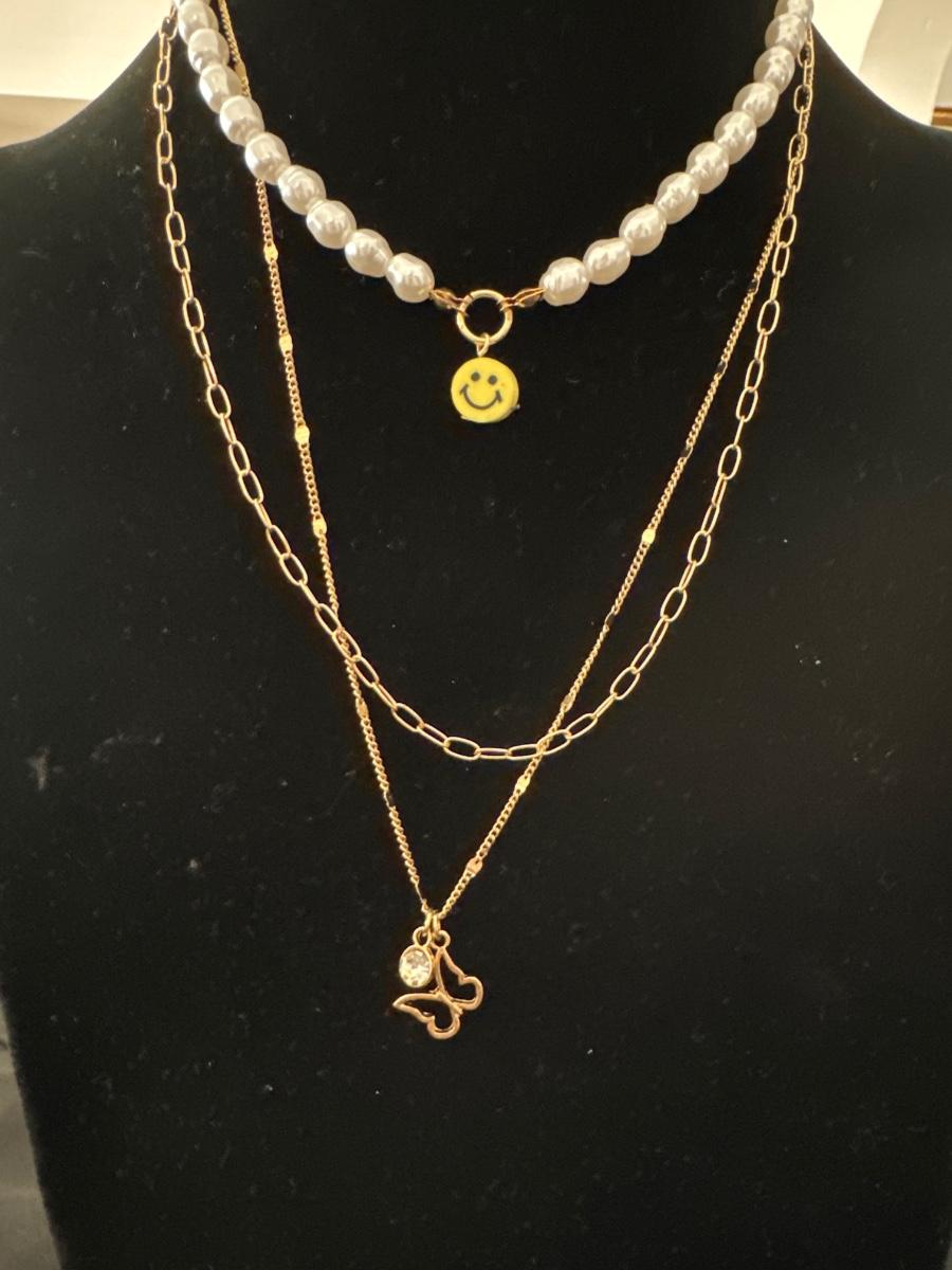 Multi layered, gold, toned, and pearl necklace with butterfly pendant