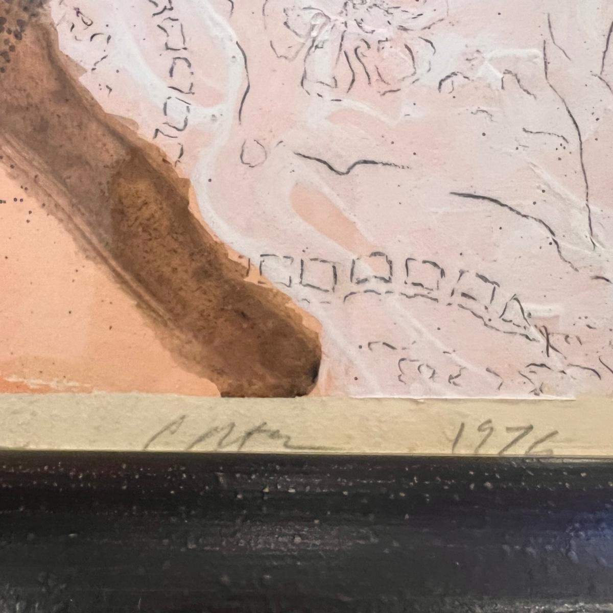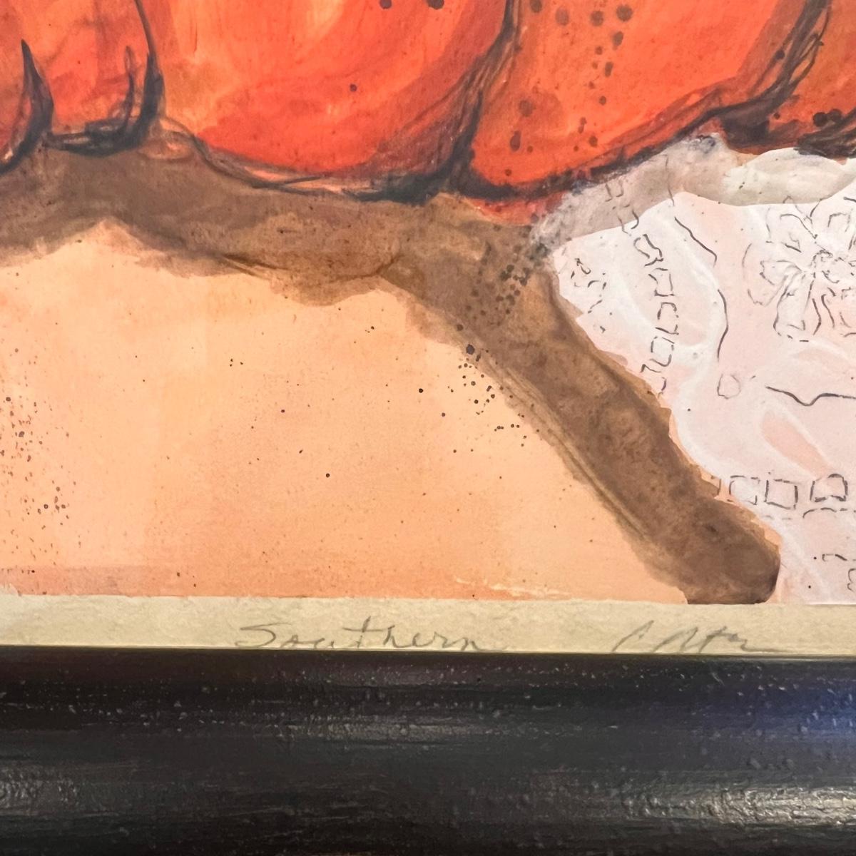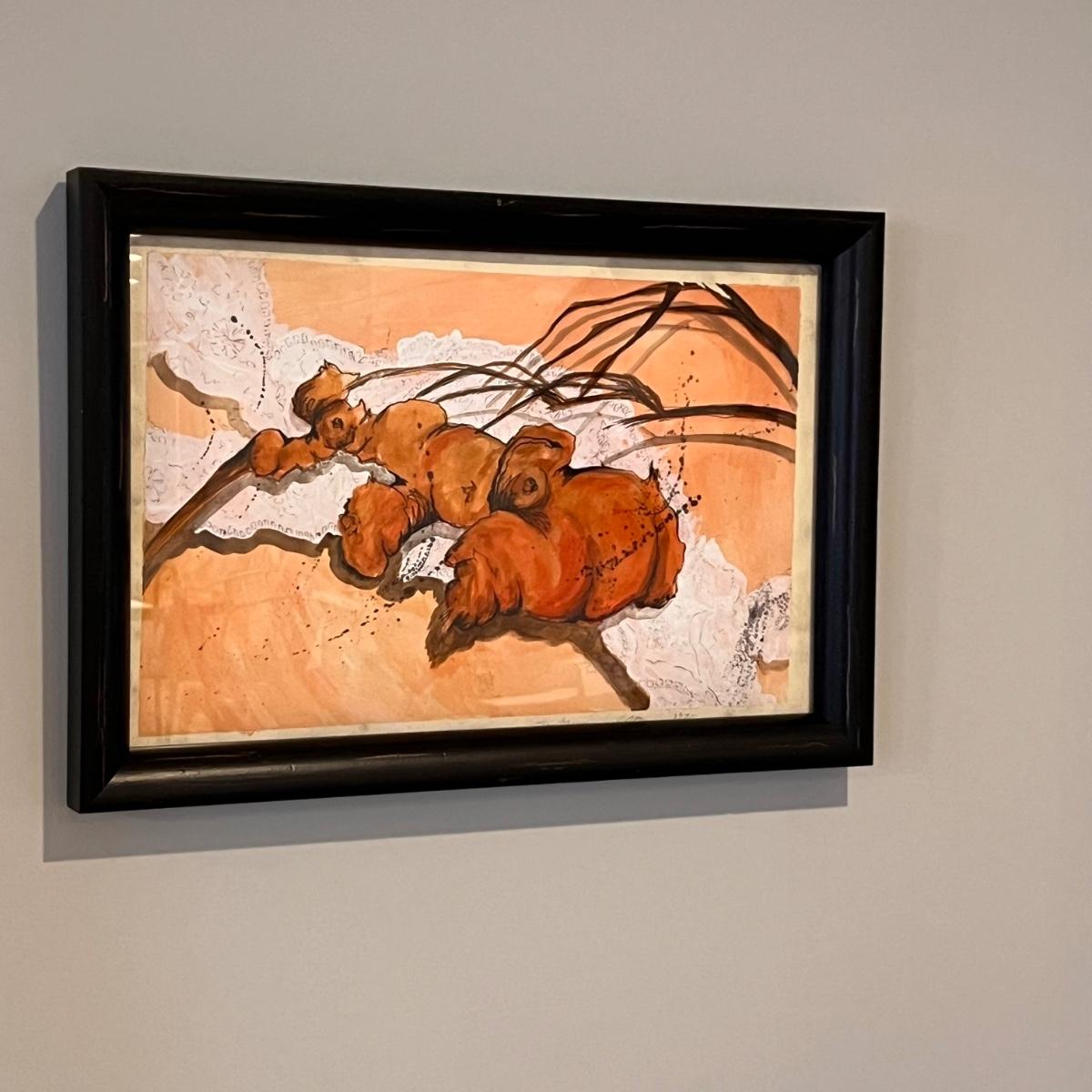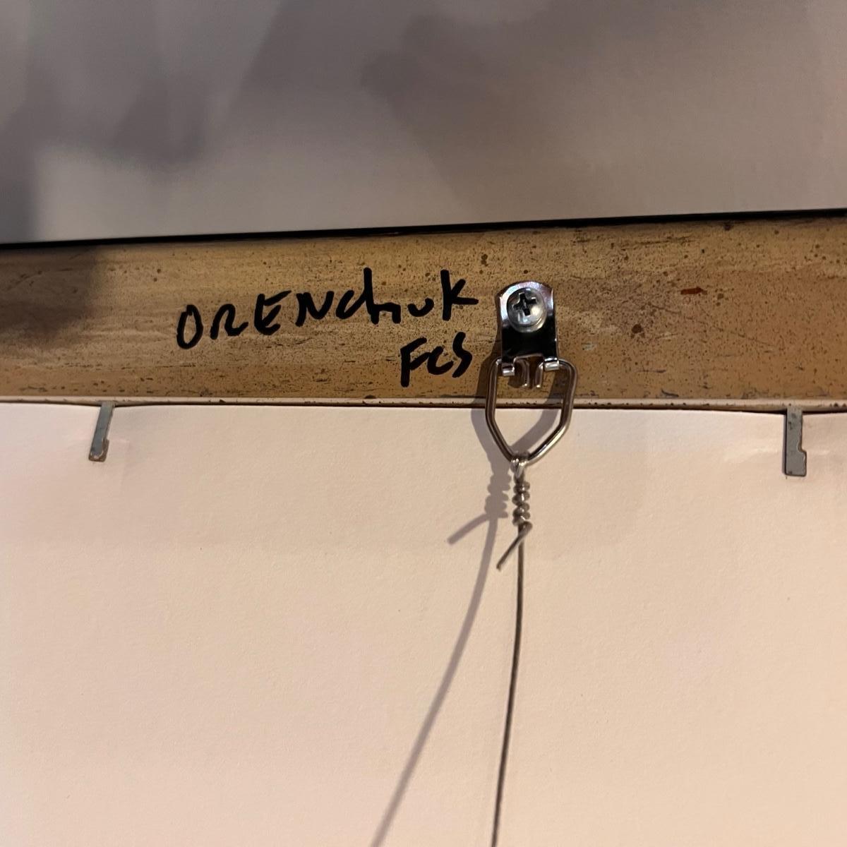 This unique painting appears to be mainly watercolor with ink outlines and doodles. It is pencil signed but artist name is indecipherable. Back of frame has Orenchuk written in pen. The black wood frame measures. Art is under glass and measures 24.4” x 17”H.