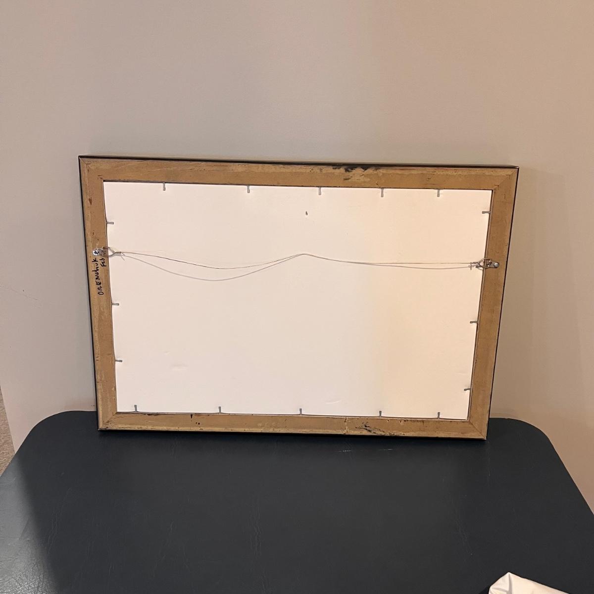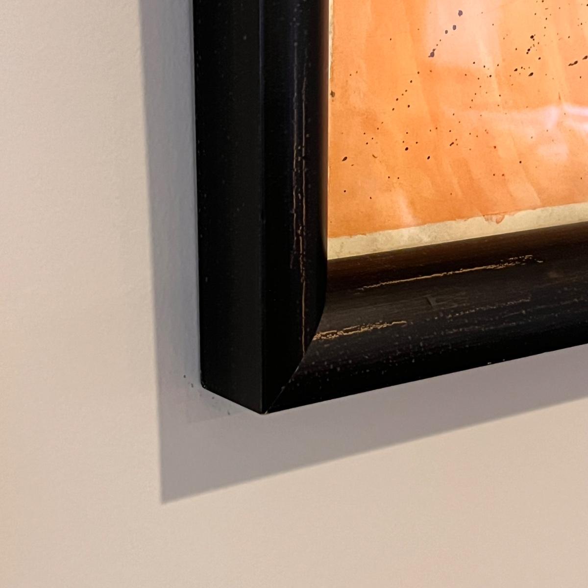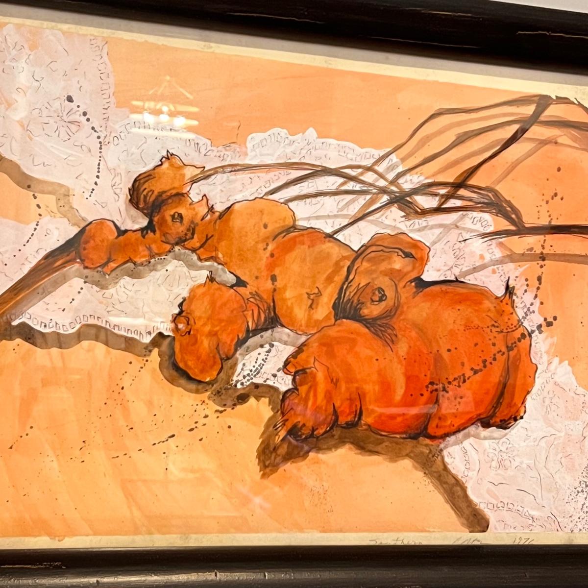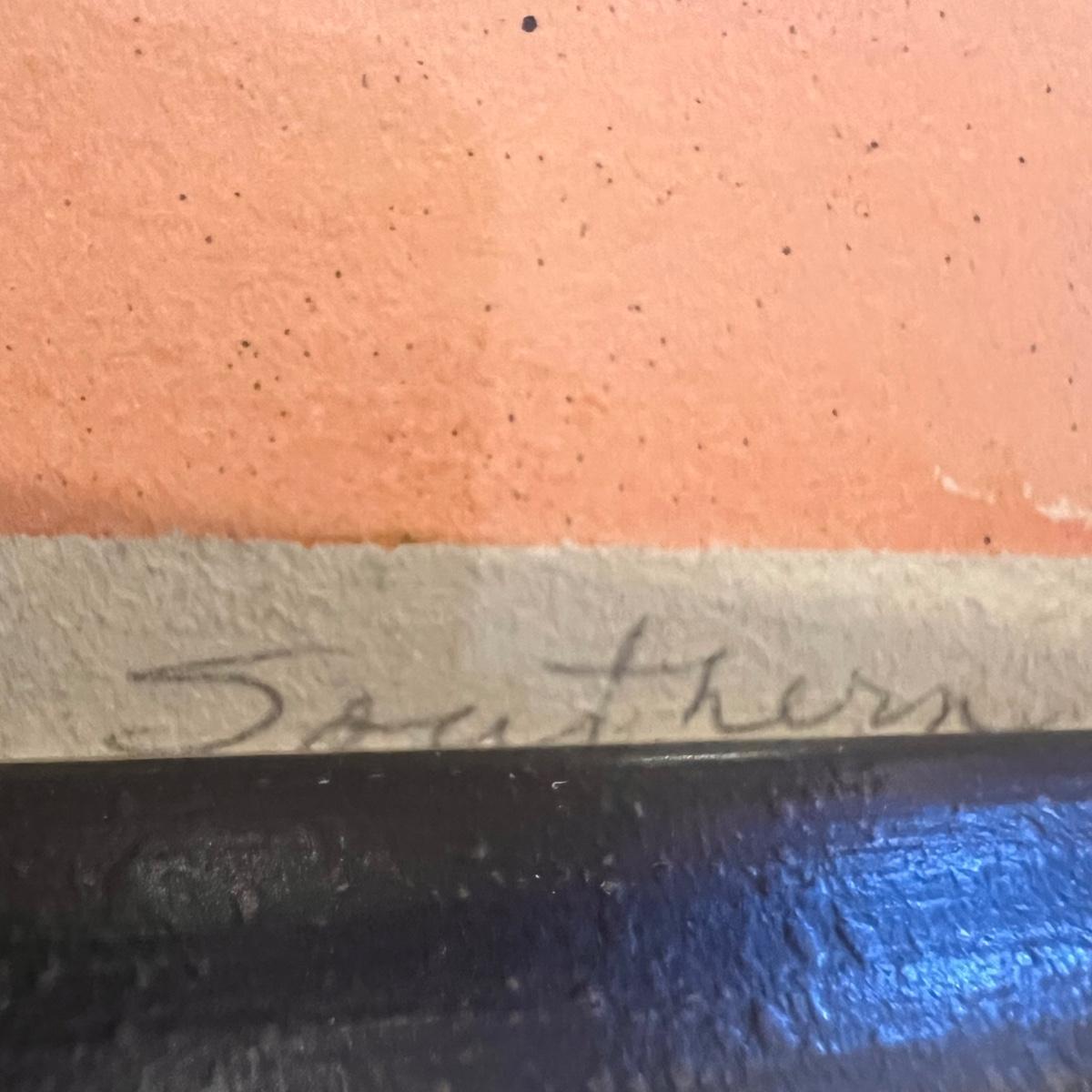 This unique painting appears to be mainly watercolor with ink outlines and doodles. It is pencil signed but artist name is indecipherable. Back of frame has Orenchuk written in pen. The black wood frame measures. Art is under glass and measures 24.4” x 17”H.