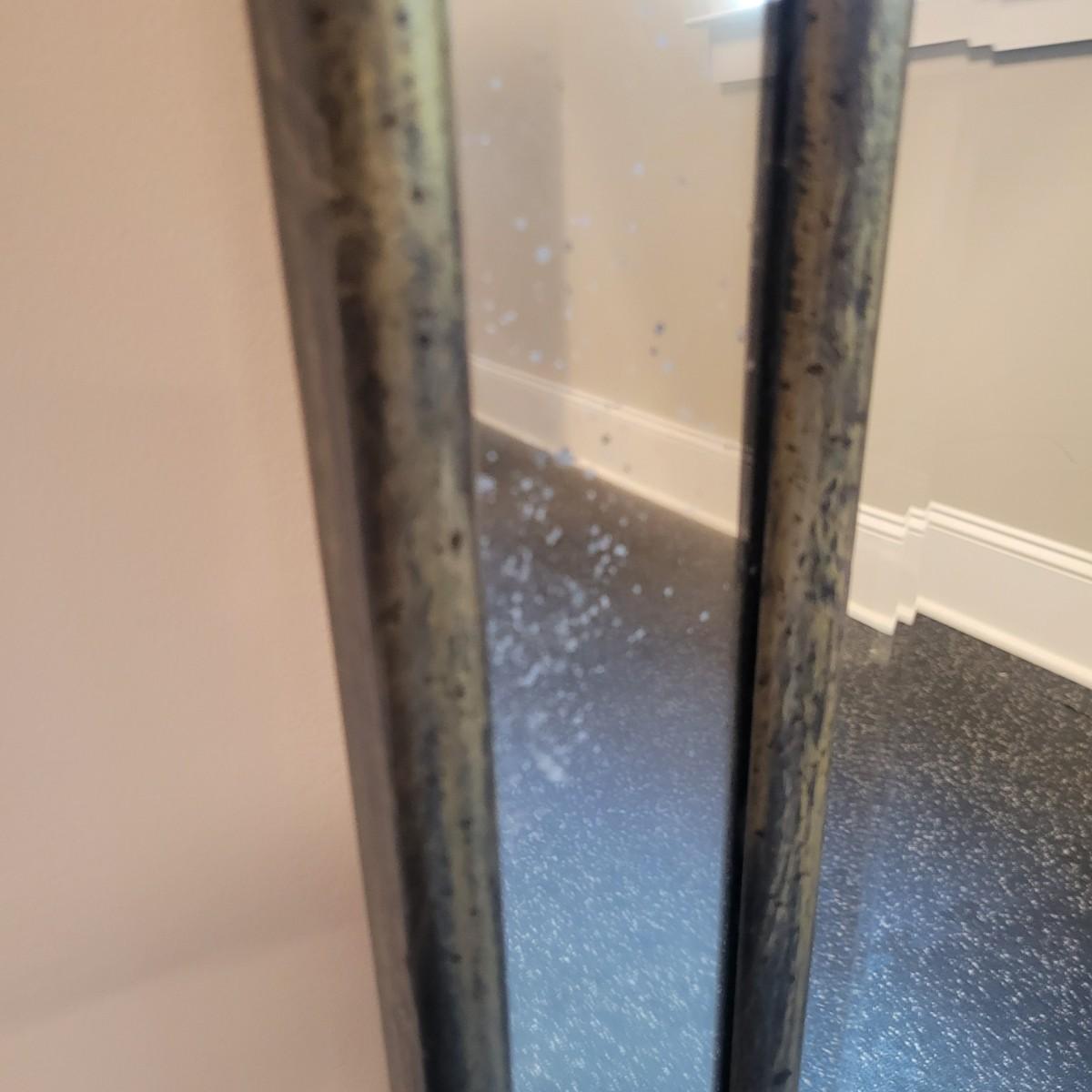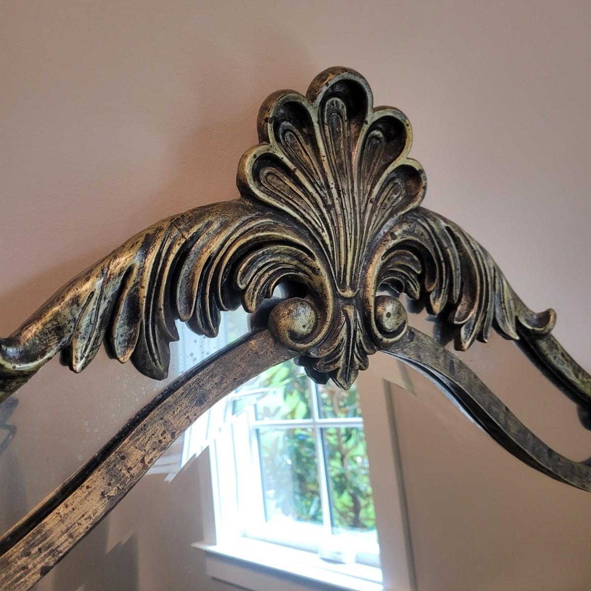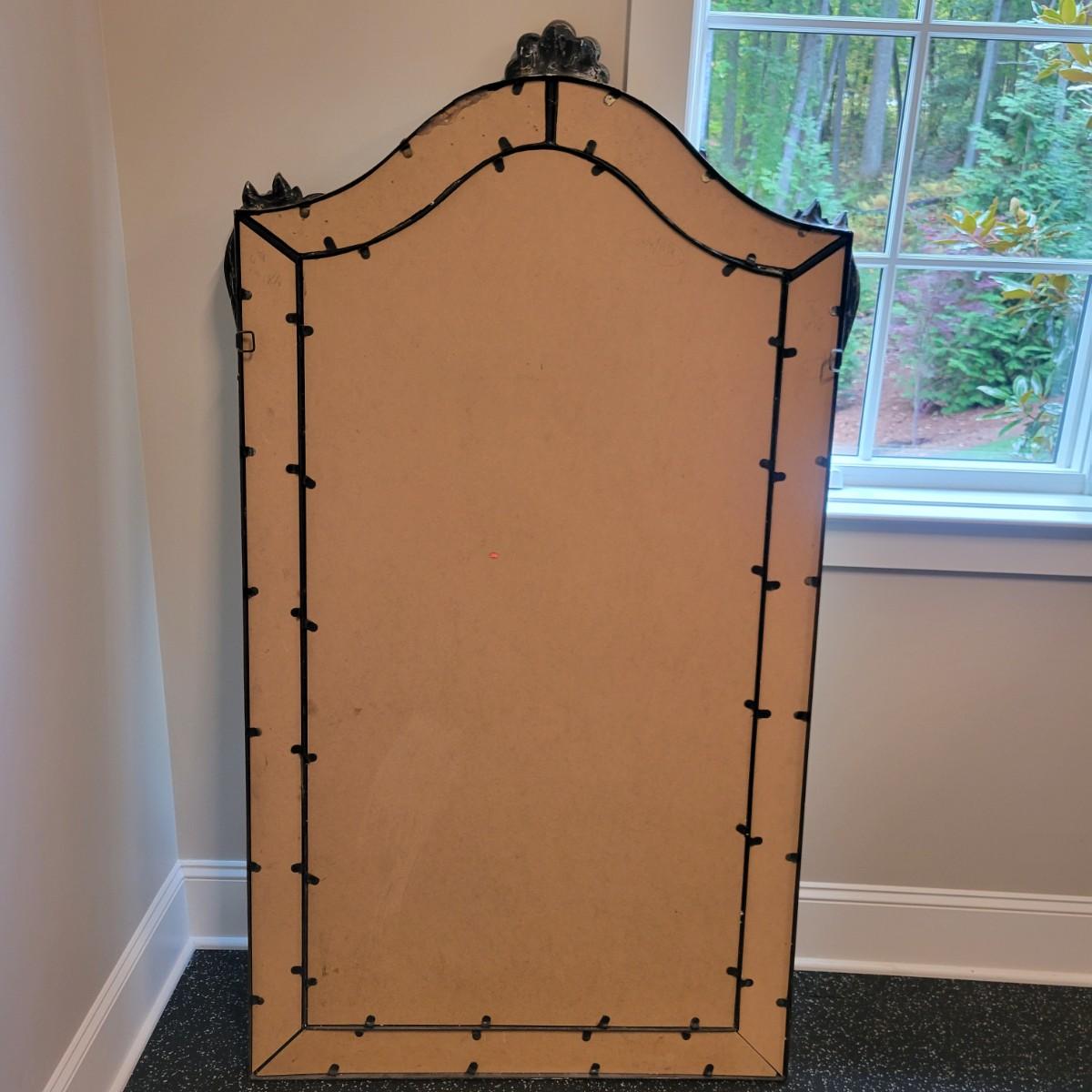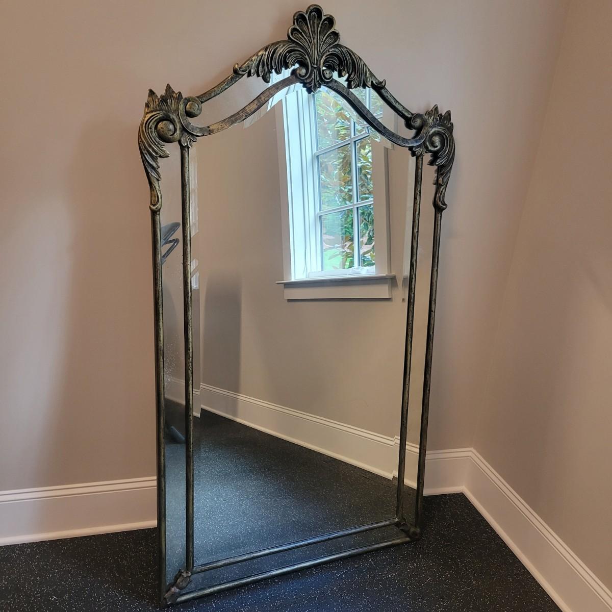 A multi paneled mirror that has a steel frame with what appears to be resin molded ornate accents. It features five mirror panels that surround a central mirror with a 1" bevel. The mirror measures approximately 37.5" x 2" x 65.5"H. There is some spotting on the outer mirror panels, see attached pictures for more detail. Local pickup only. Winning bidder must bring assistance to help move and load this item due to its weight and/or size.