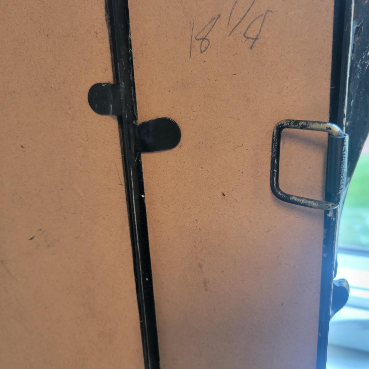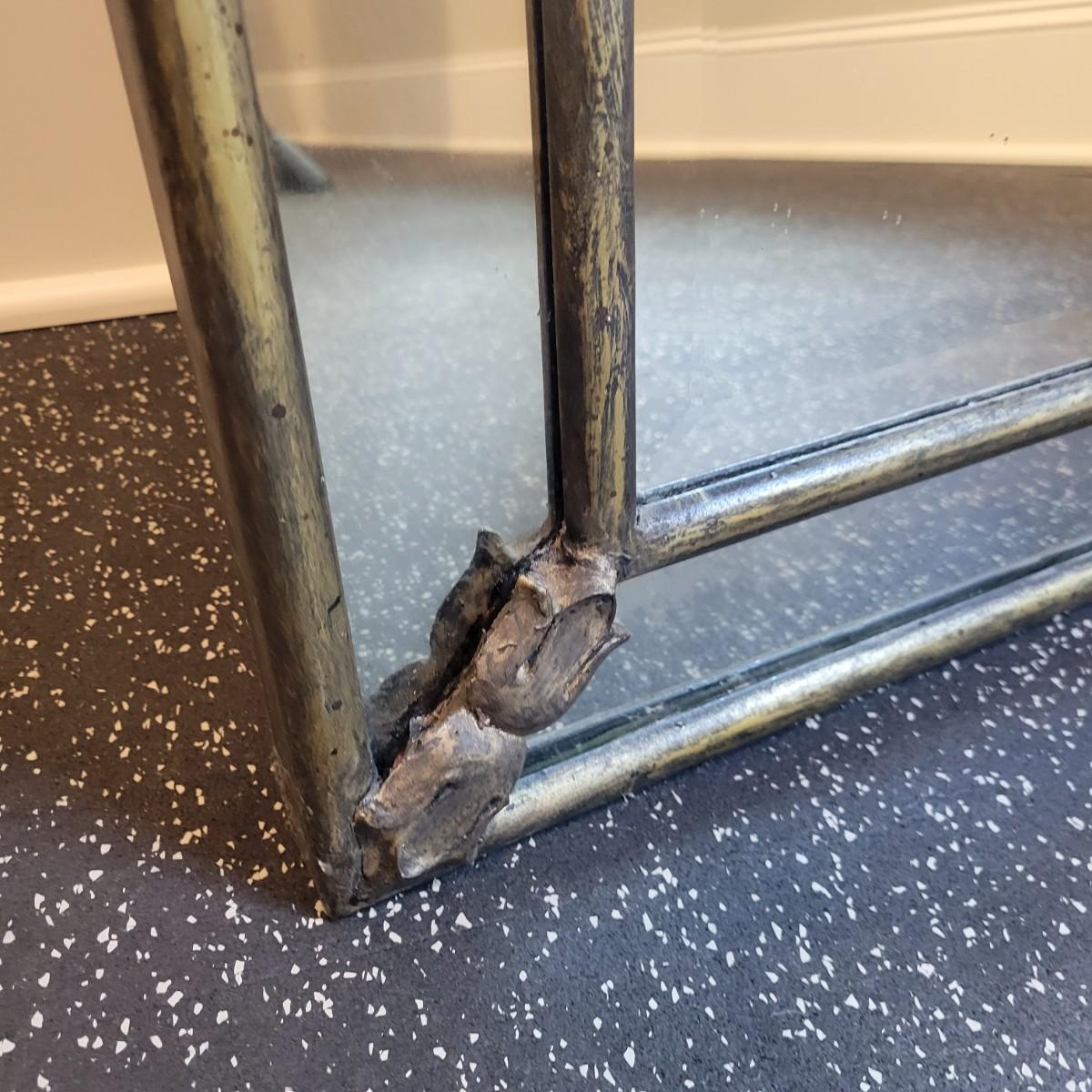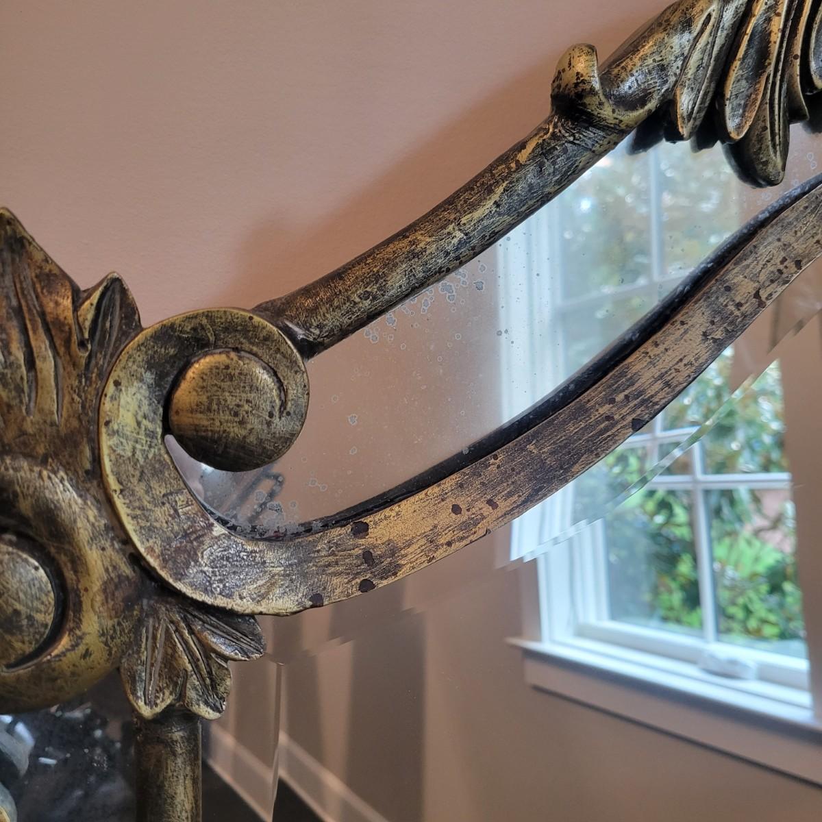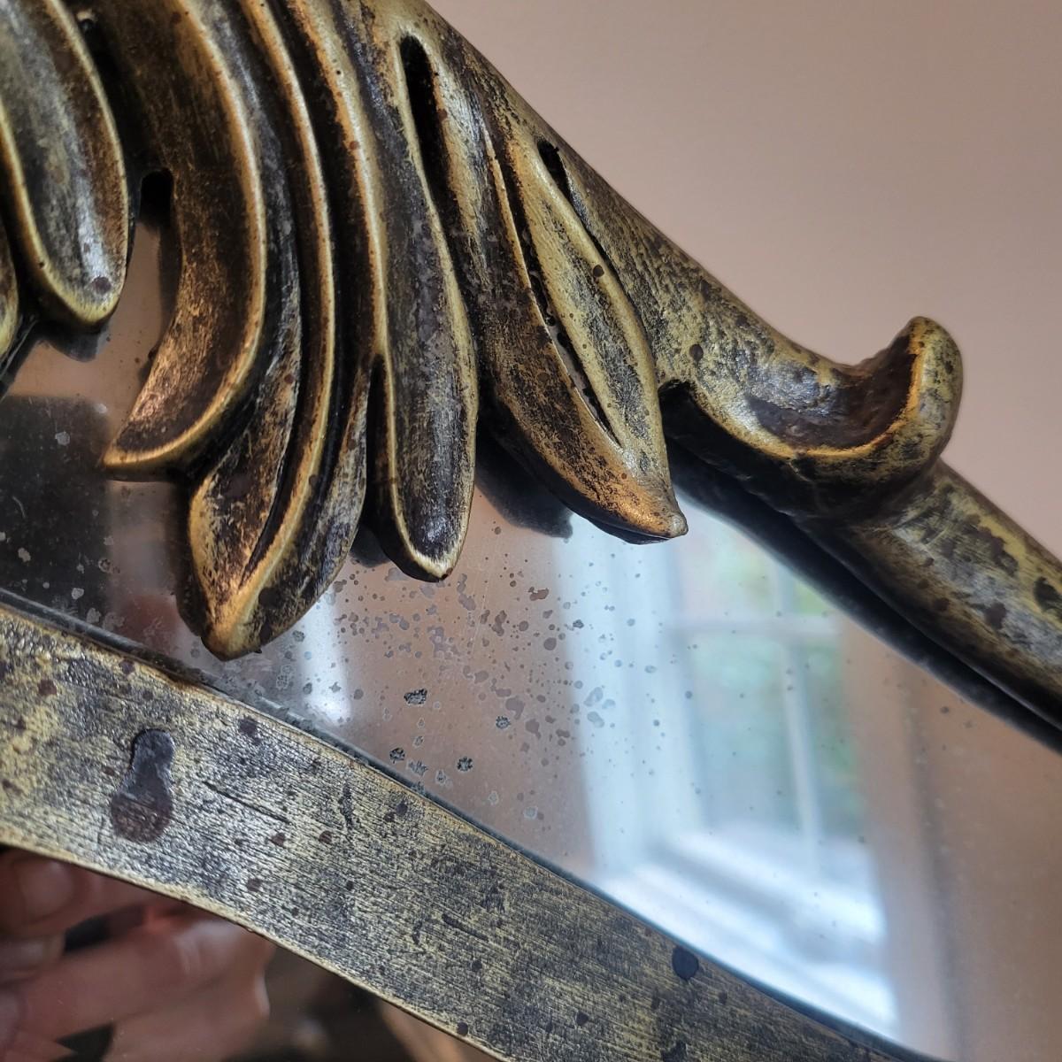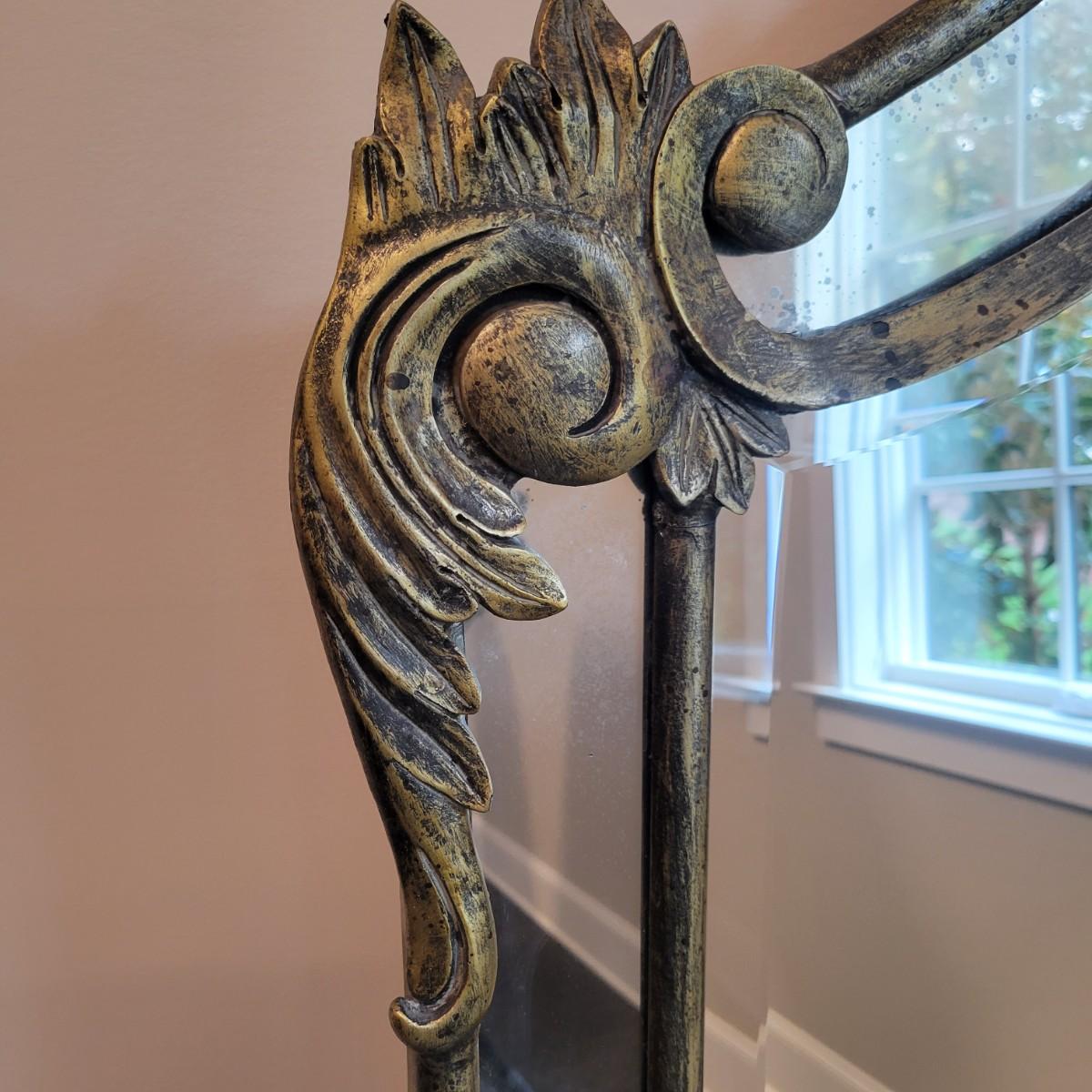 A multi paneled mirror that has a steel frame with what appears to be resin molded ornate accents. It features five mirror panels that surround a central mirror with a 1" bevel. The mirror measures approximately 37.5" x 2" x 65.5"H. There is some spotting on the outer mirror panels, see attached pictures for more detail. Local pickup only. Winning bidder must bring assistance to help move and load this item due to its weight and/or size.