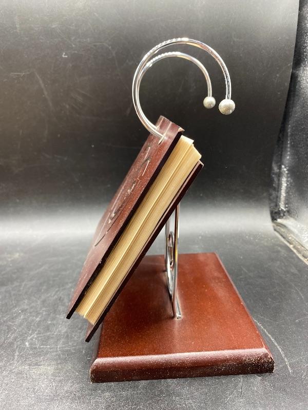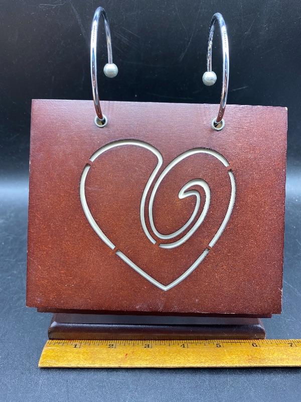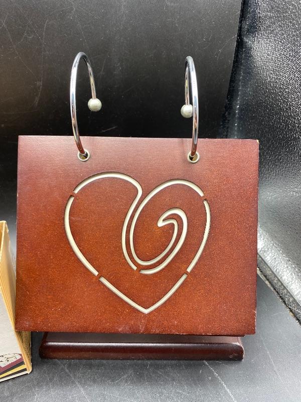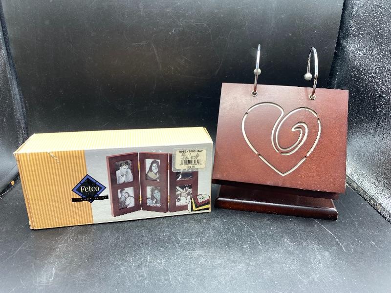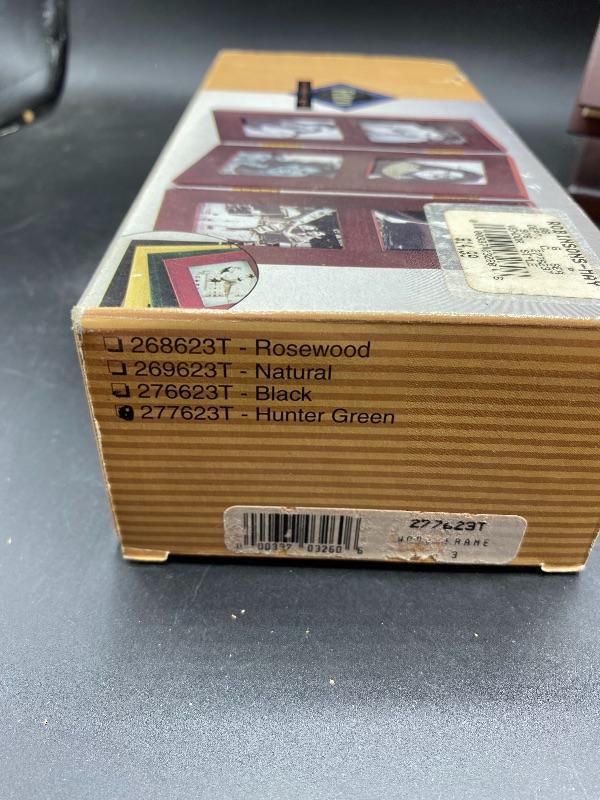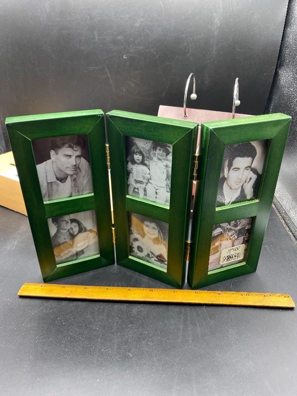 Multi picture folding frame. New in box, green color wood. Photo flip book is on wood stand. Good condition.