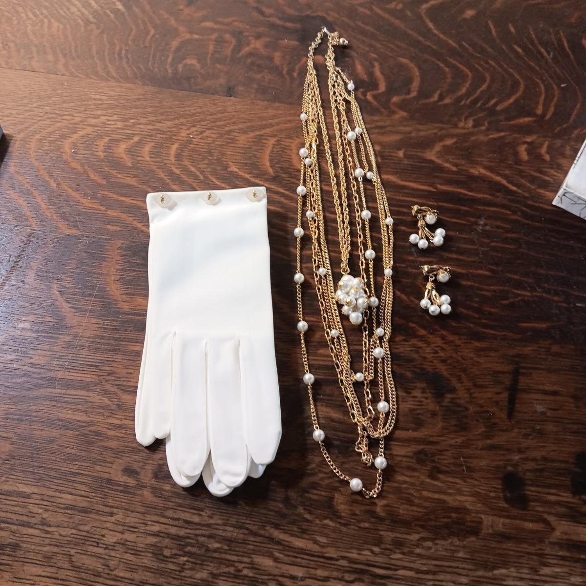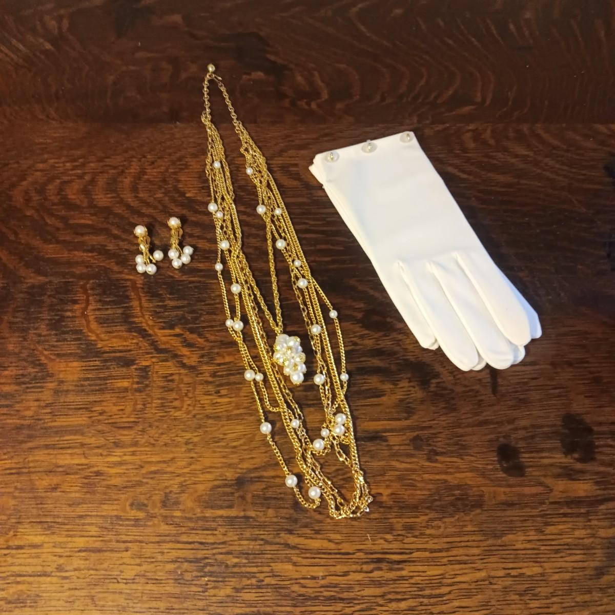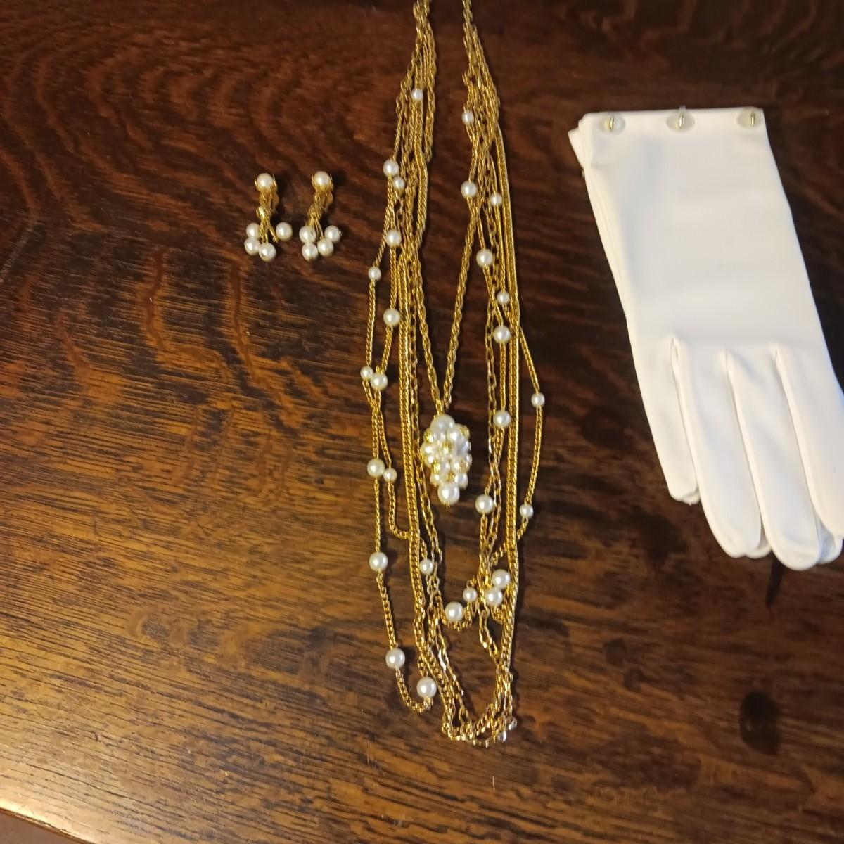 MULTI STRAND GOLD TONE NECKLACE & EARRINGS W/FAUX PEARLS PLUS DRESS GLOVES