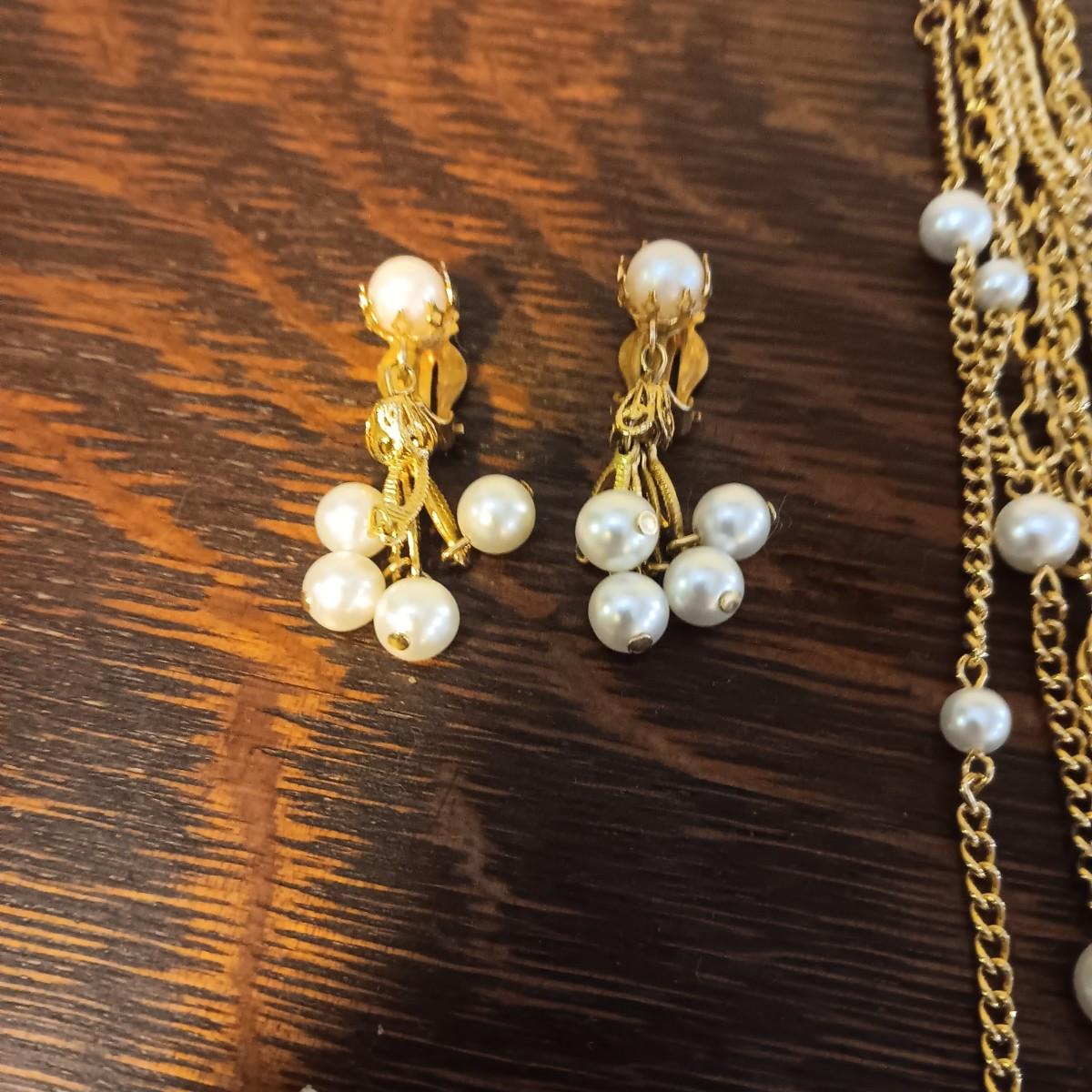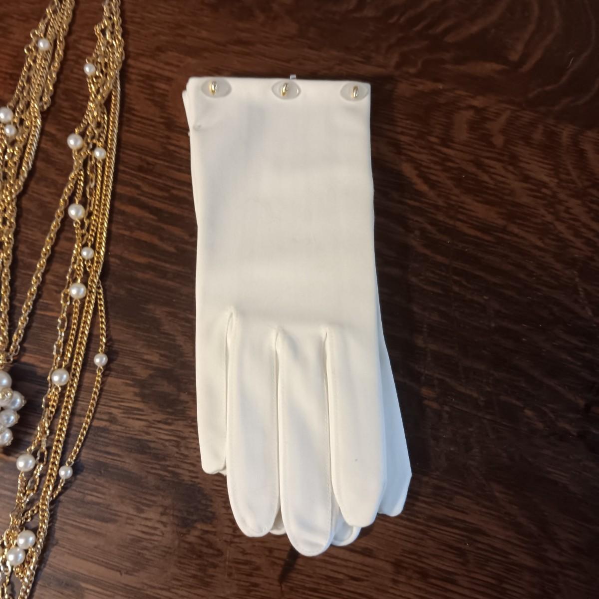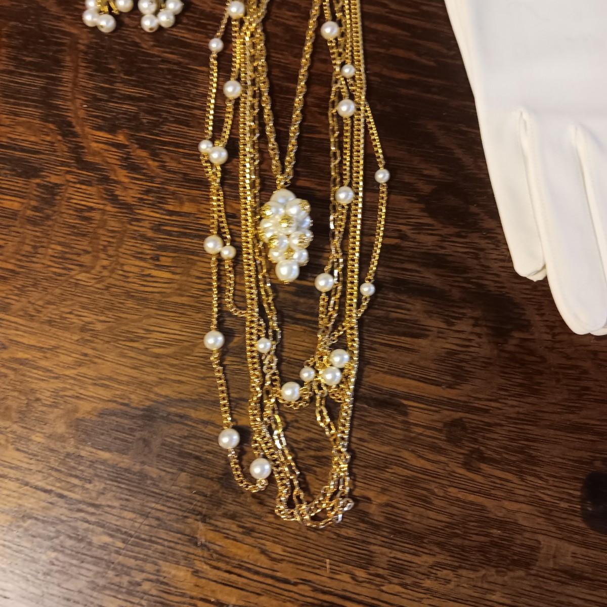 MULTI STRAND GOLD TONE NECKLACE & EARRINGS W/FAUX PEARLS PLUS DRESS GLOVES