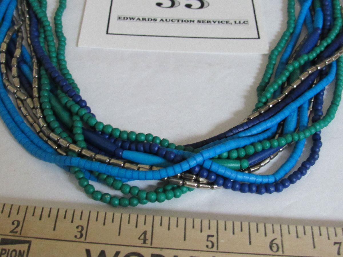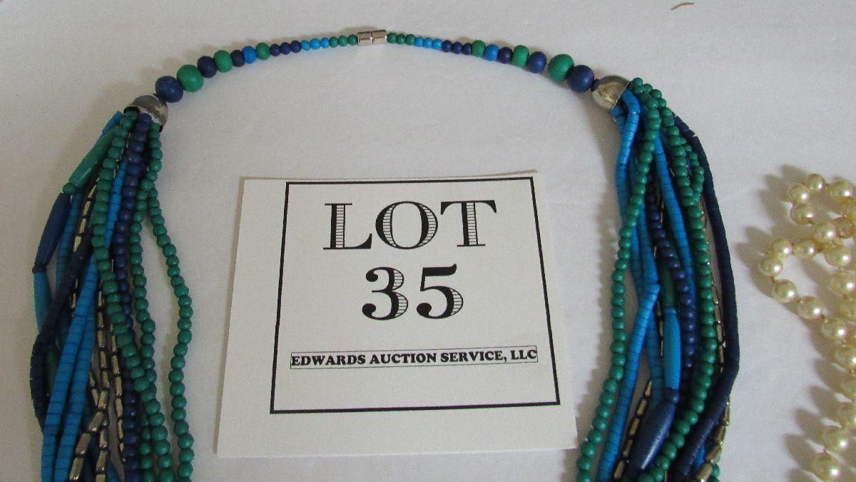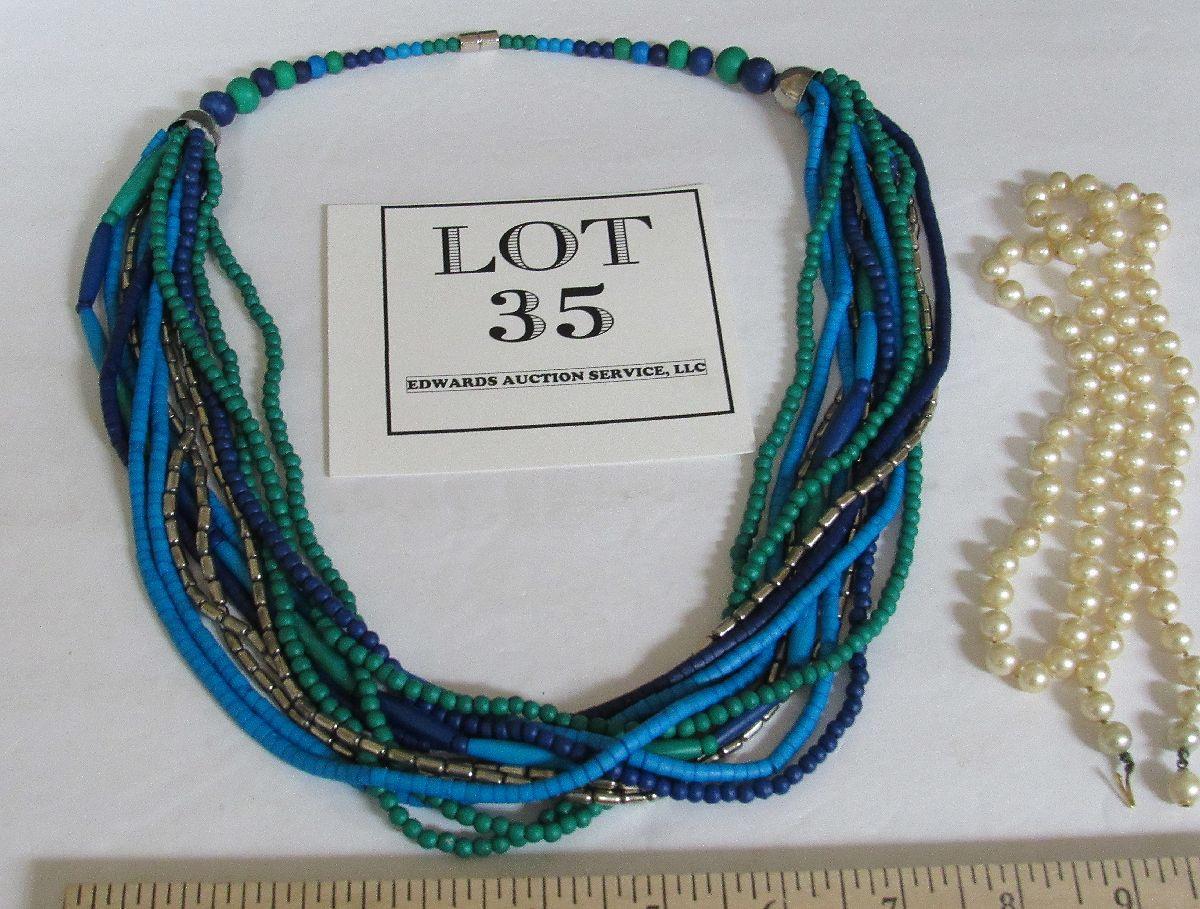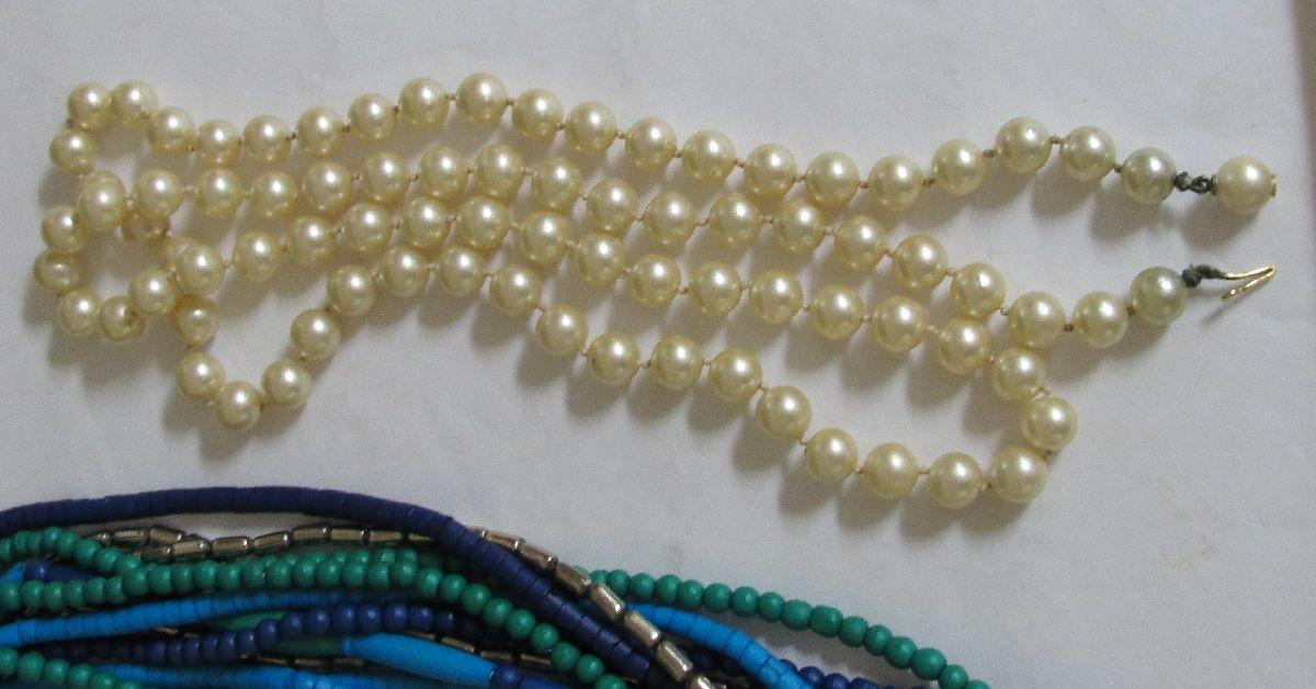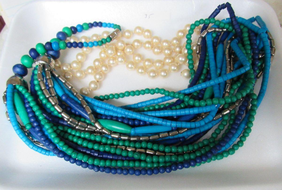 The blue necklace is very attractive and unusual. Not sure what the beads are made of. The faux pearl necklace ends need to be cleaned. Appears to be in good shape. We did not check the stones for looseness or chips. Shipping is available at shipping cost plus $5.00 handling fee on one box, $10.00 handling fee on two boxes, $15.00 handling fee on 3 boxes. Helps cover shipping materials and labor cost.