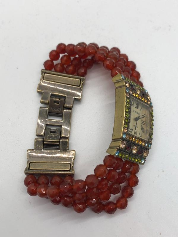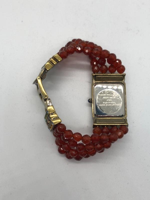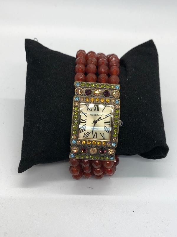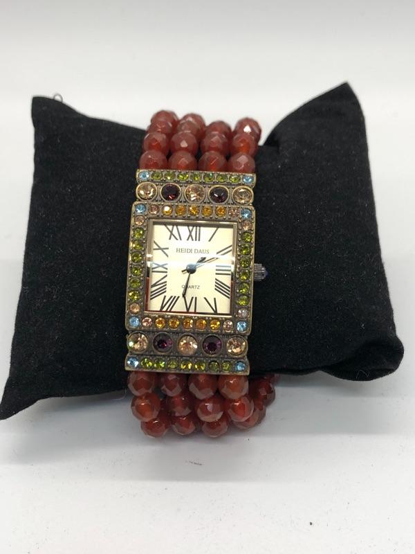 Heidi Daus multi strand beaded watch. Red faceted beads, gold tone metal. Jewel tone Swarovski crystals around the face. Extra link to adjust the size. All together measures 8".