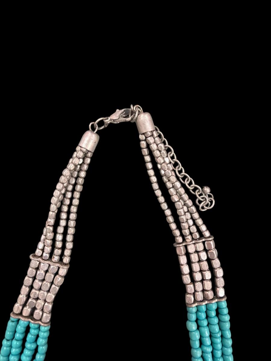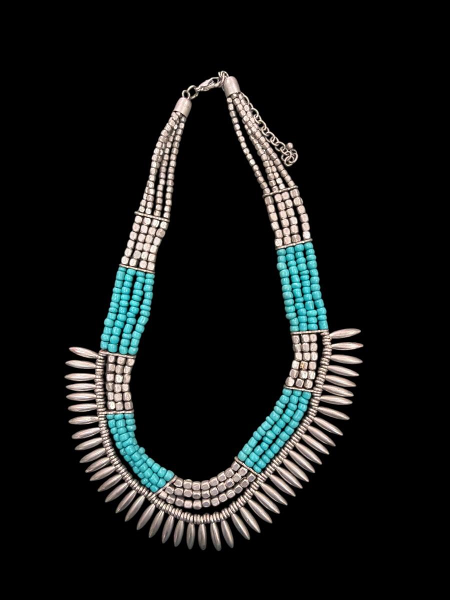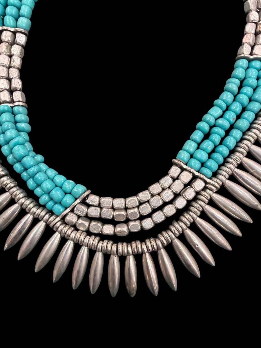 Multi Strand Turquoise and Silver toned Statement Necklace with Spike Metal Beads