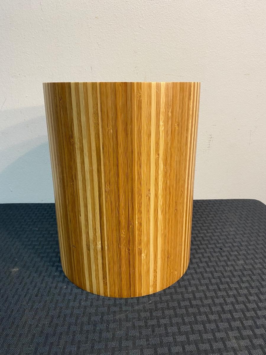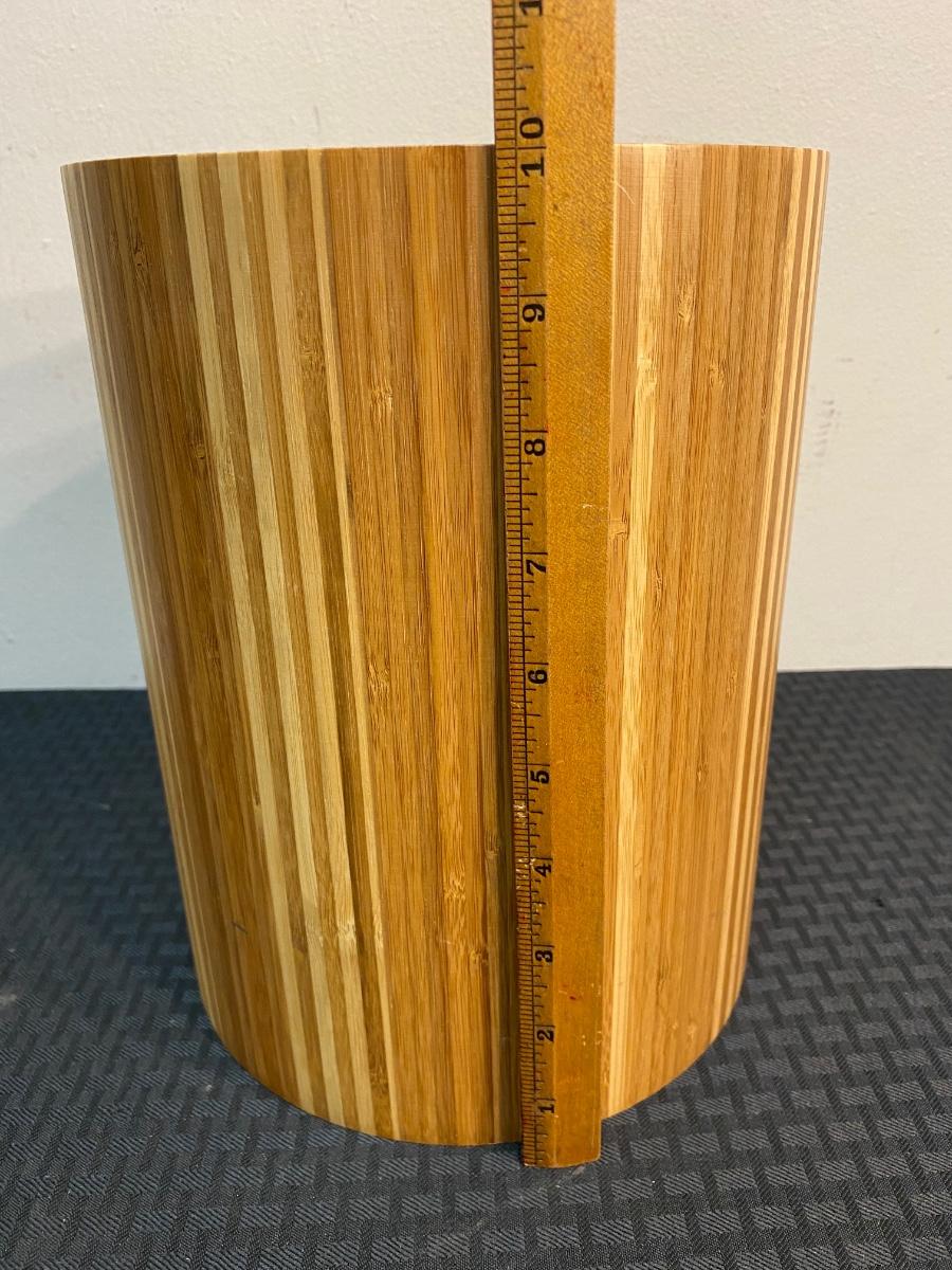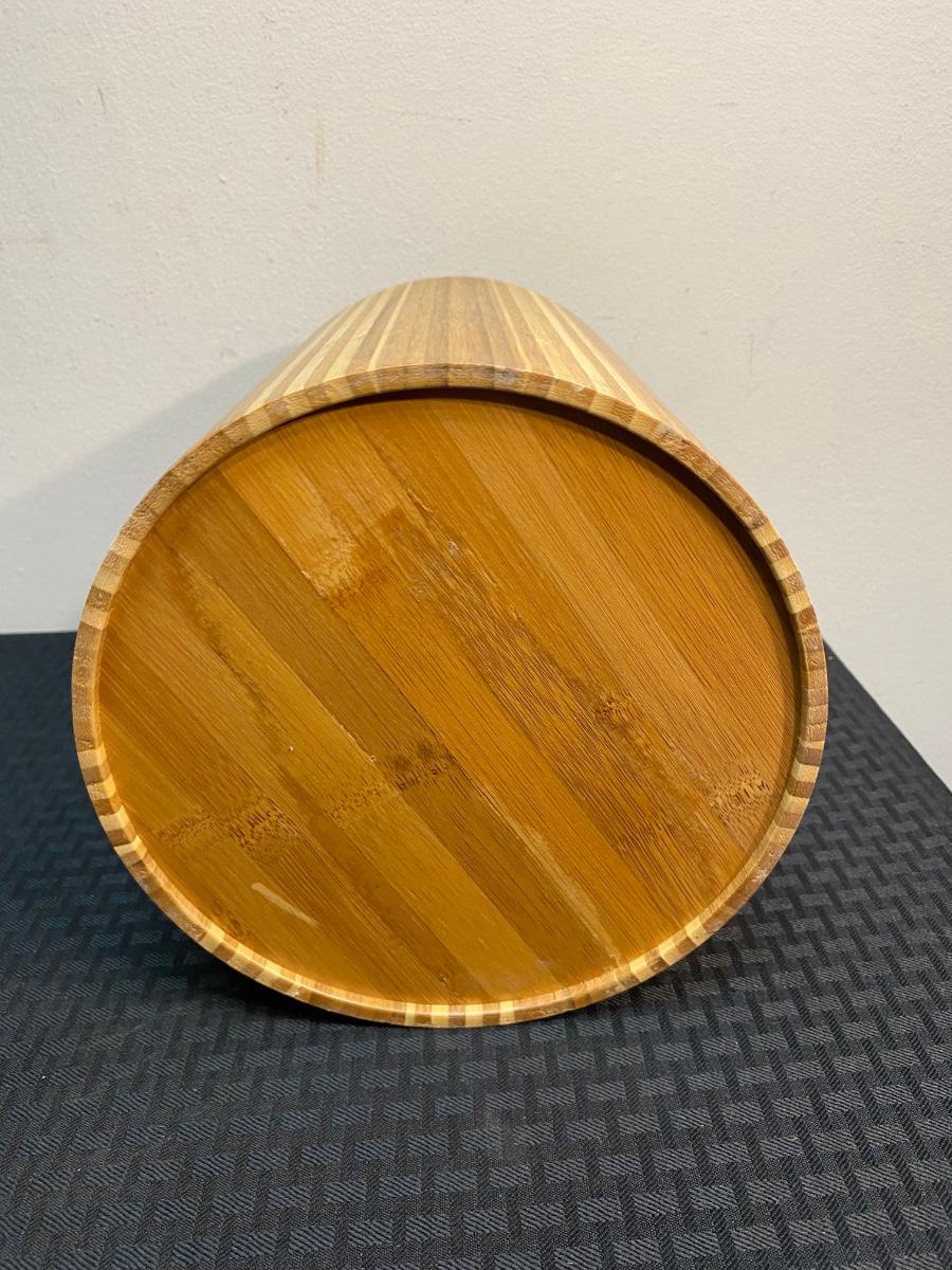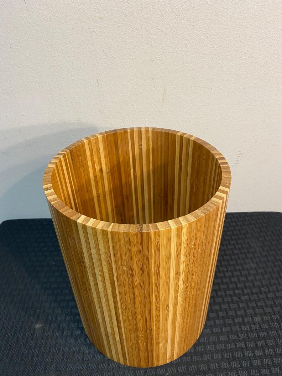 Solid wood small trash can. Multi tone finish gives a striped look to it. In good condition. Perfect for office, vanity, or bathroom.