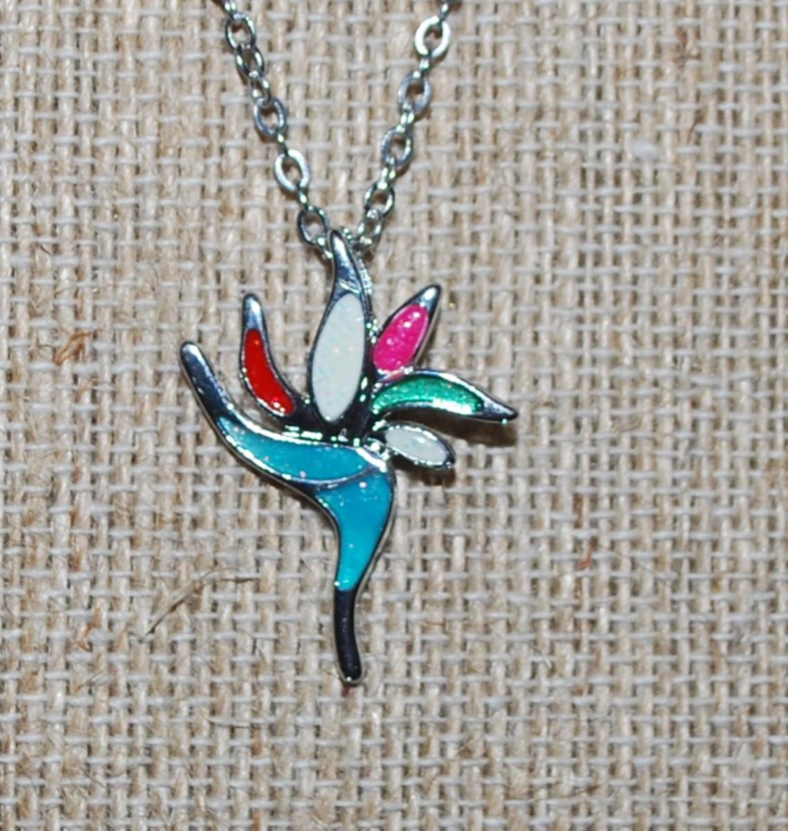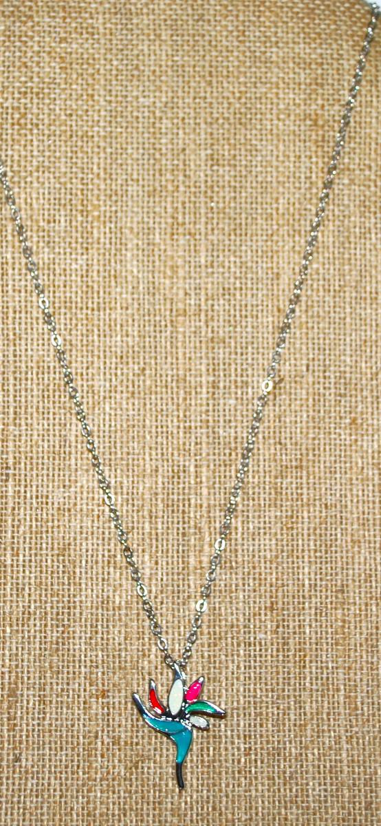 Multicolor Enameled Flower Blossom Marked .925 PENDANT (1" x ¾") on a Silver Tone Necklace Chain 16" L