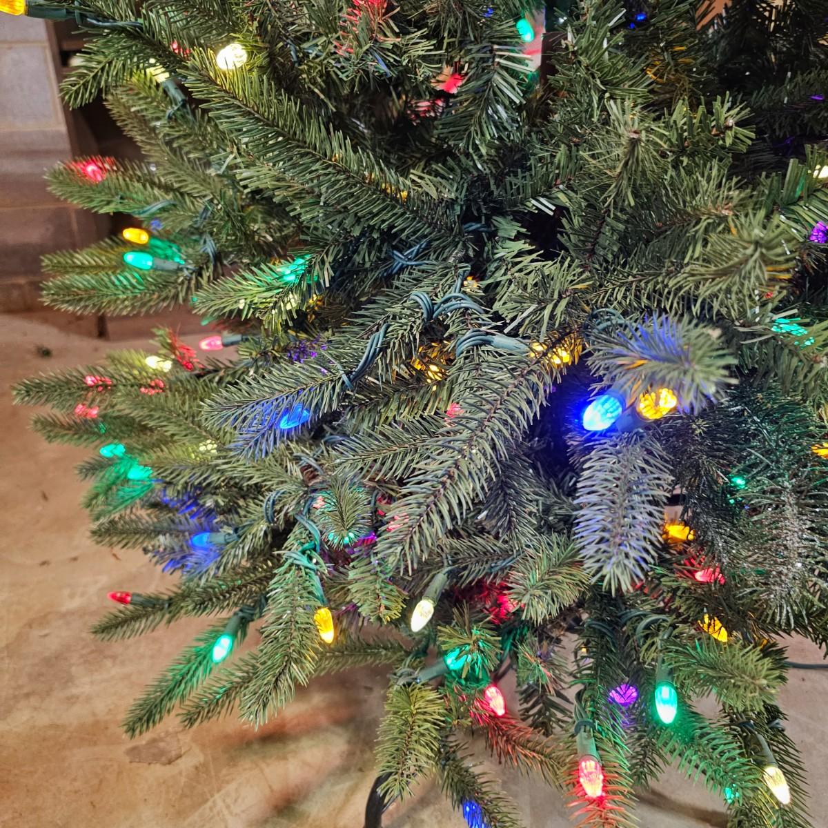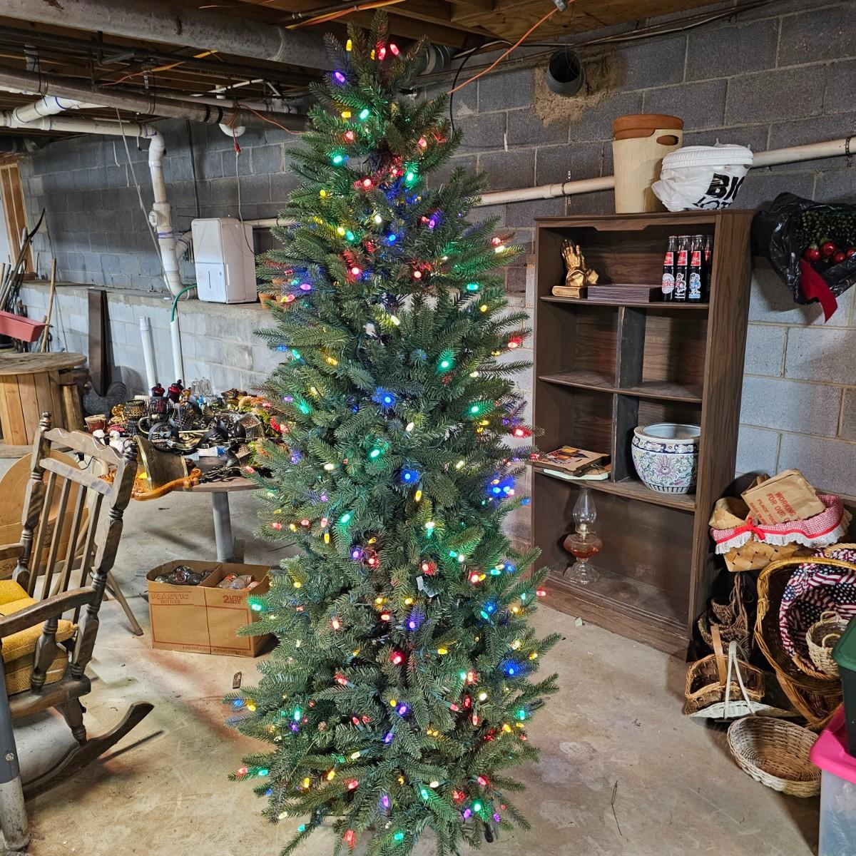 Slender artificial Christmas tree with LED lights and on/off foot switch cord. Tree is 36"D x 72"H. Includes instruction sheet and extra bulbs, stand. See photos for details. Local pickup only.
