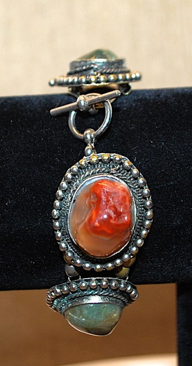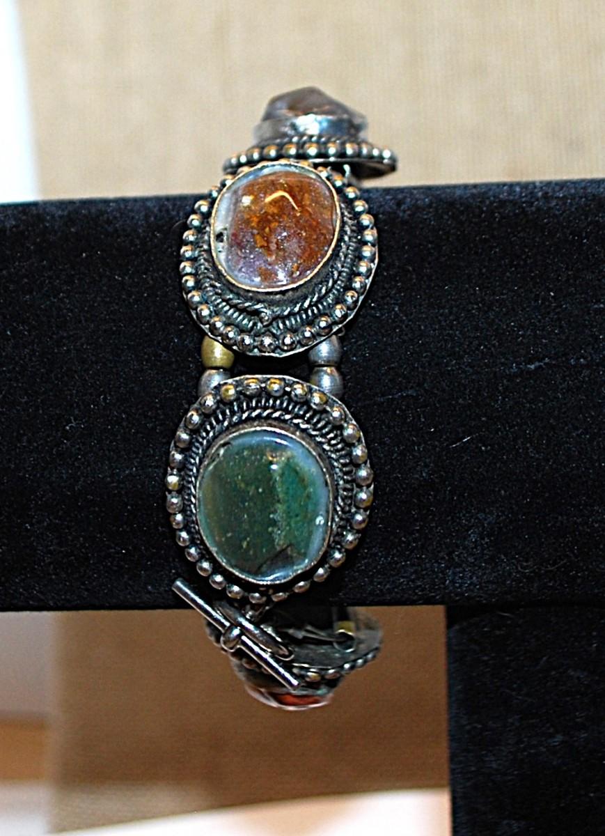 Multi-Colored AGATE STONE BRACELET (2½" Opening) with Metal Globes Oval Surround and a Toggle Clasp