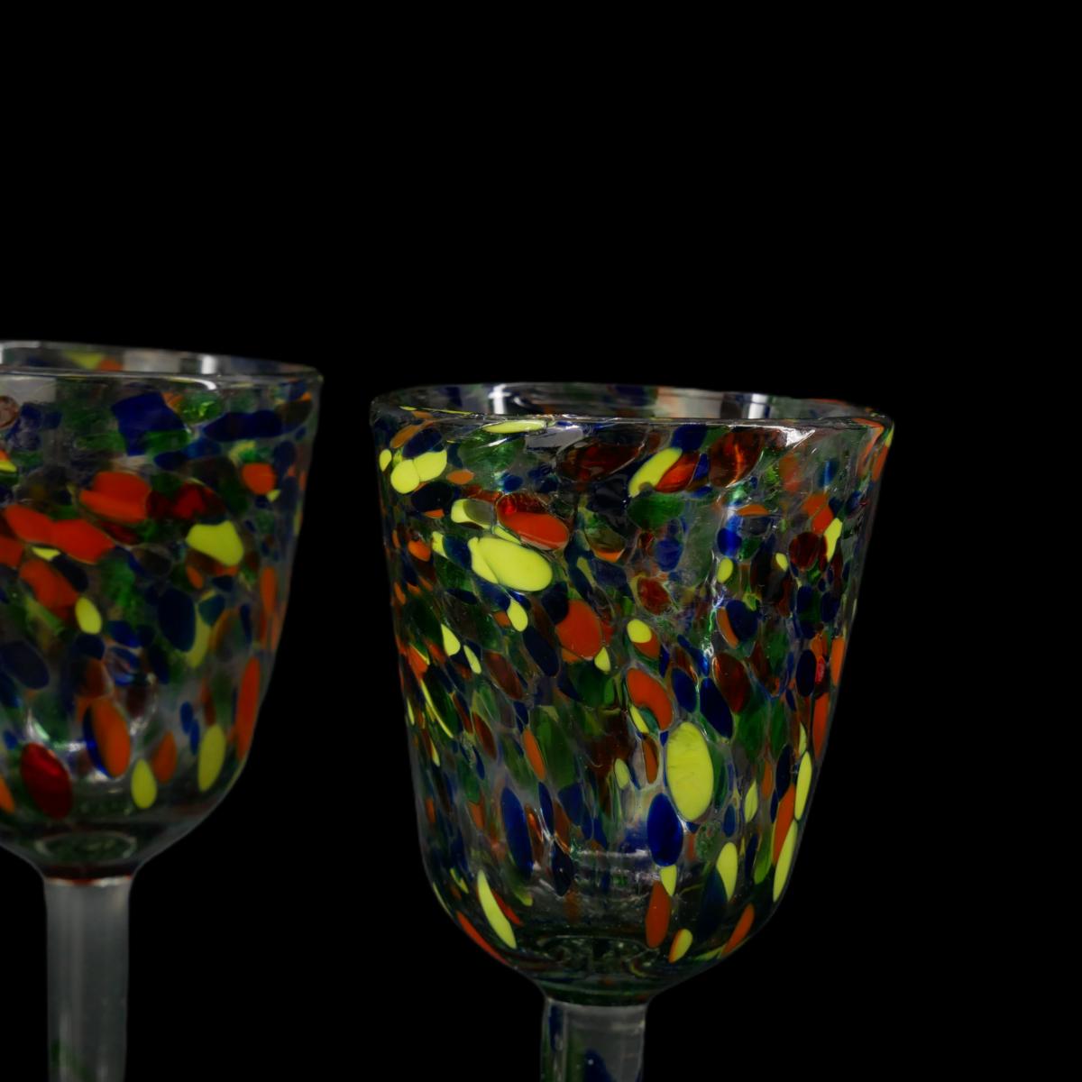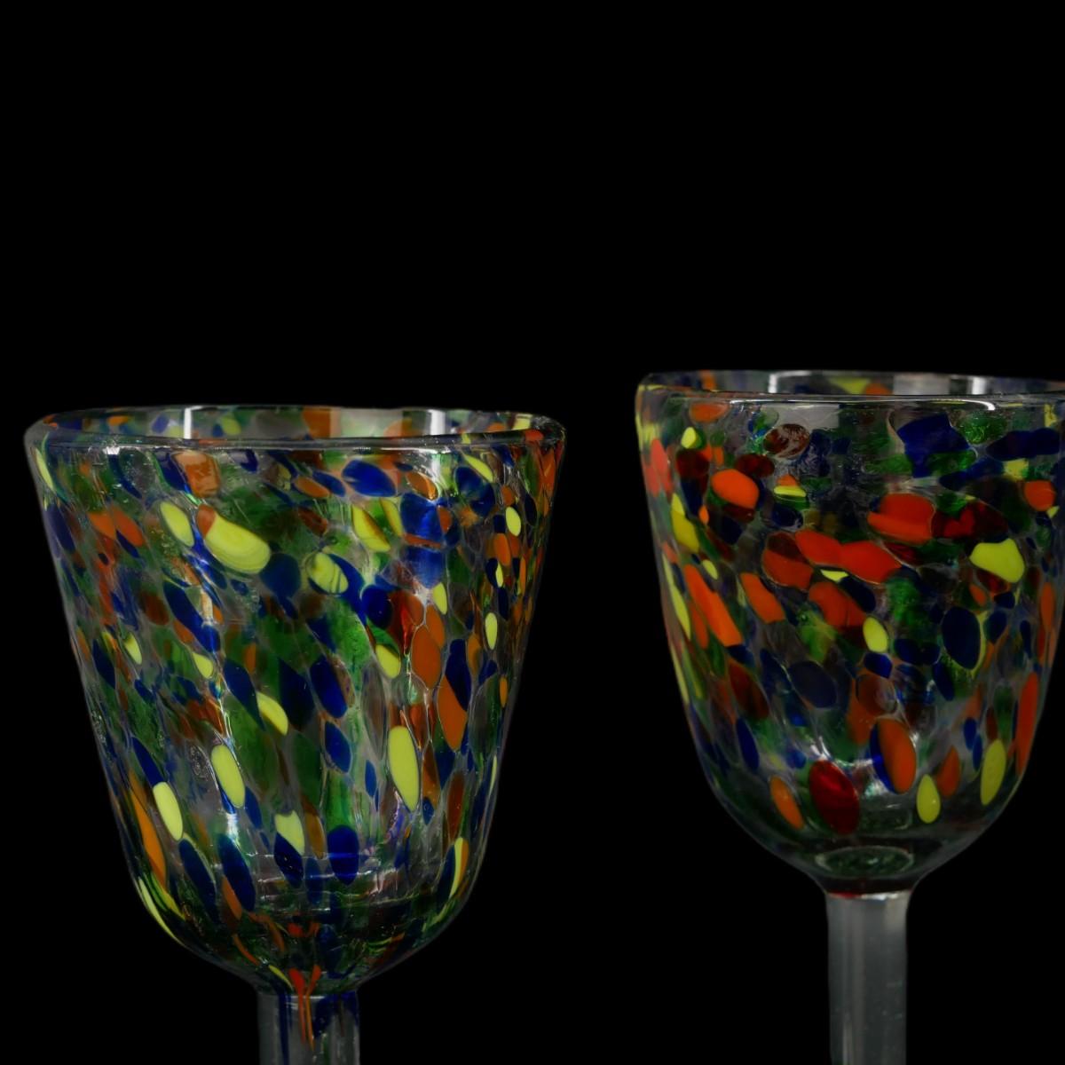 Three hand blown and handmade multicolored confetti design artisan water glasses. All in excellent condition, no visible issues. Each is unique and one of a kind! Multiple bubbles found which is typical in handmade glass. Each measures approximately L 3.25" x H 7". Weight of lot is 2 lb 4 oz. (G2)